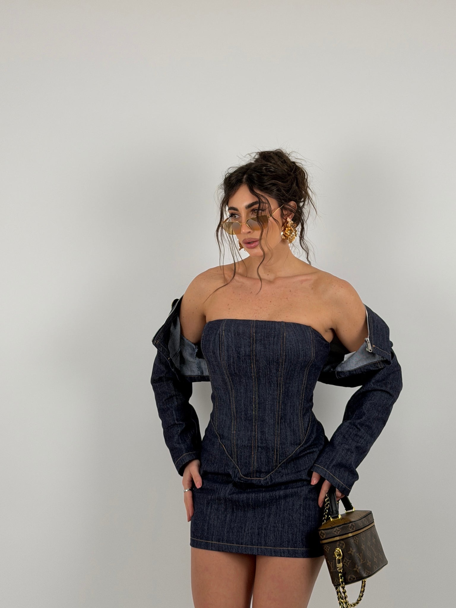 Completo denim scuro, vestito tubino e giacca crop