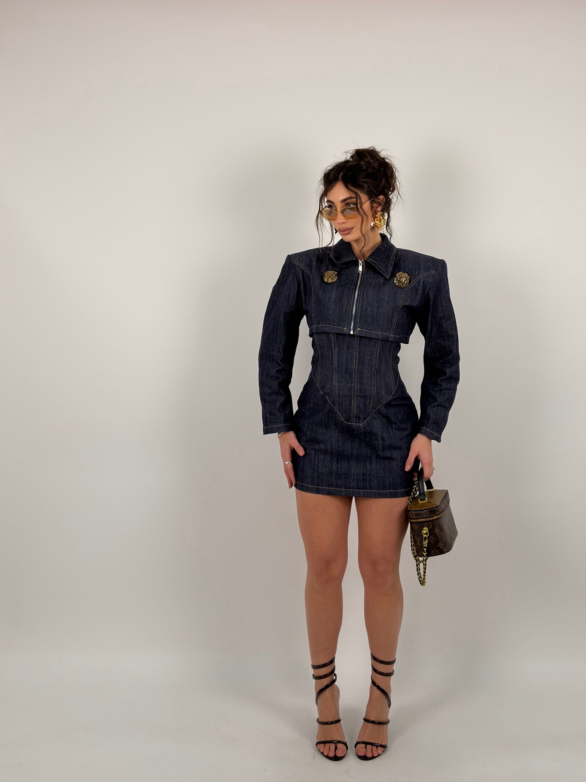 Completo due pezzi di jeans tessuto fermo, giacca crop con zip e bottoni gioiello sul davanti, colletto a camicia, vestito scollo a fascia zip sul retro, cuciture in evidenza.