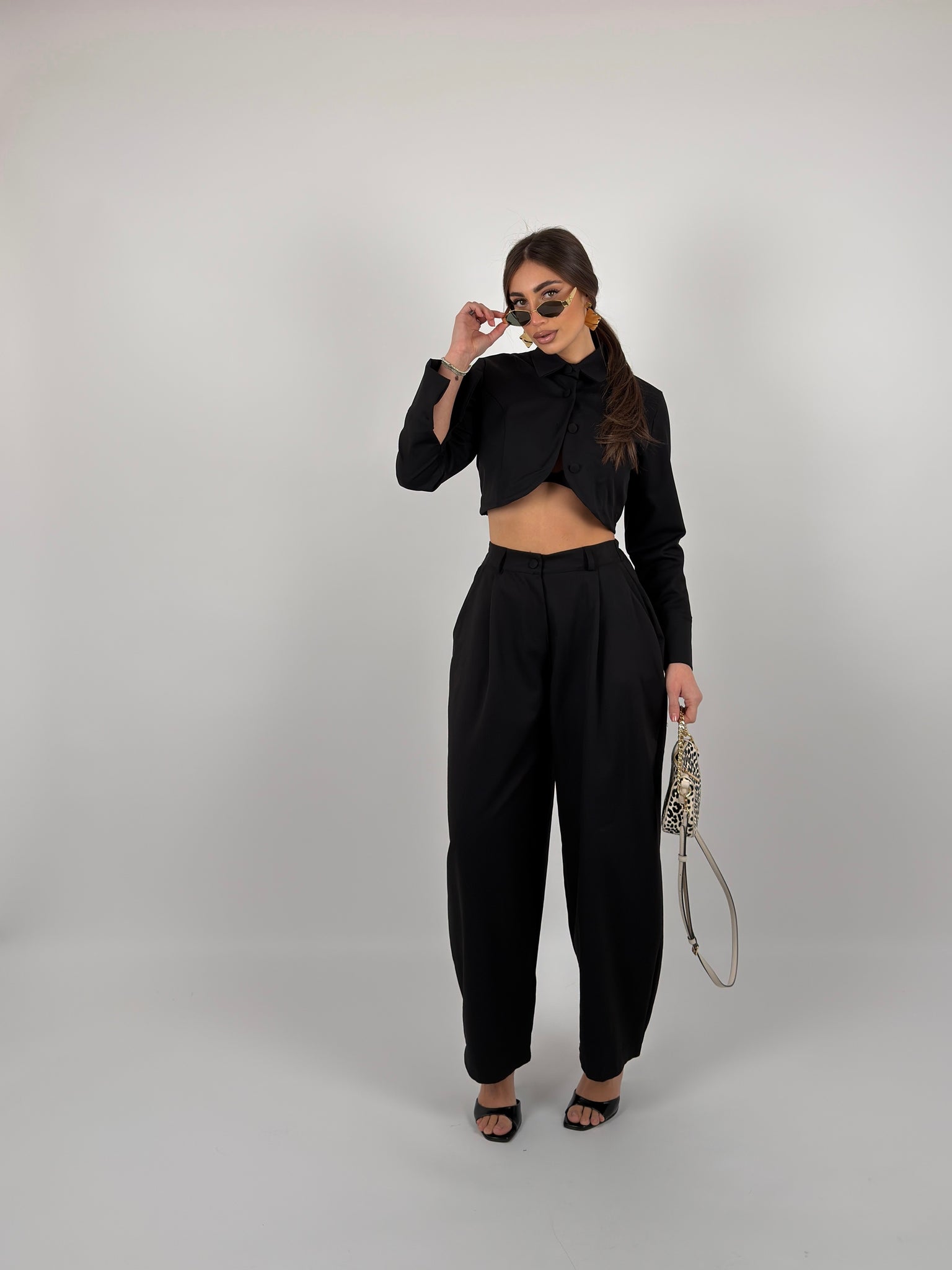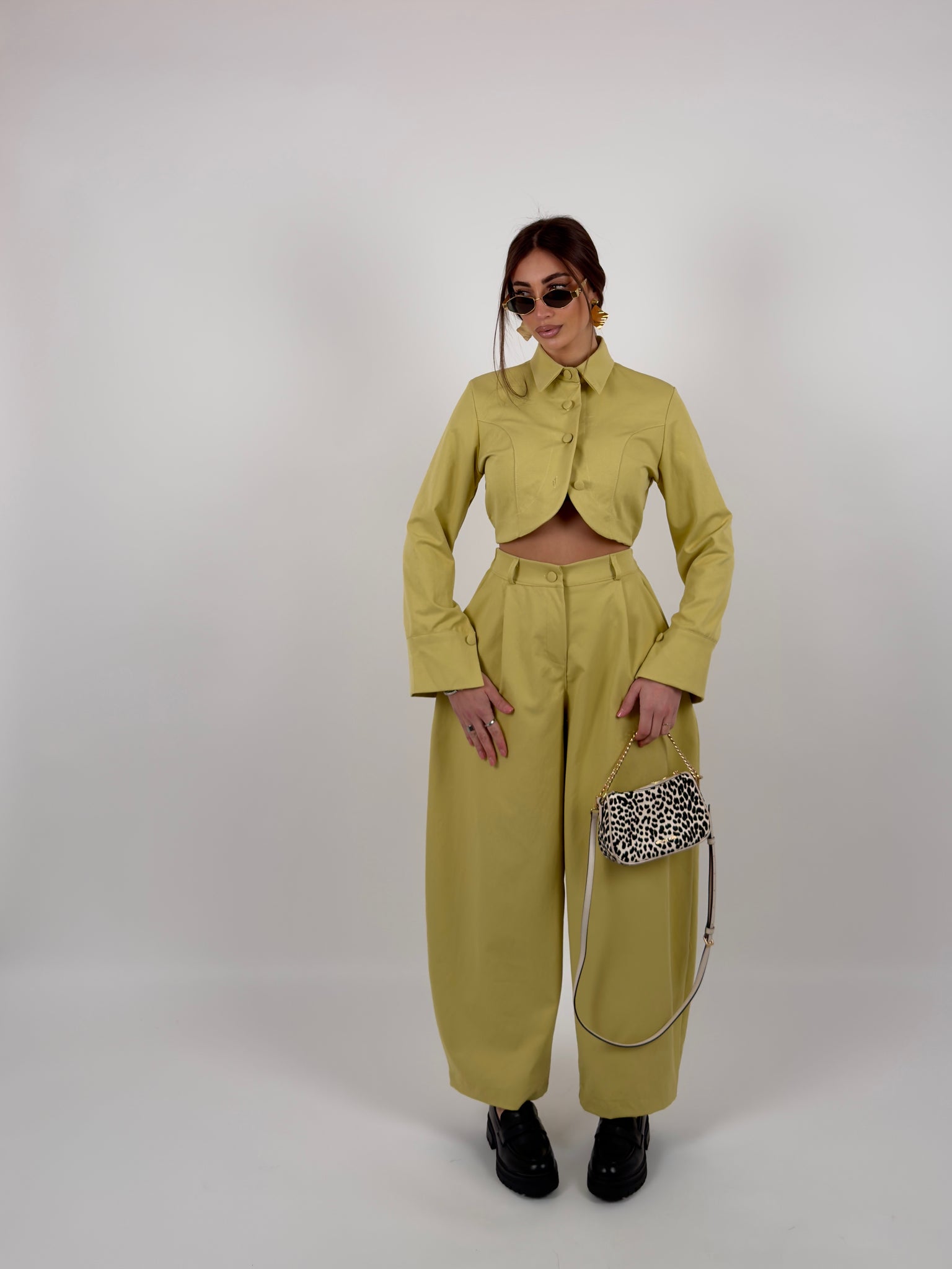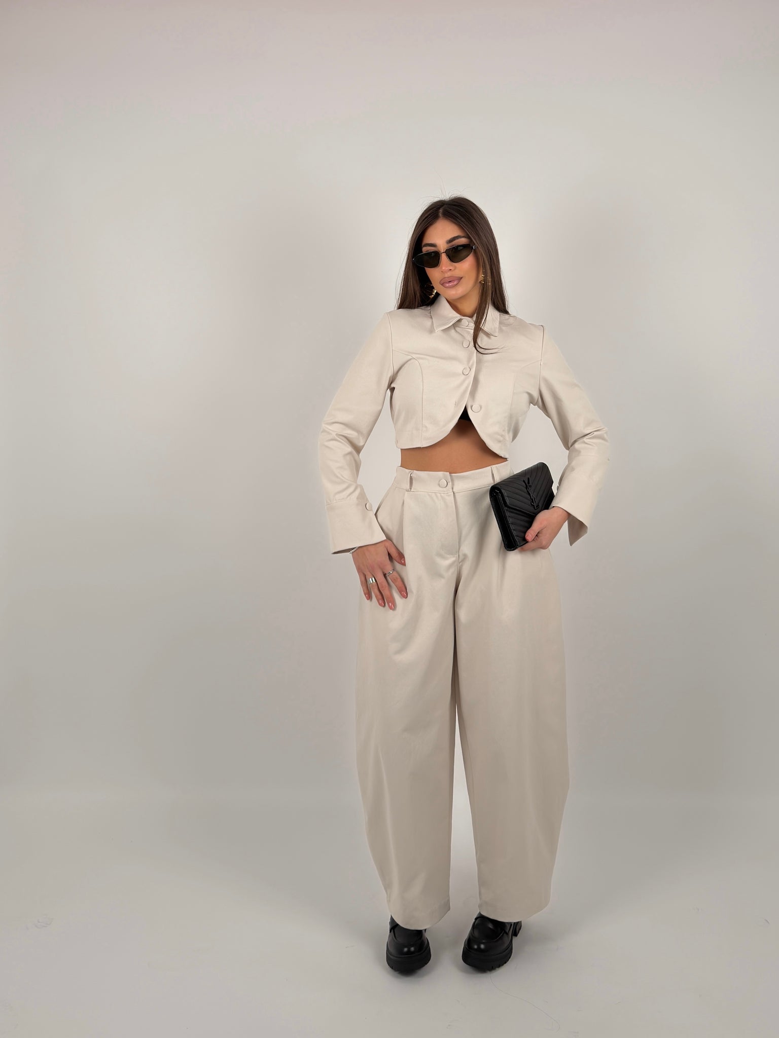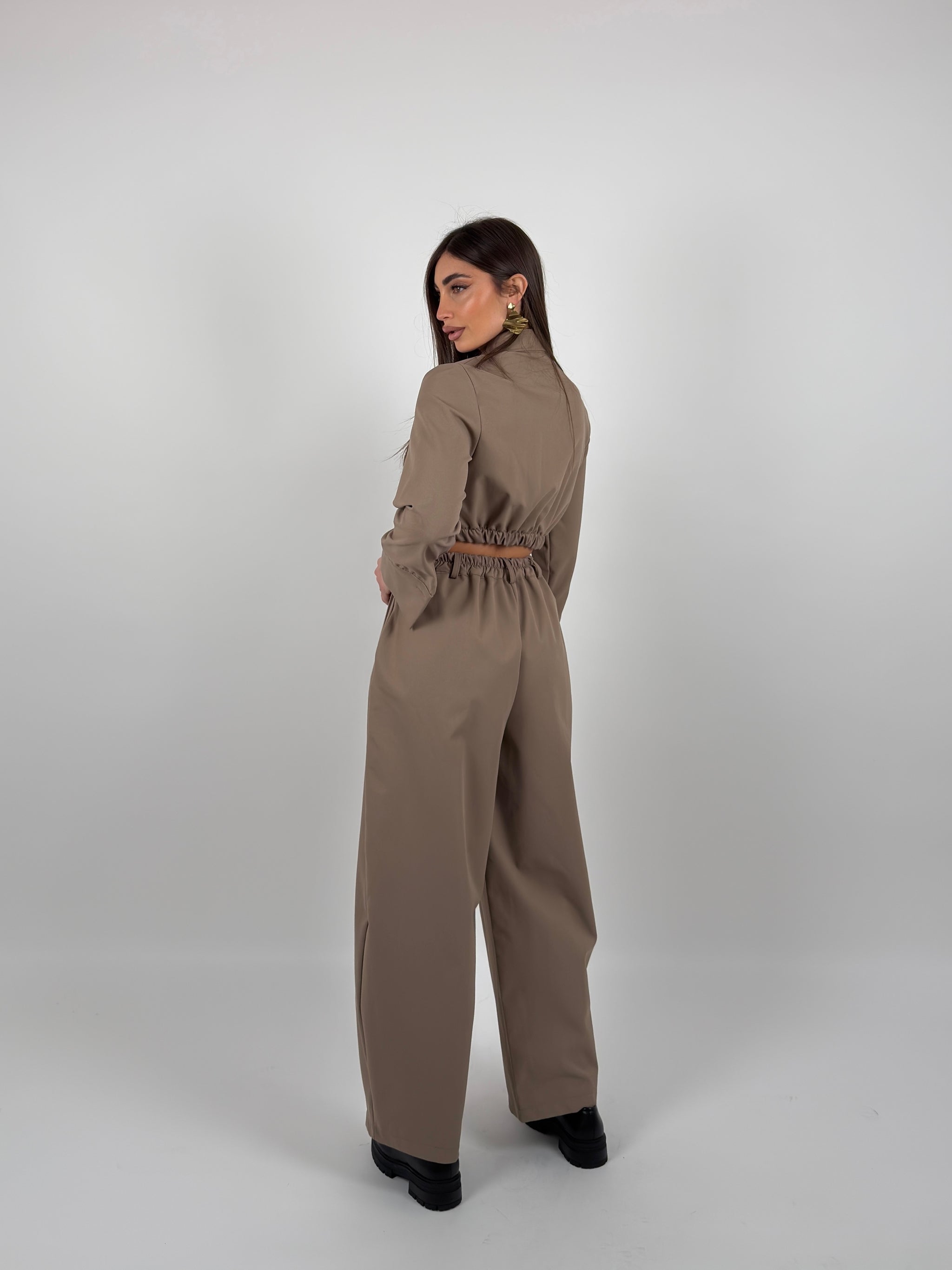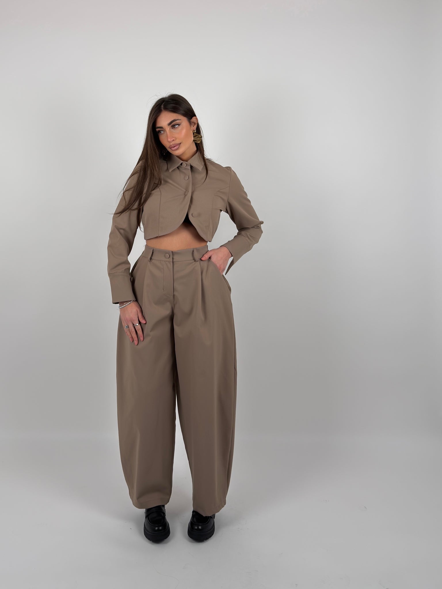 Completo di tessuto composto  da giacca crop colletto a camicia, bottoni sul davanti ed elastico sul retro, pantalone modello ballon con elastico sul retro.