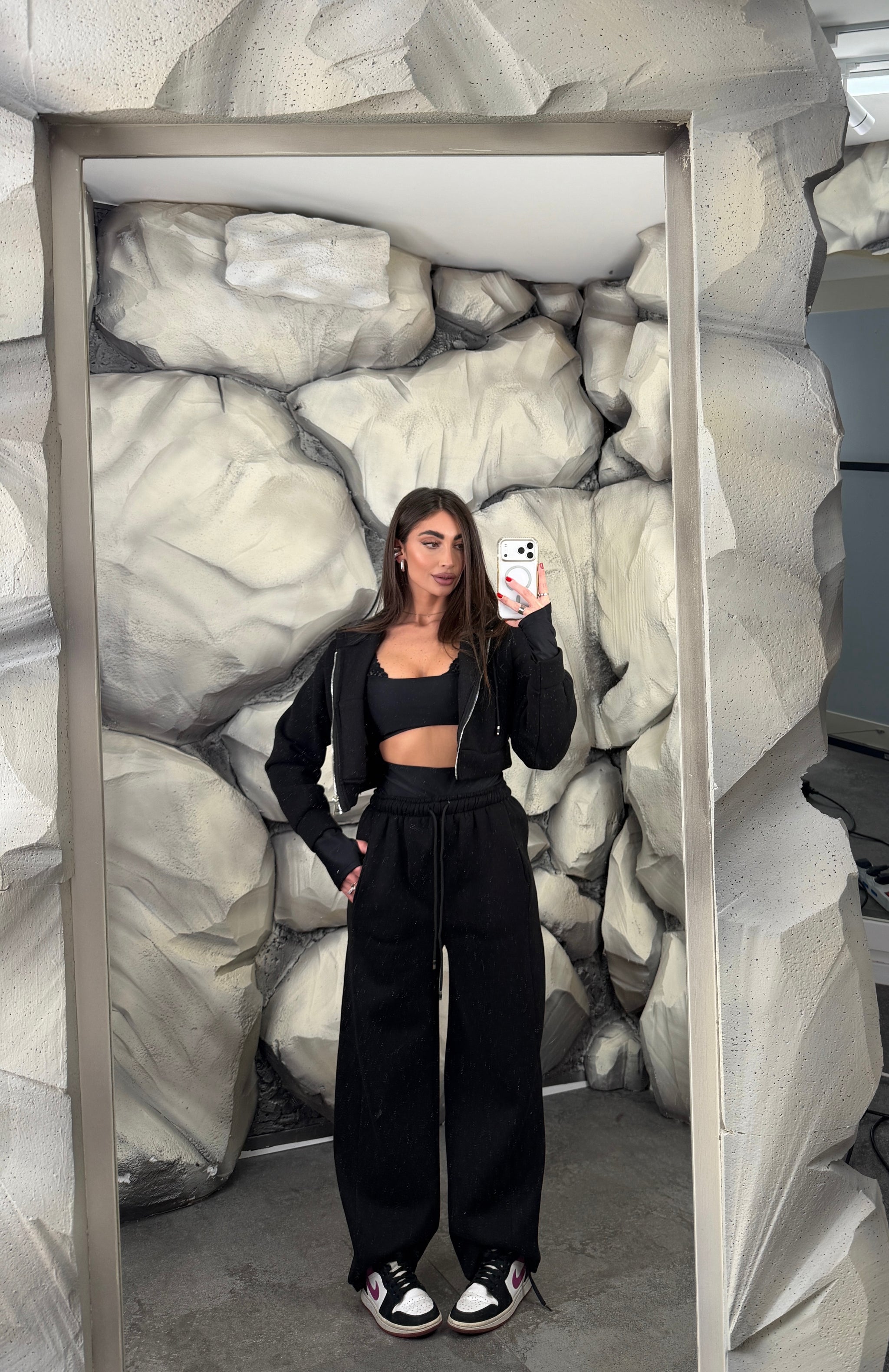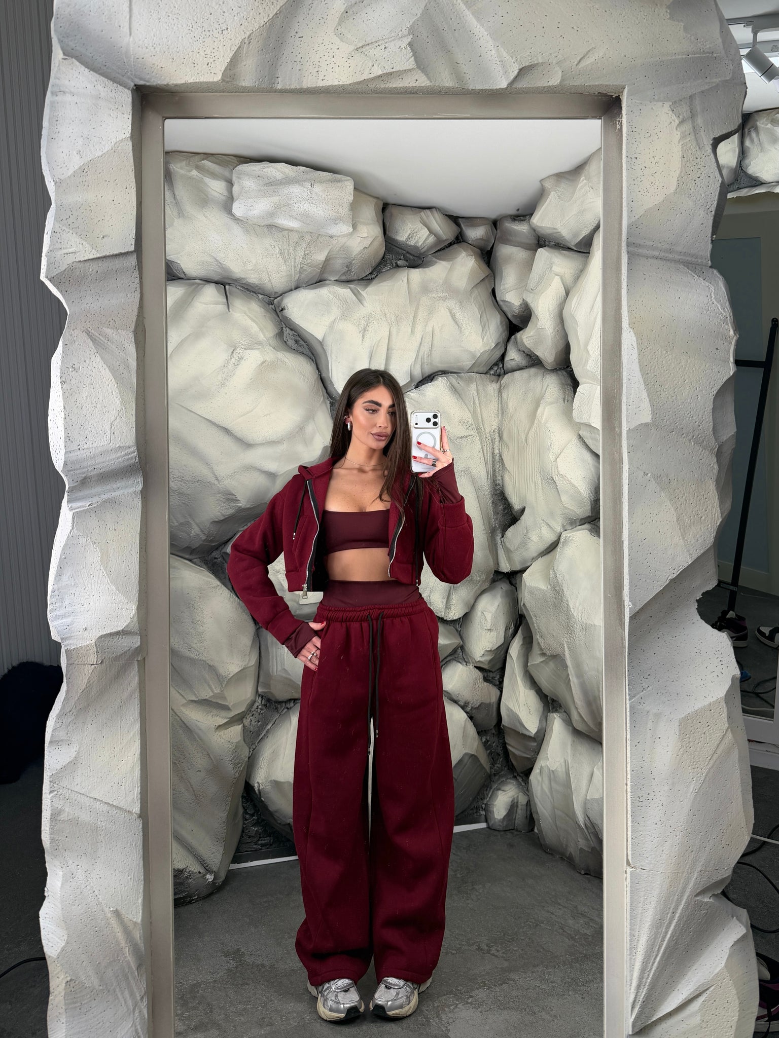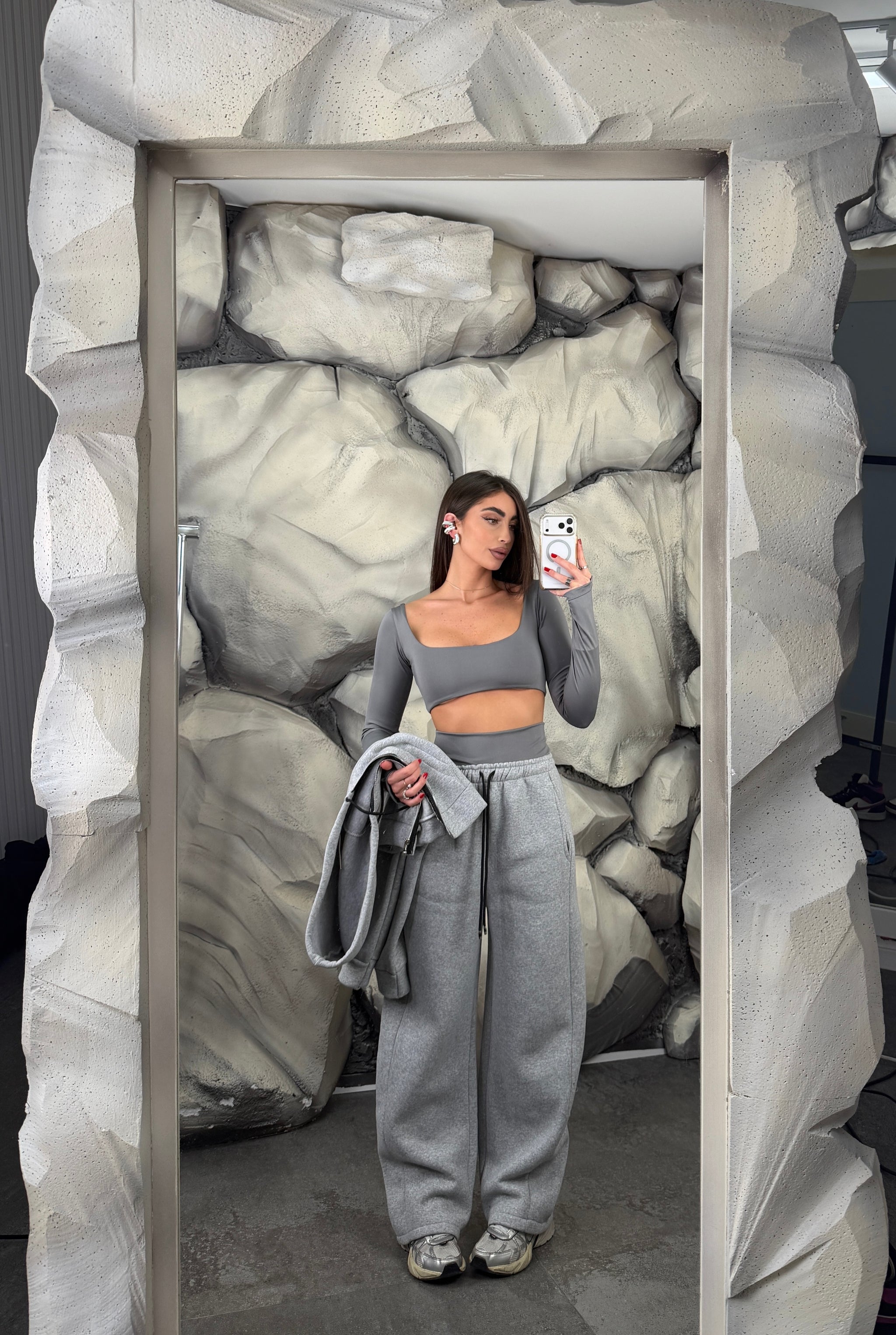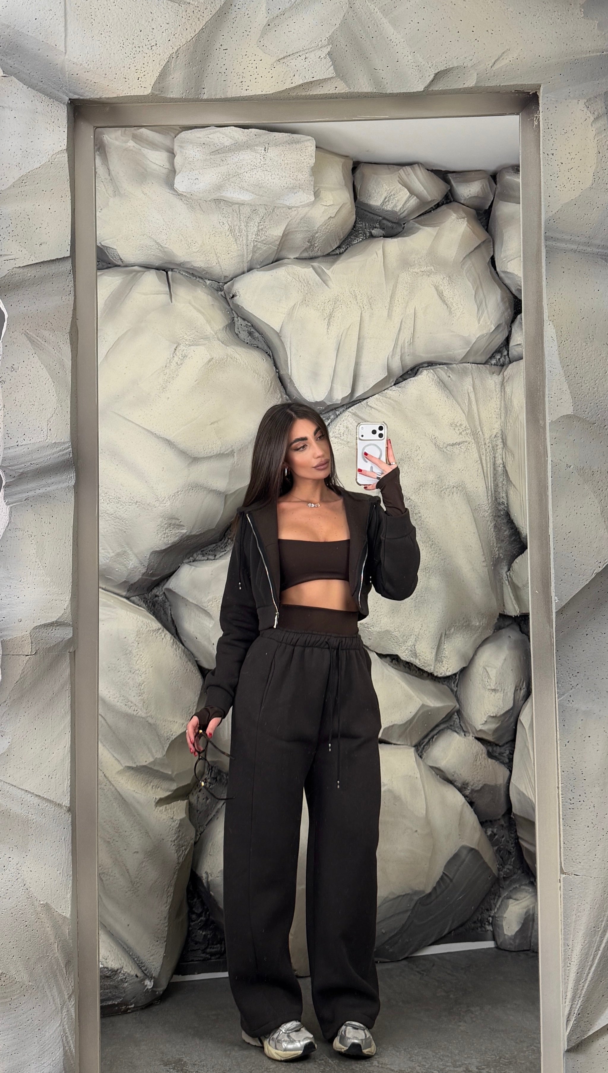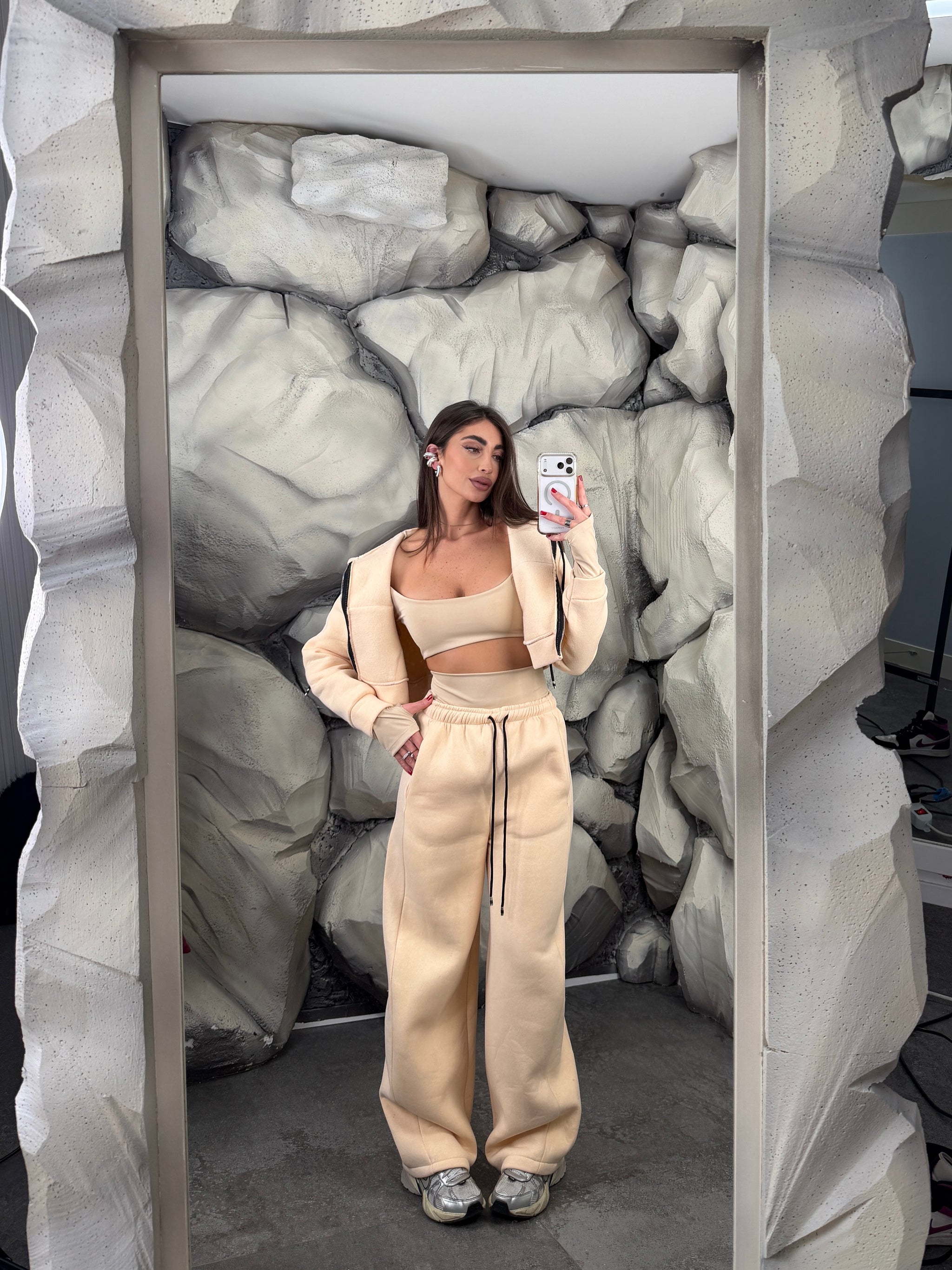 Completo tre pezzi felpati. Felpa crop con cappuccio e chiusura lampo, top in lycra pushup e modellante, con manica a quanto, pantalone ballon regolabile in vita.