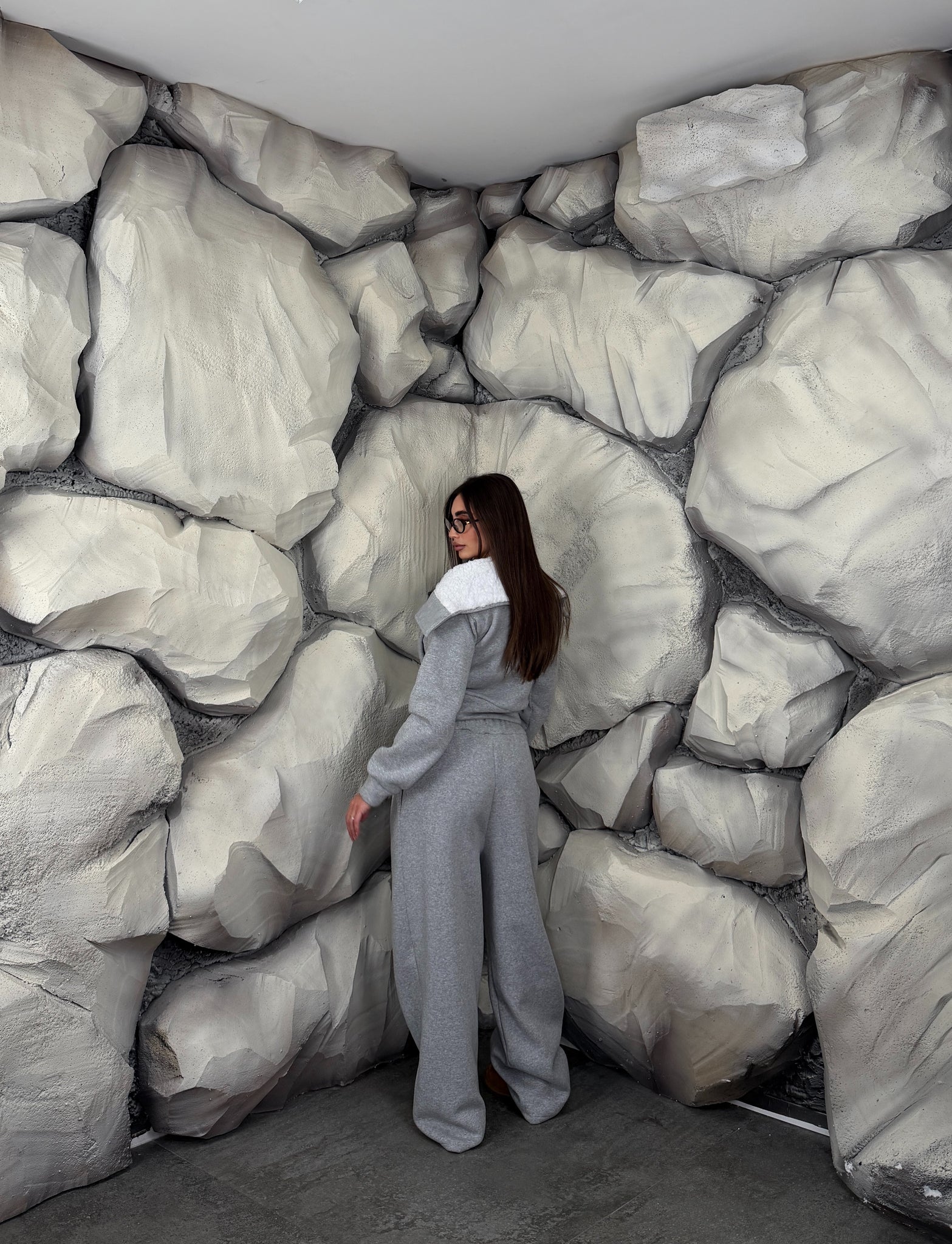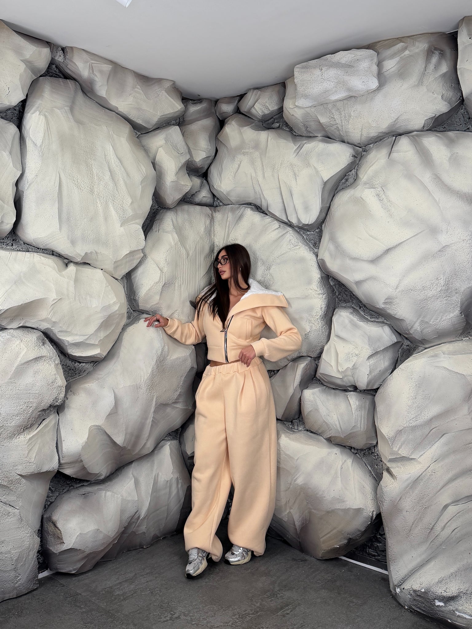 Completo di tuta in cotone felpato, composto da felpa con pelliccia interna e zip sul davanti, scollo sciallato, pantalone modello palazzo con elastico in vita.