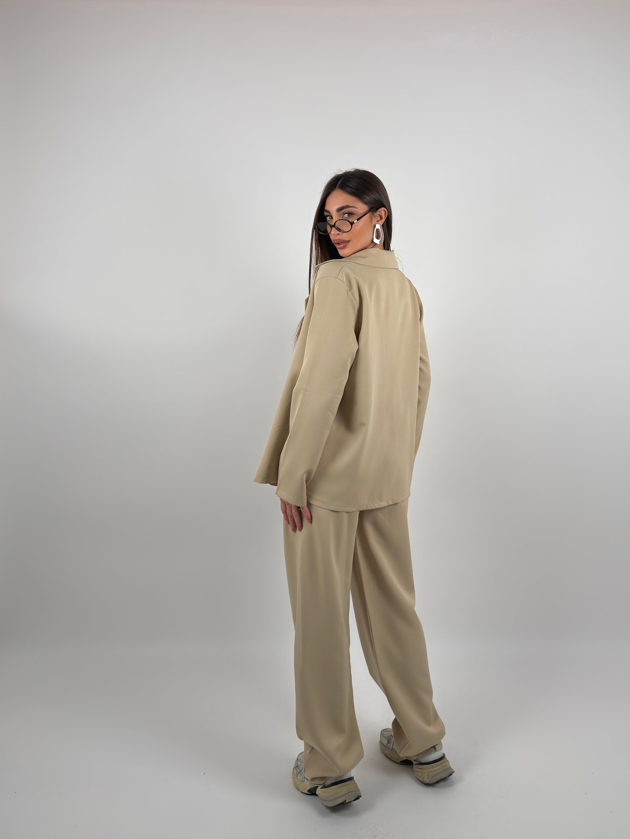 Completo con pantalone palazzo con elastico sul retro, giacca doppio petto. Veste fino ad una XL
