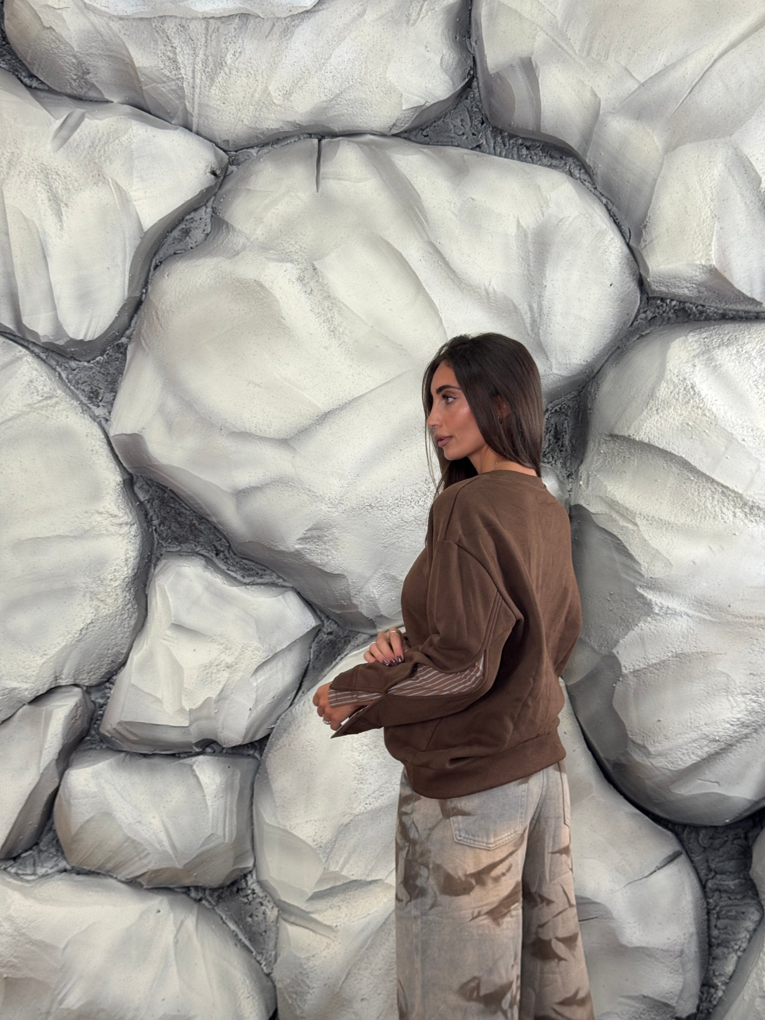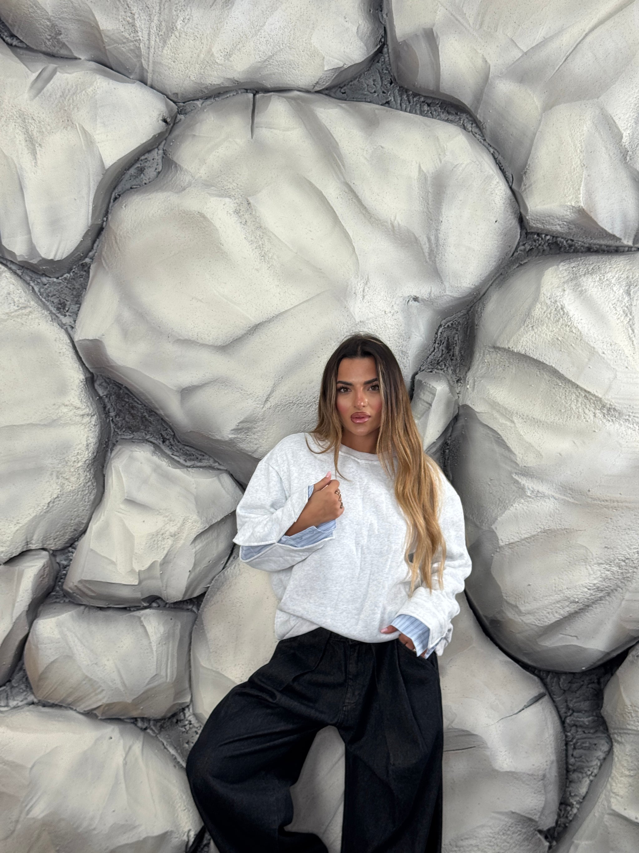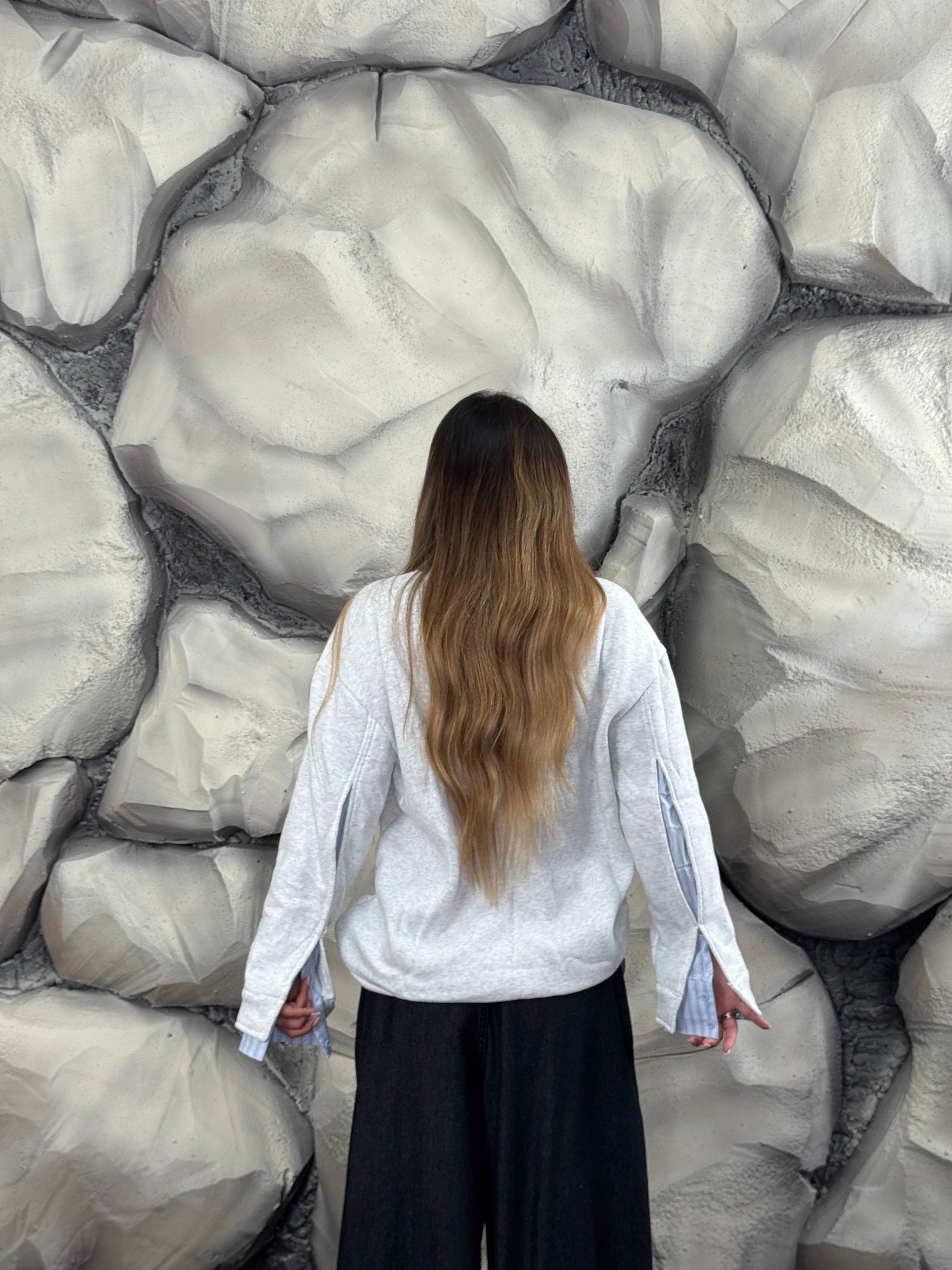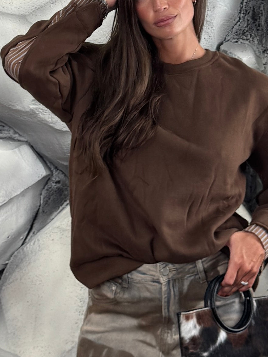 Felpa girocollo, felpata internamente, dettaglio inserto di camicia sulle maniche.