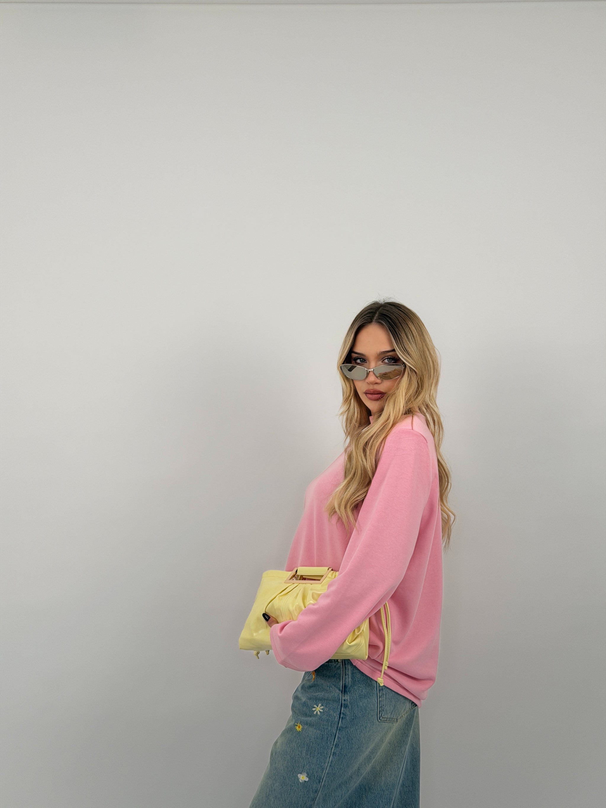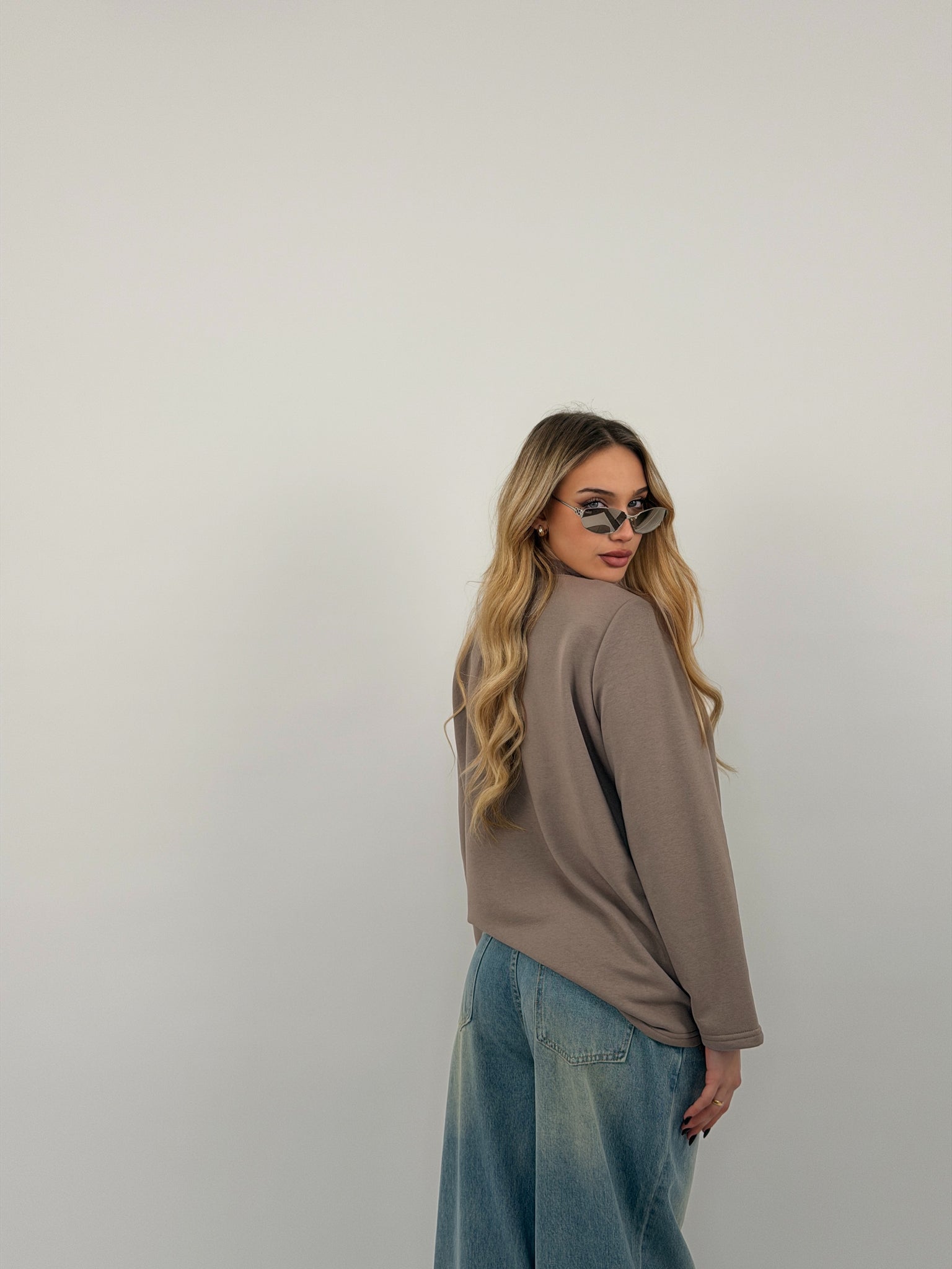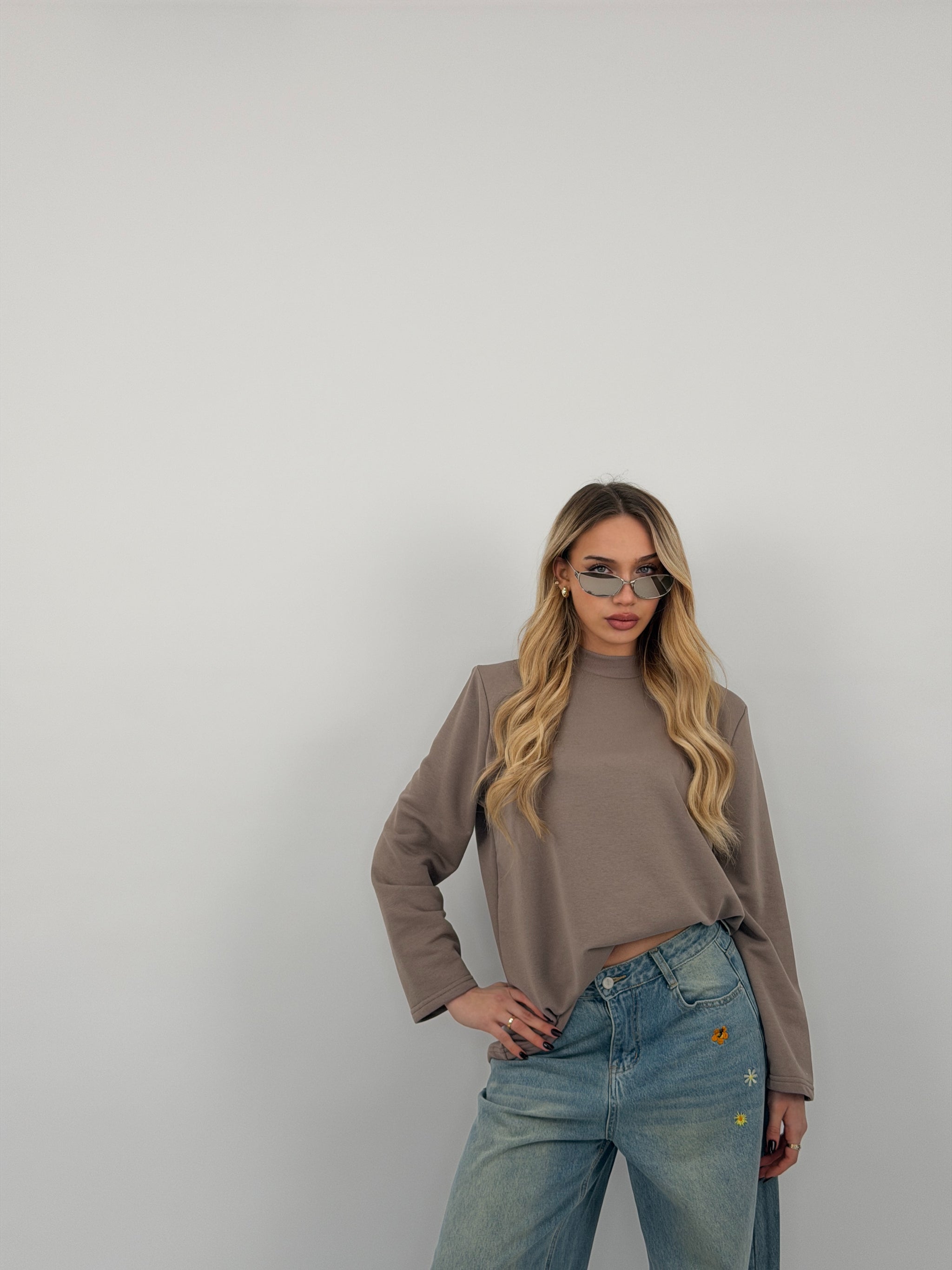 Felpa di cotone garzato, fit over, spalline preformate e mezzo collo.