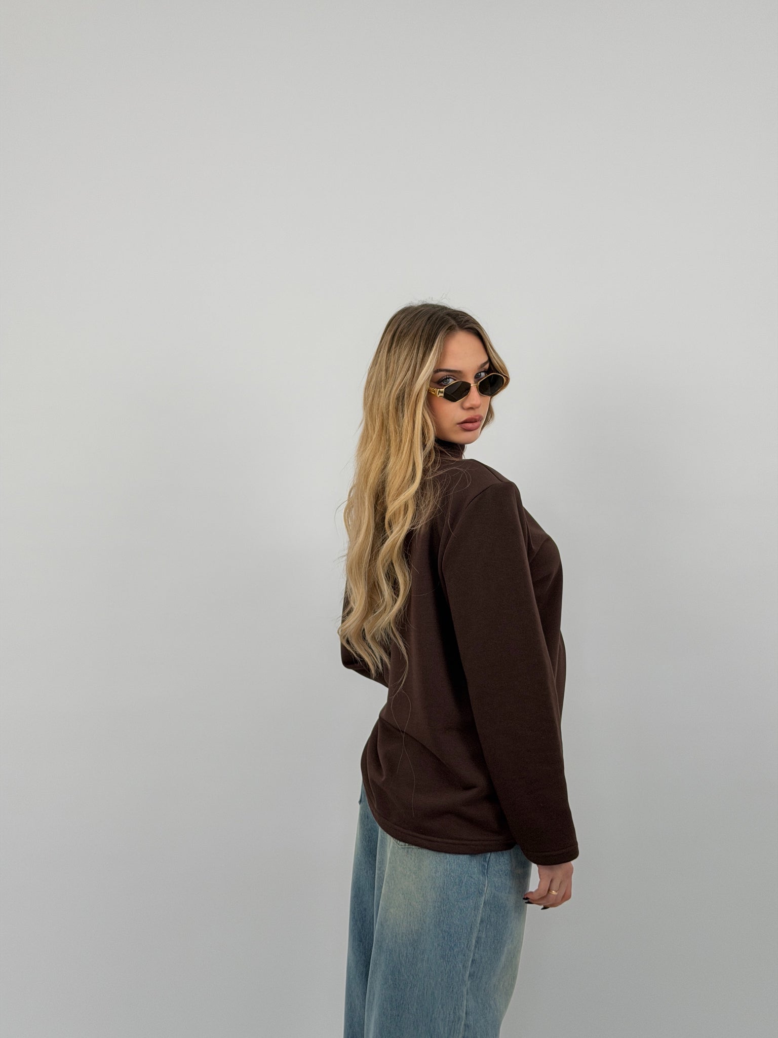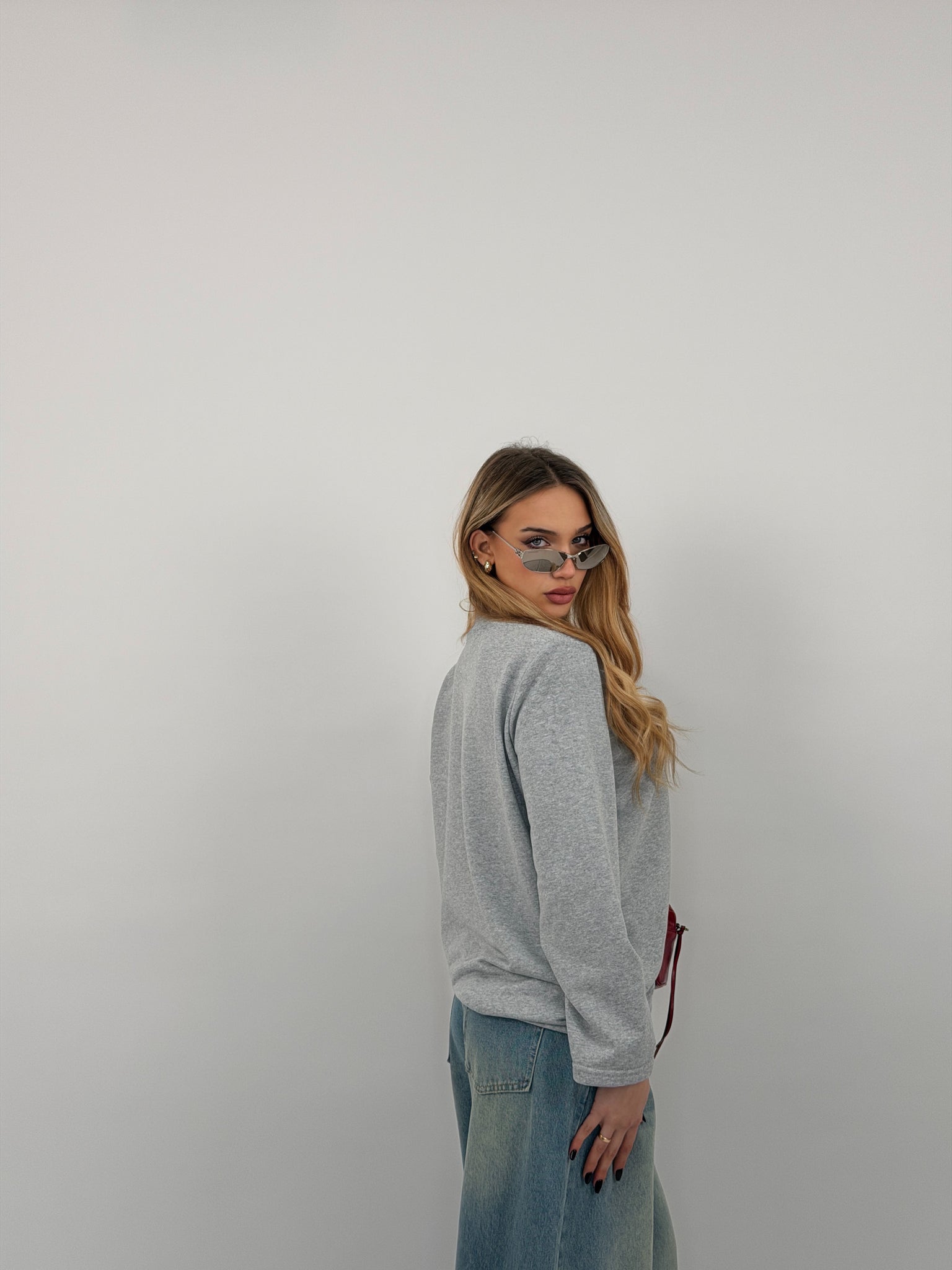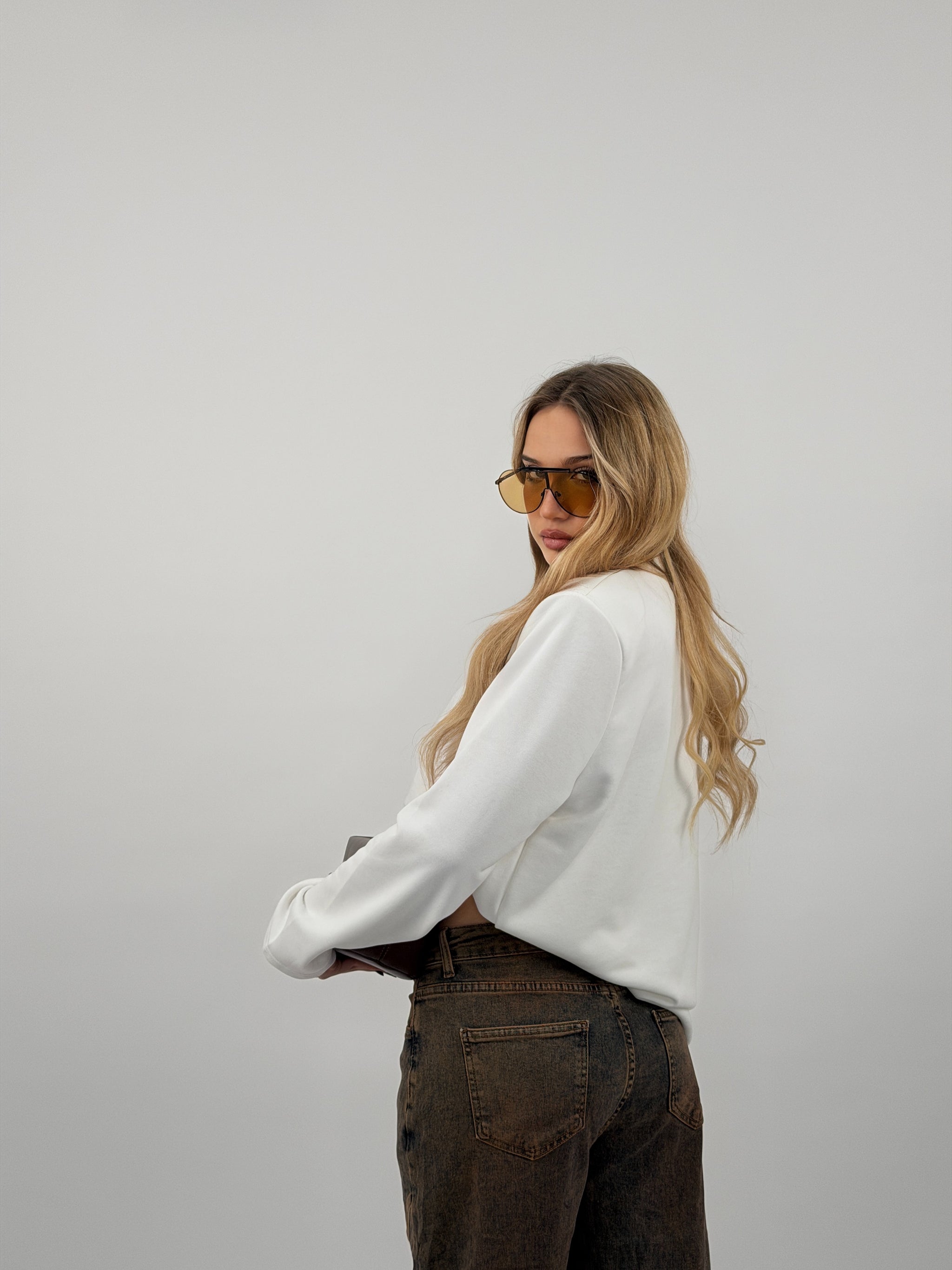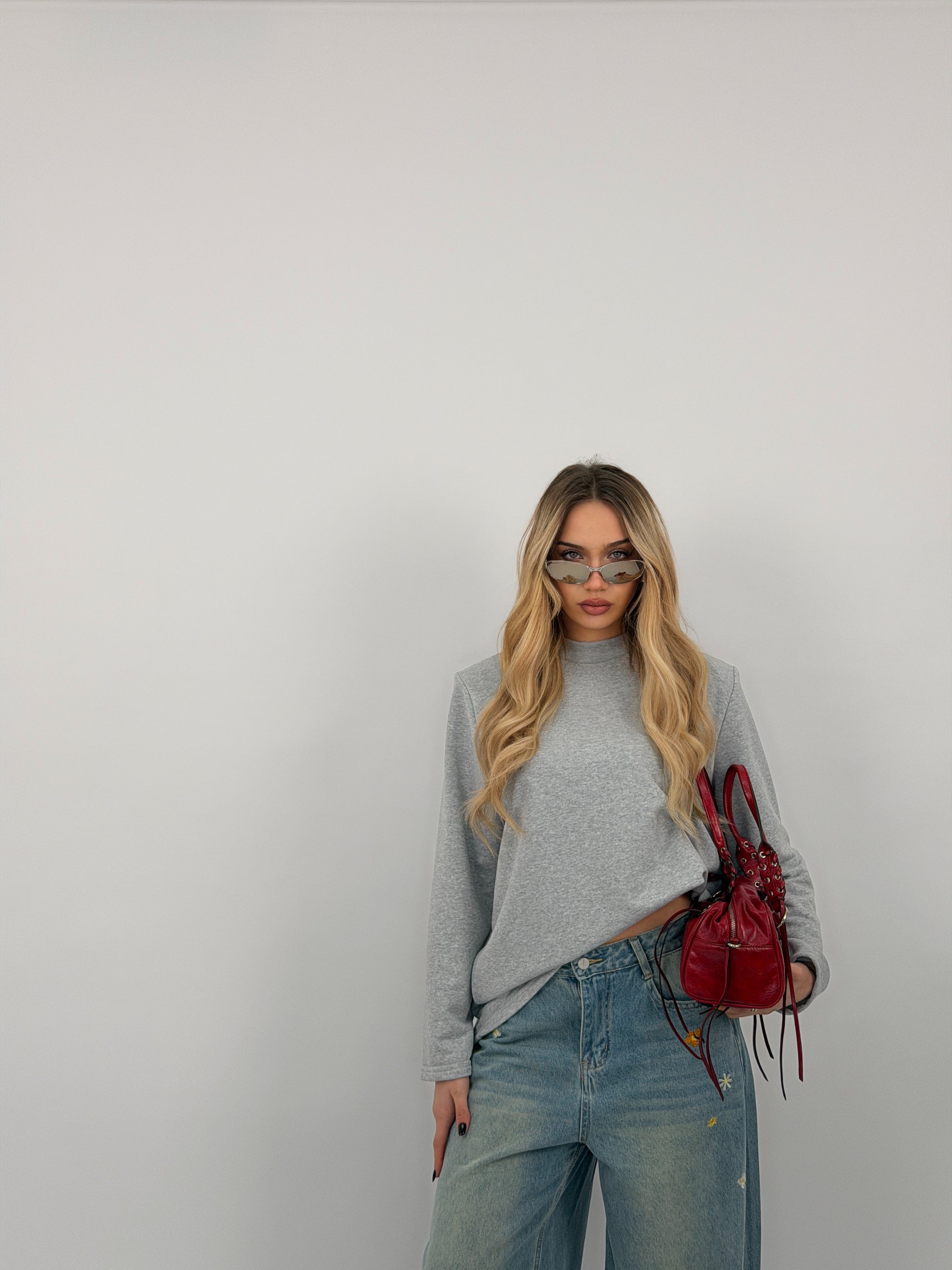 Felpa di cotone garzato, fit over, spalline preformate e mezzo collo.
