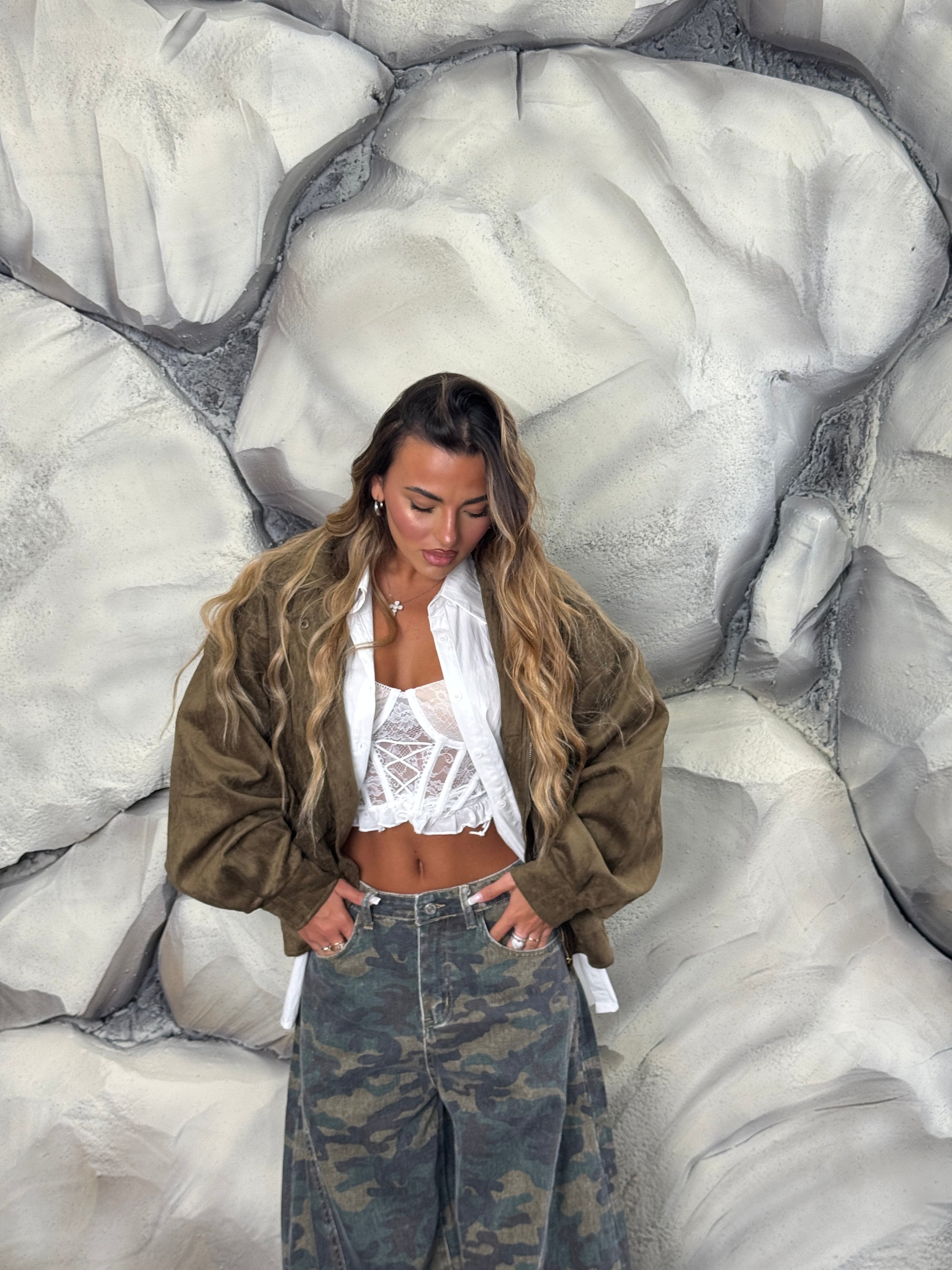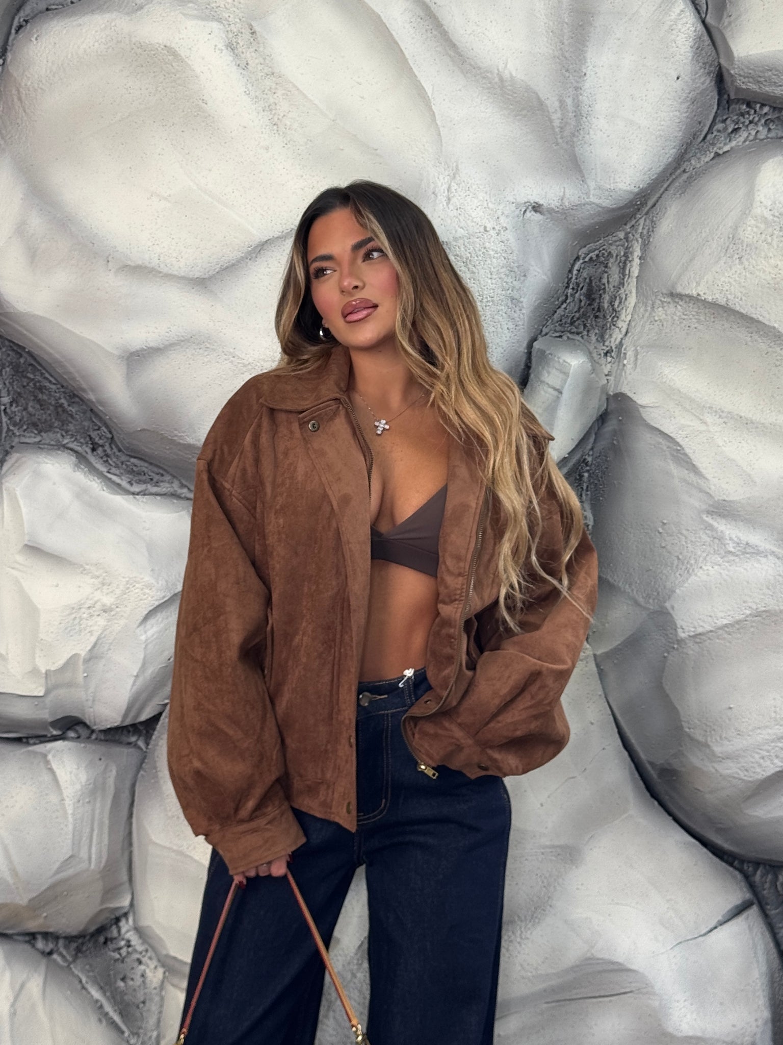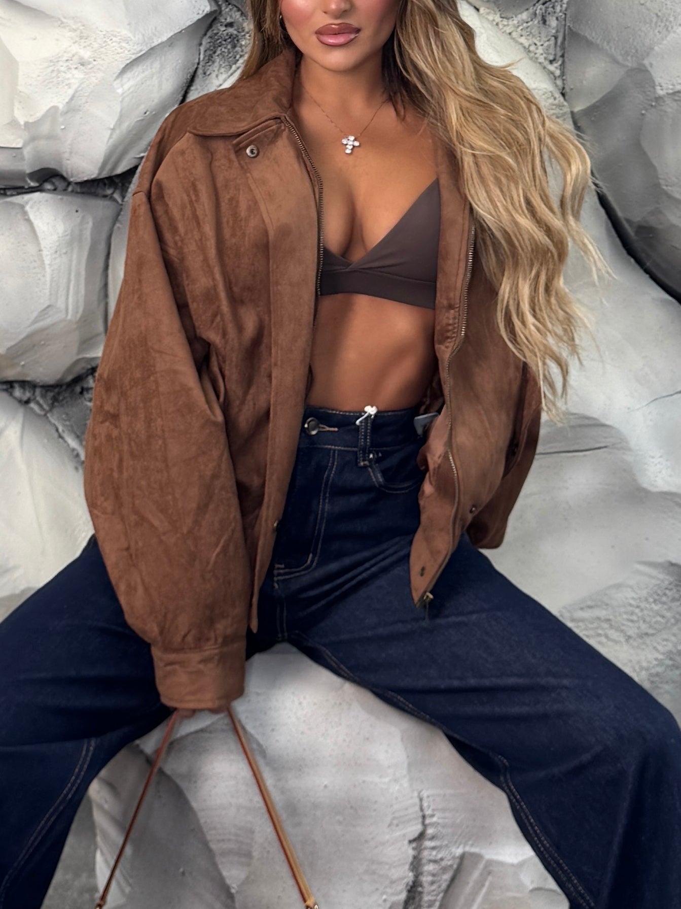 Giacca di velluto, foderata, zip sul davanti con bottoncini che la coprono, tasche laterali, elastico in vita, colletto a camicia.