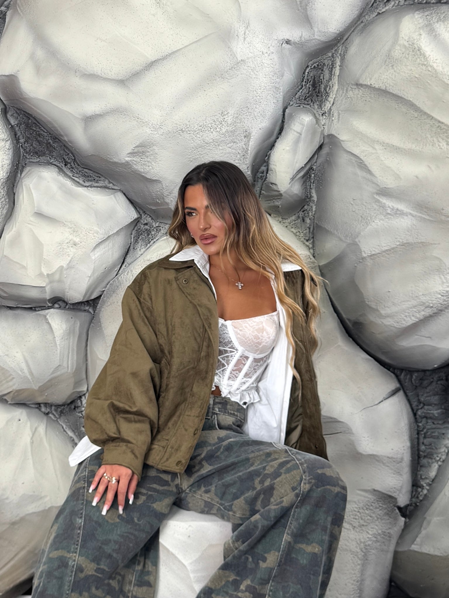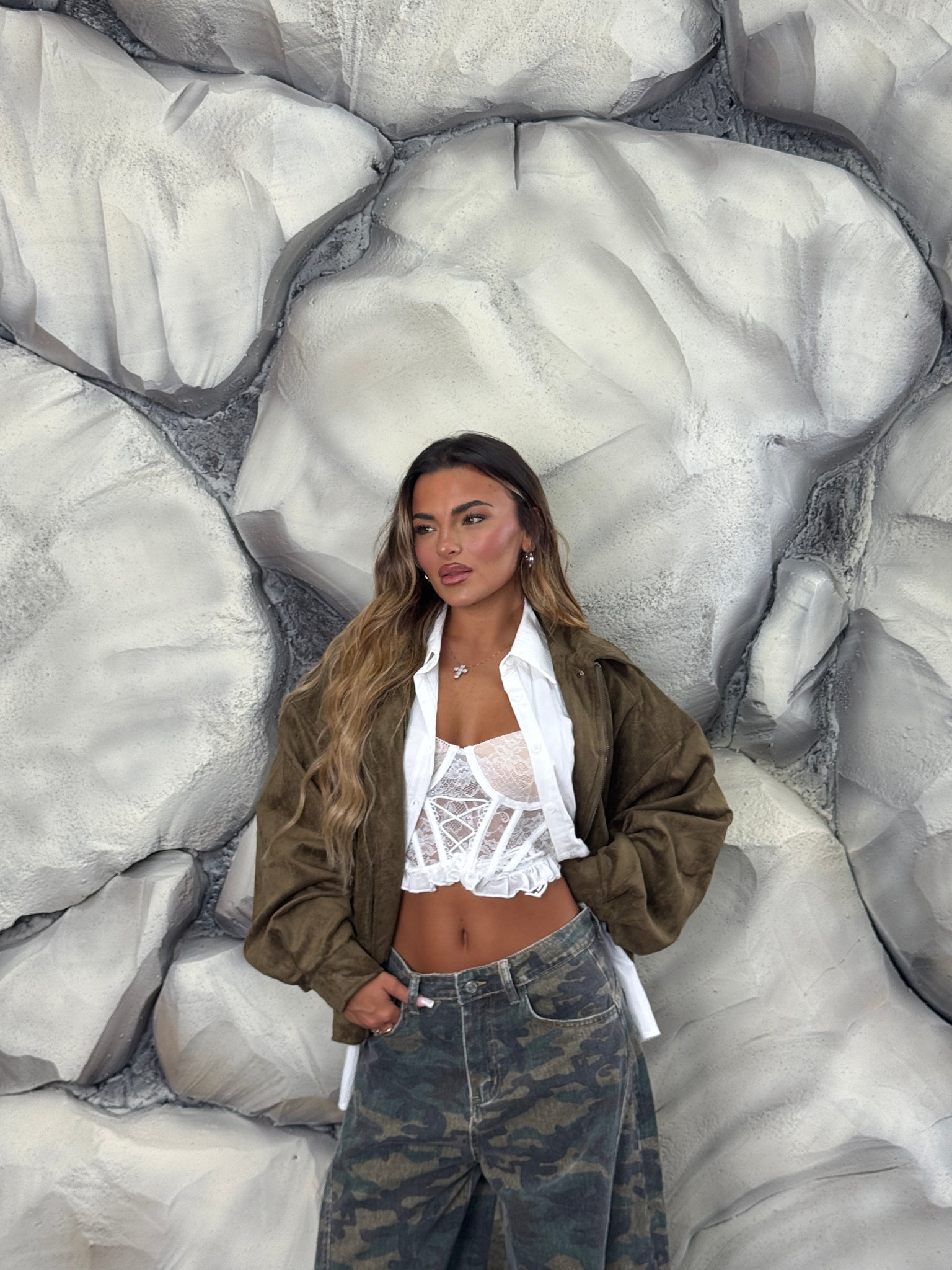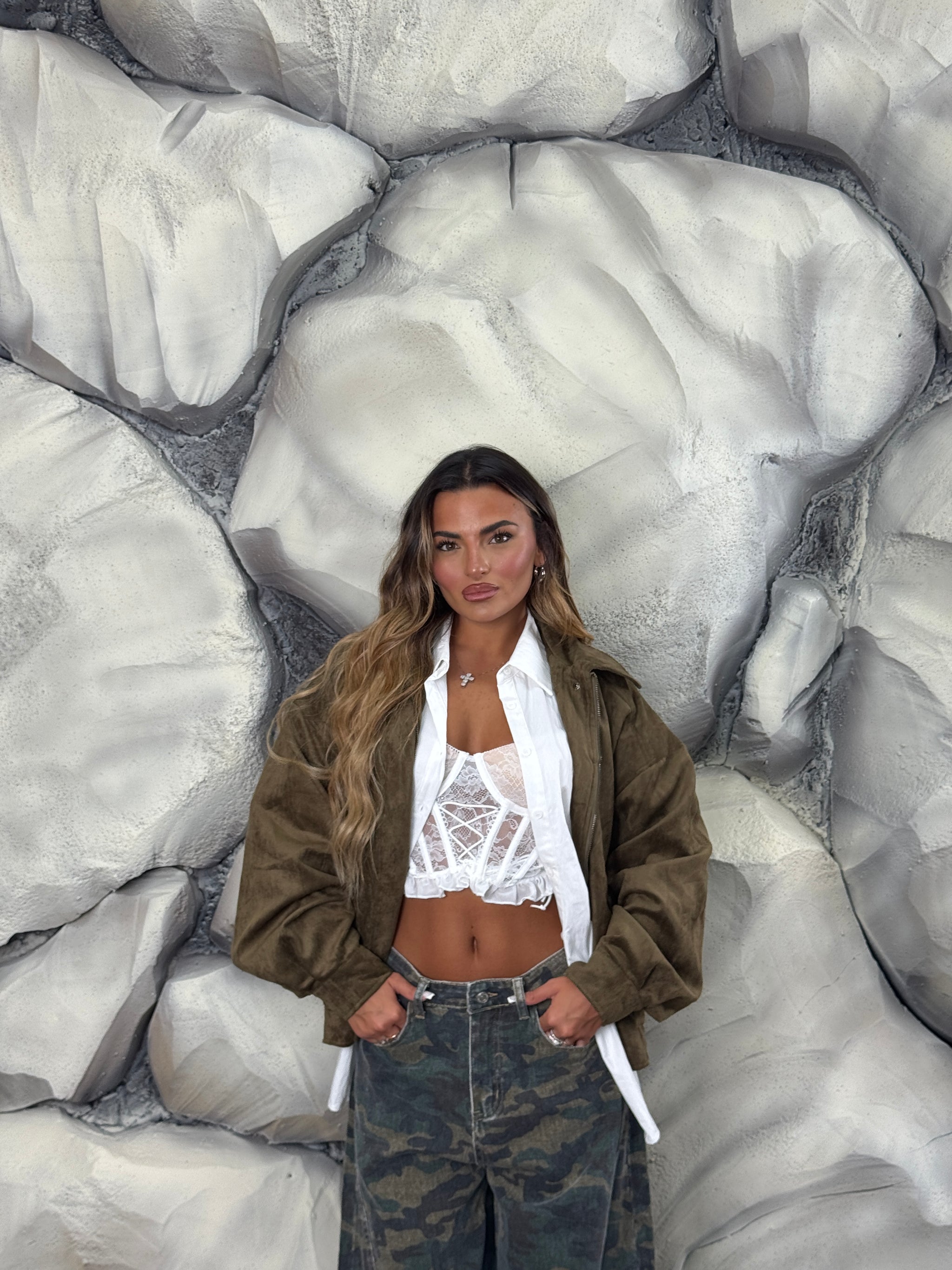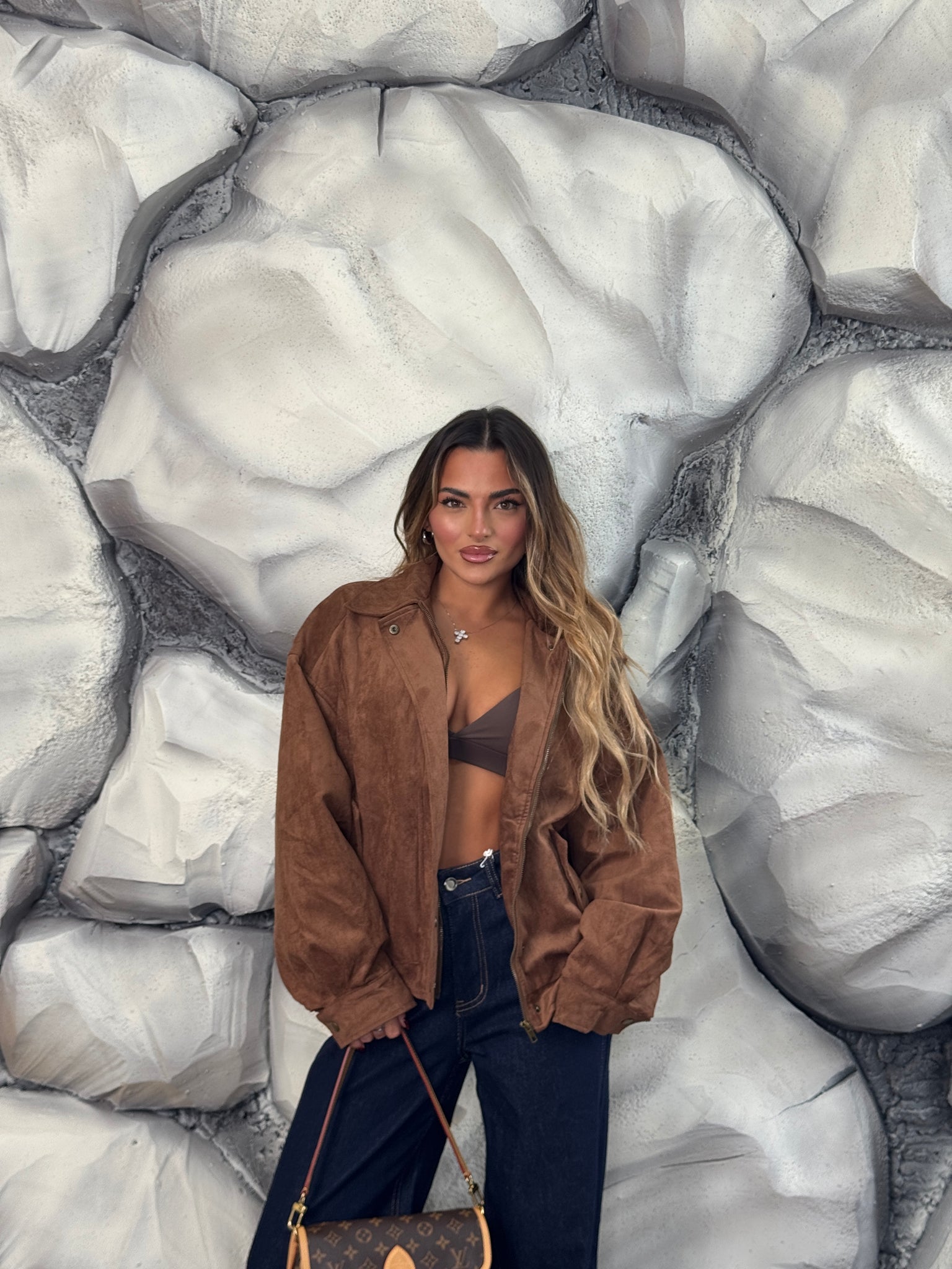 Giacca di velluto, foderata, zip sul davanti con bottoncini che la coprono, tasche laterali, elastico in vita, colletto a camicia.
