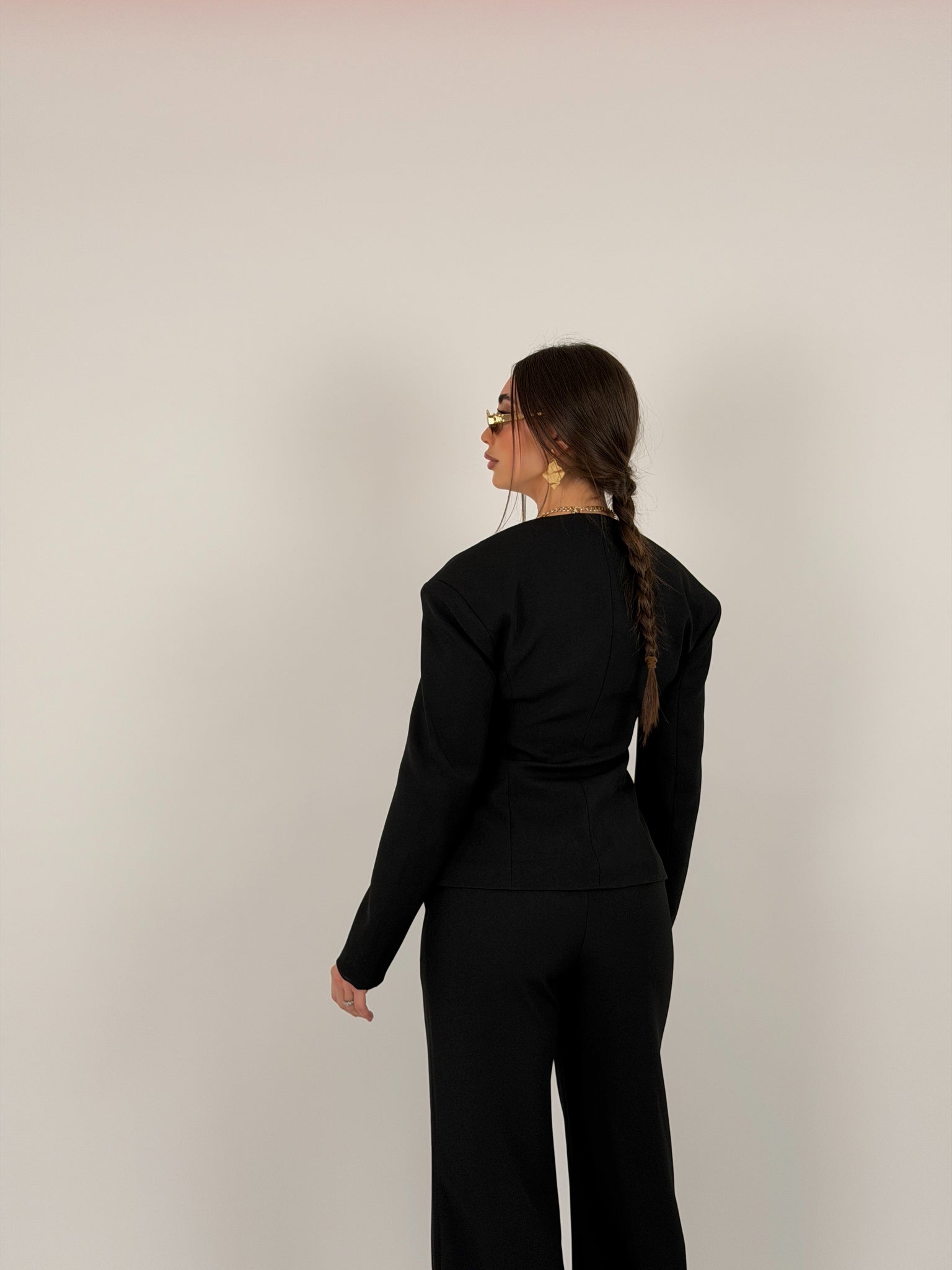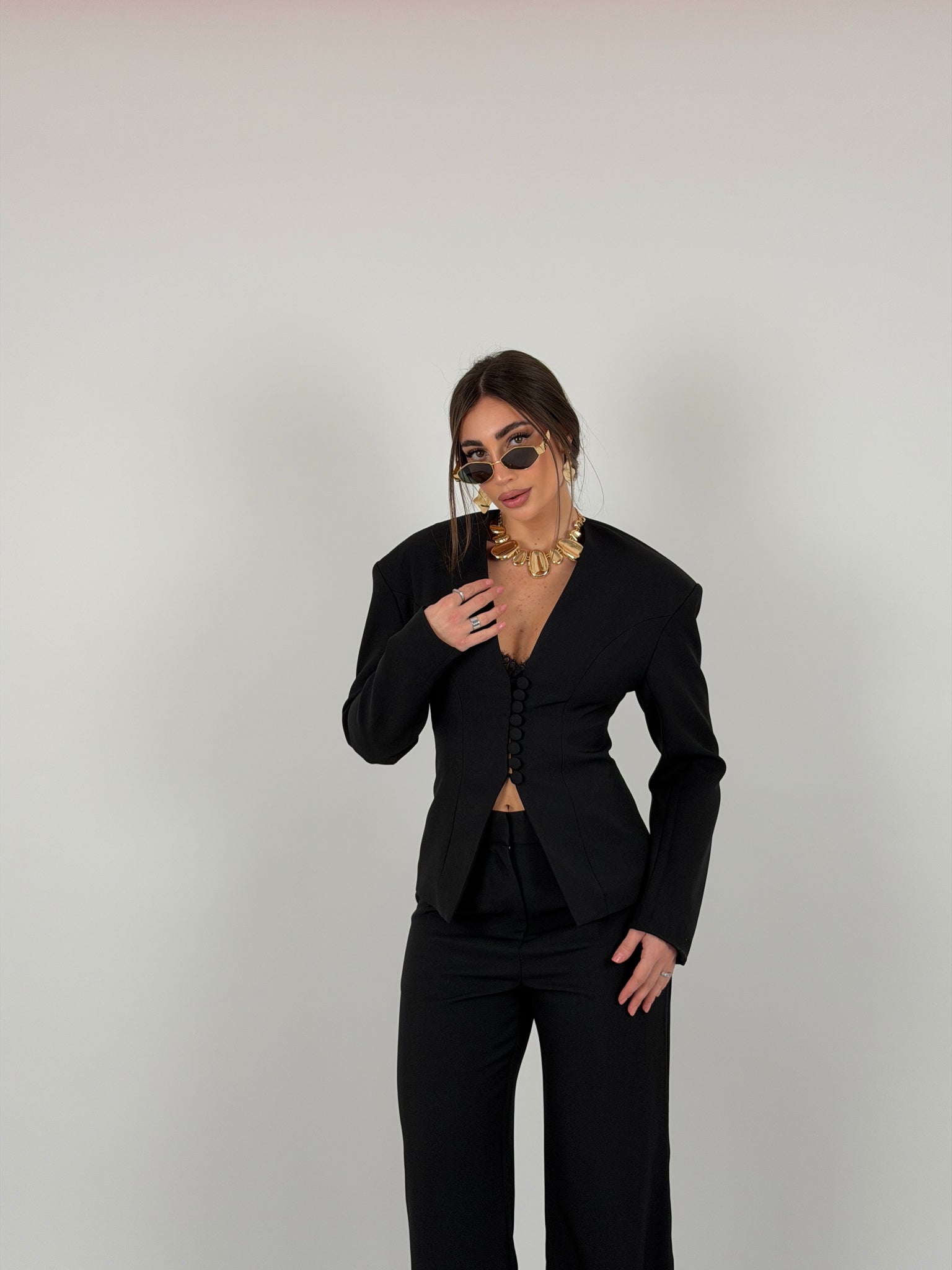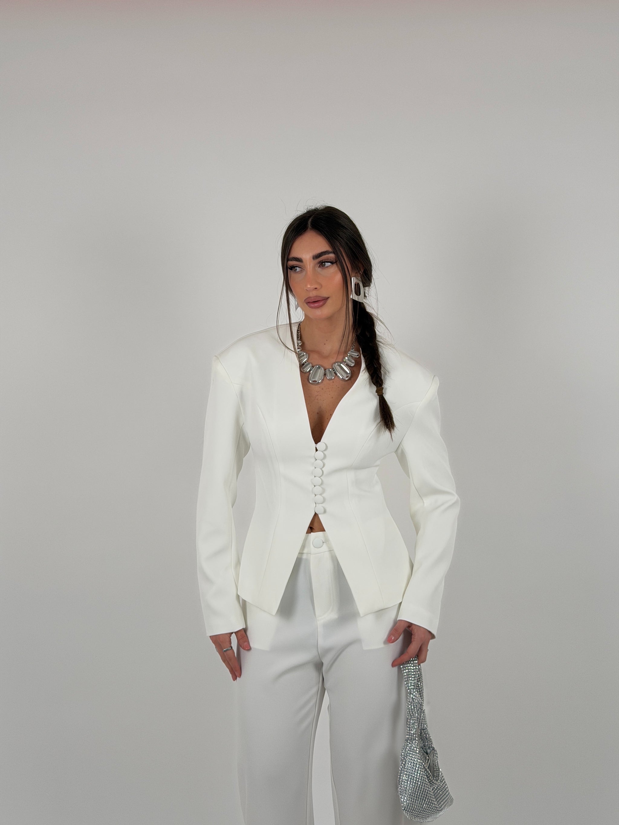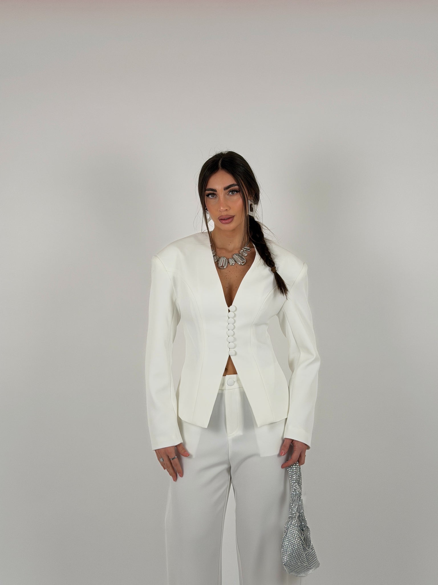Giacca strutturata e avvitata, spalline preformate, bottoncini sul davanti, foderata all’interno.