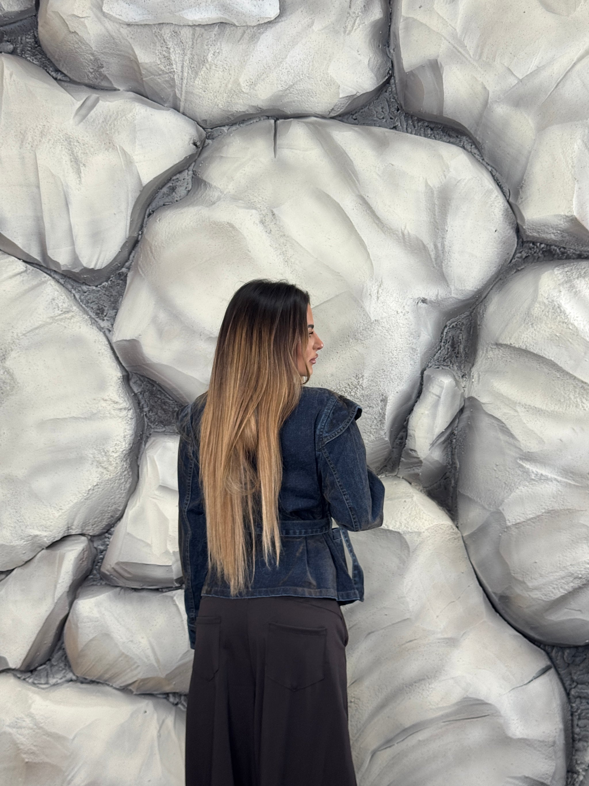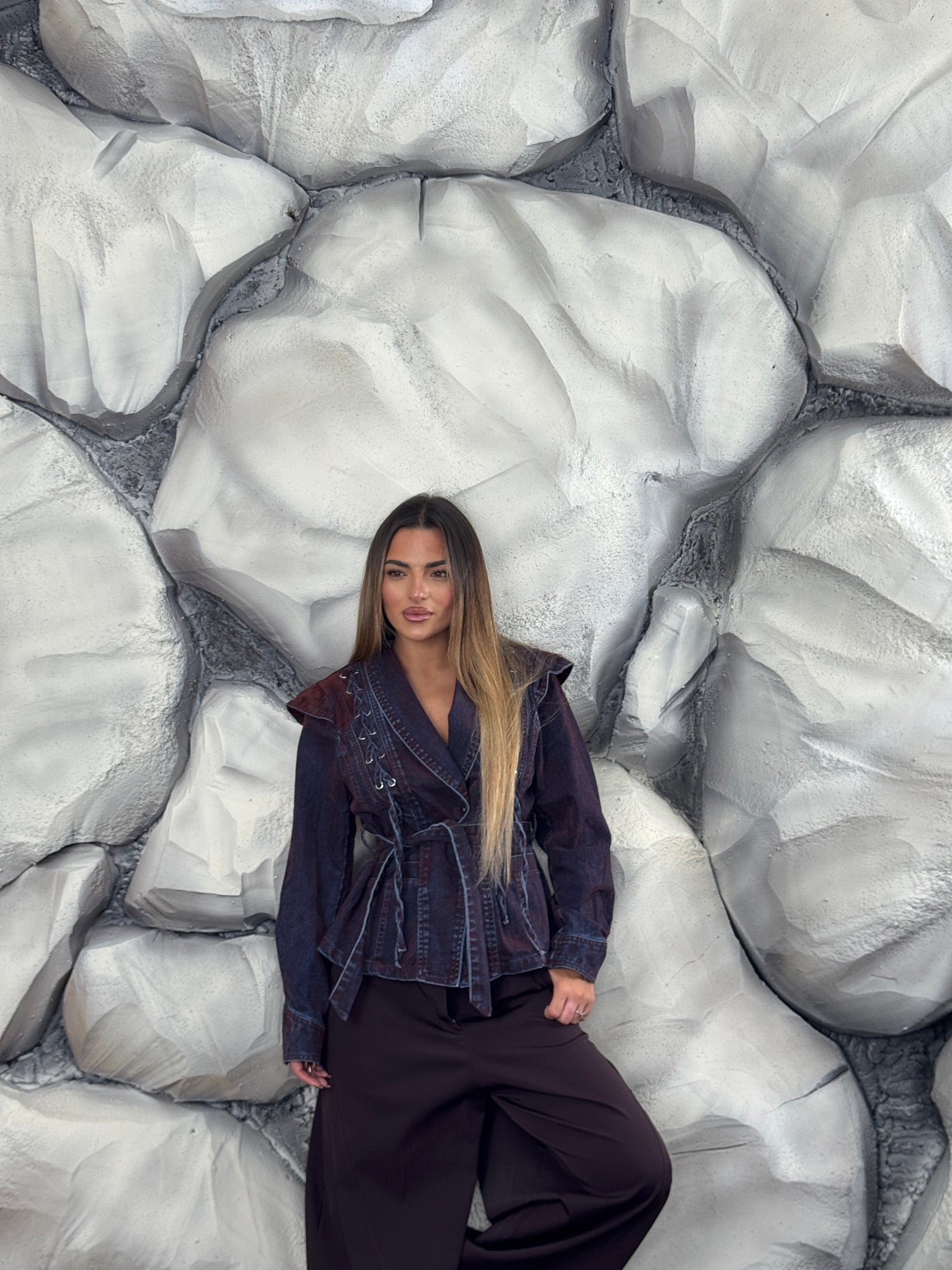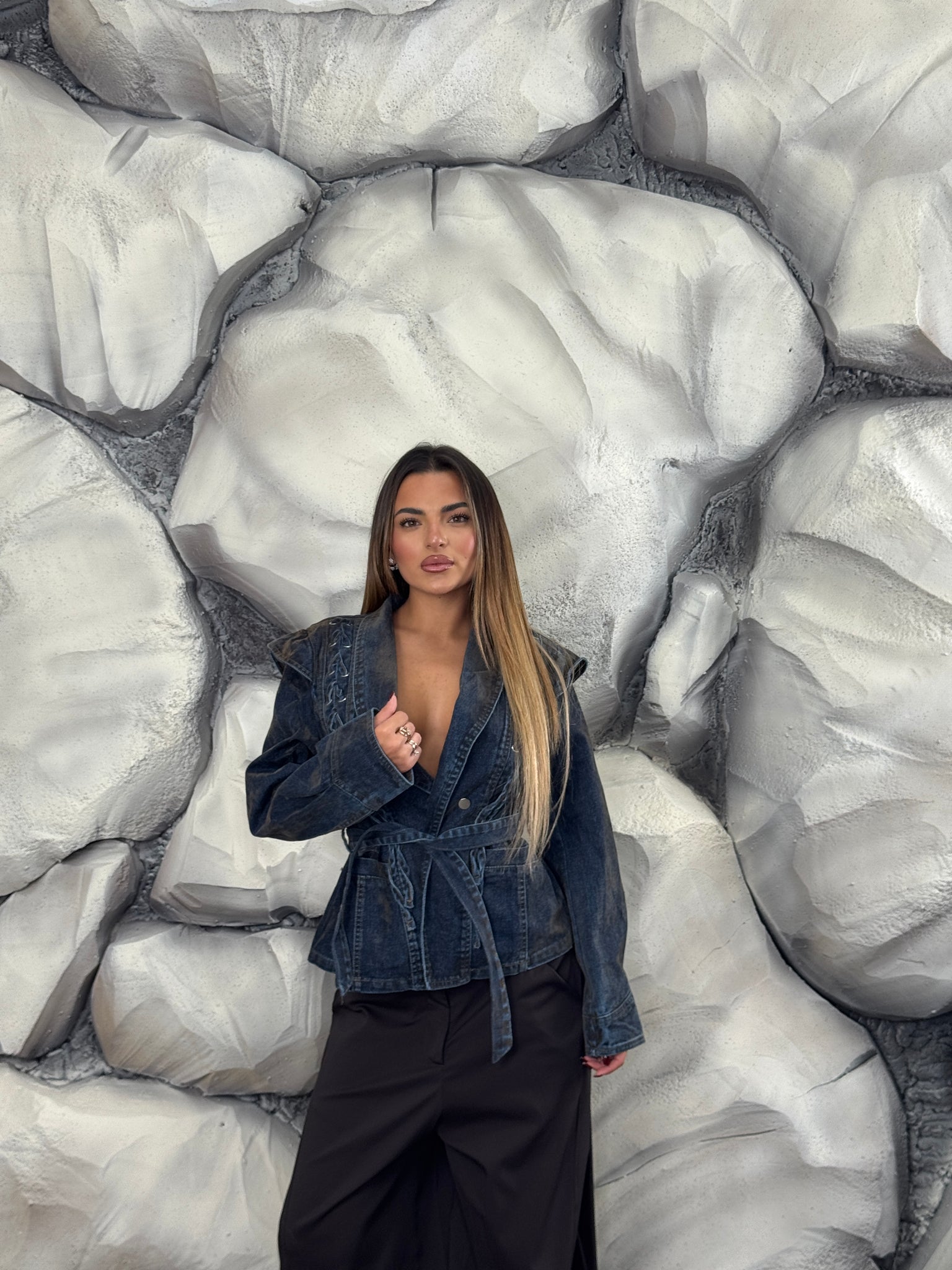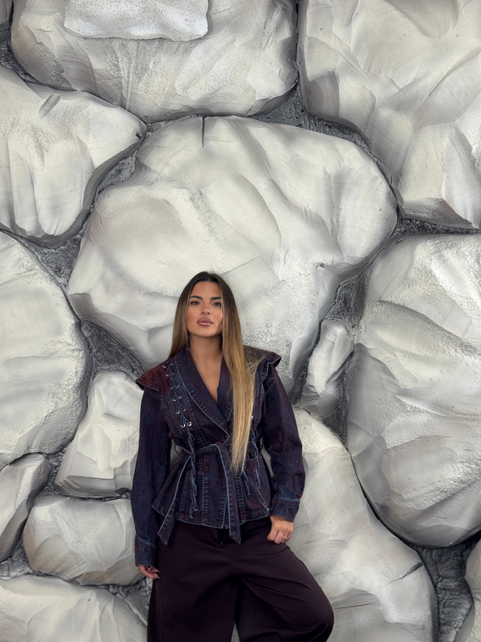 Giacca di jeans e vellutino, tessuto fermo, dettaglio stringhe sul davanti, effetto scambiato, cintura in vita.