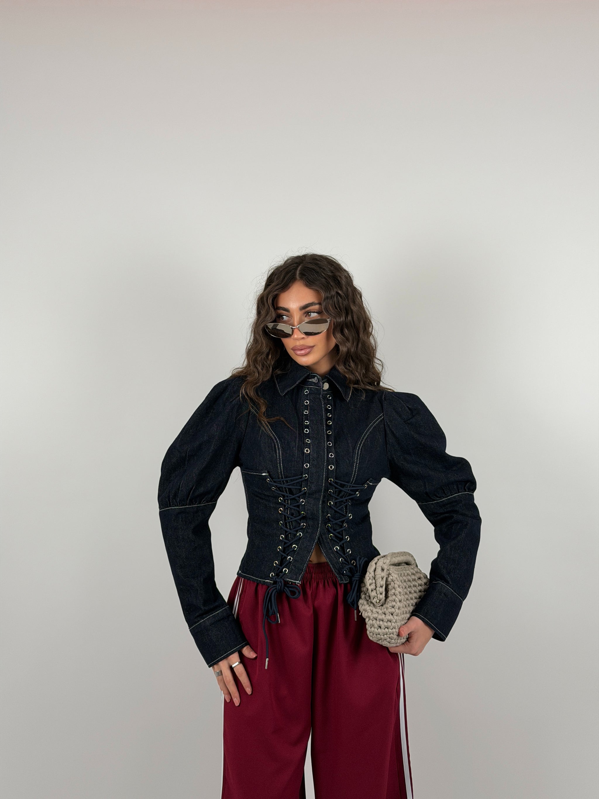 Giacca di jeans strutturata, dettaglio stringhe sul davanti, manica ballon.
