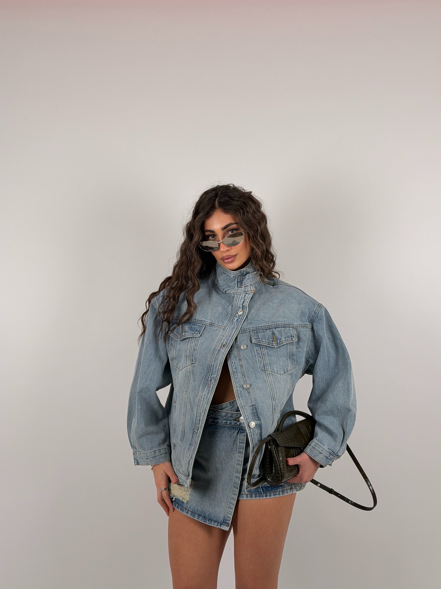 Giacca di jeans, spalline preformate, bottoni sul davanti, colletto con bottone, over size.
