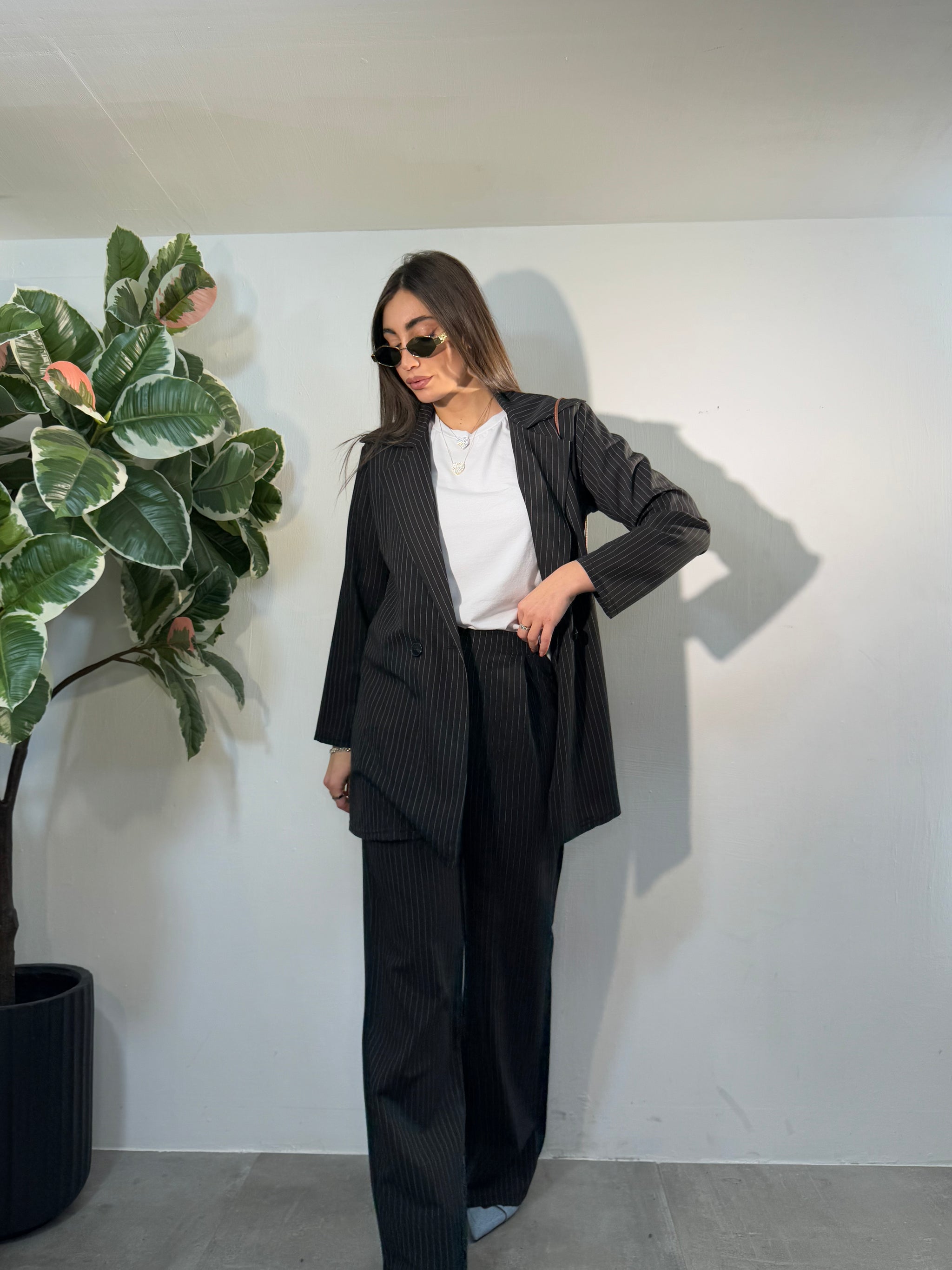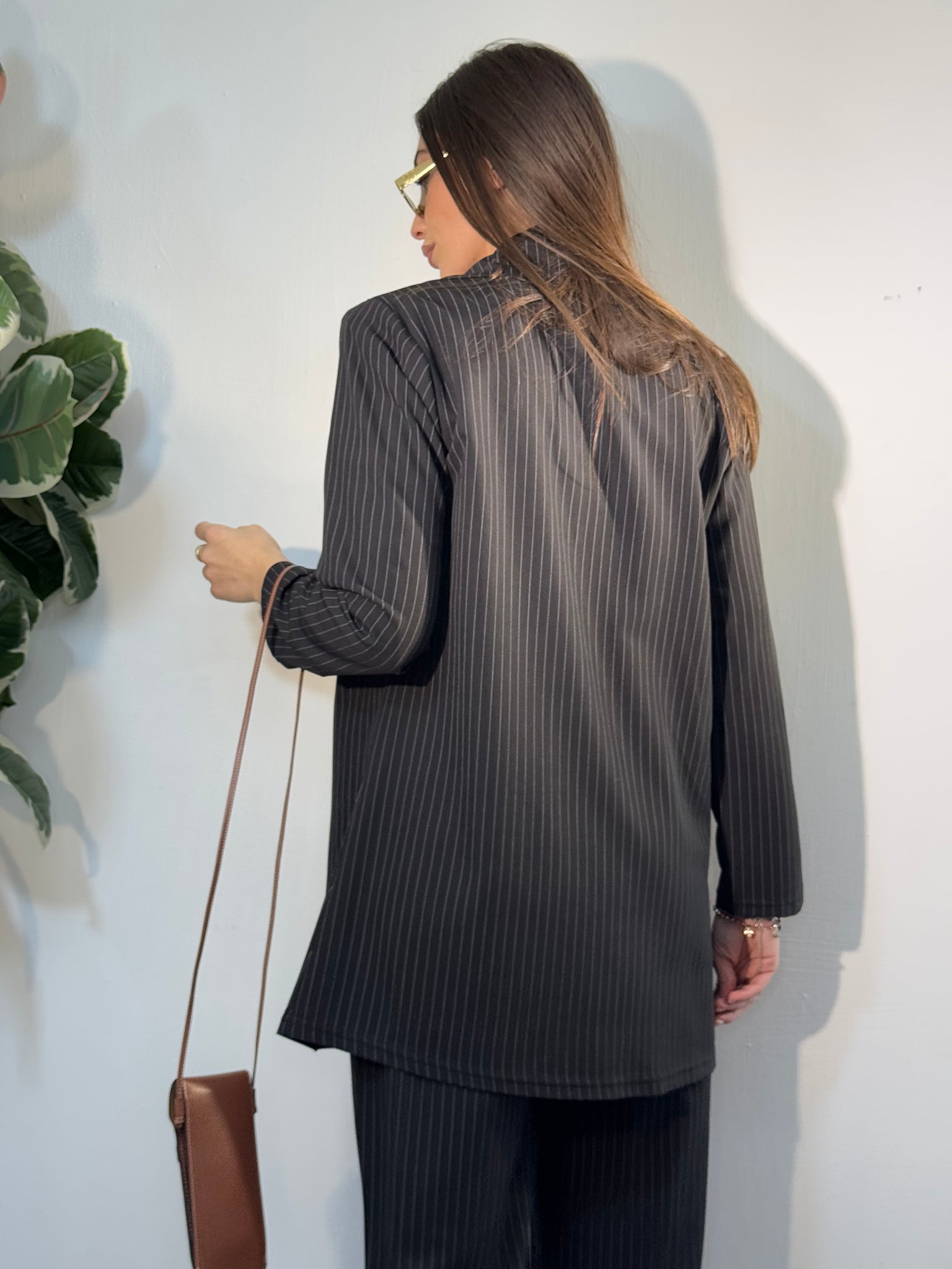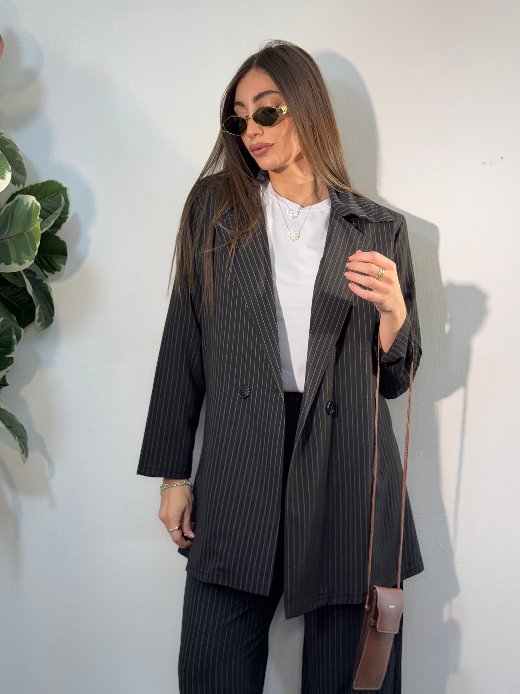 Giacca lunga tessuto gessato