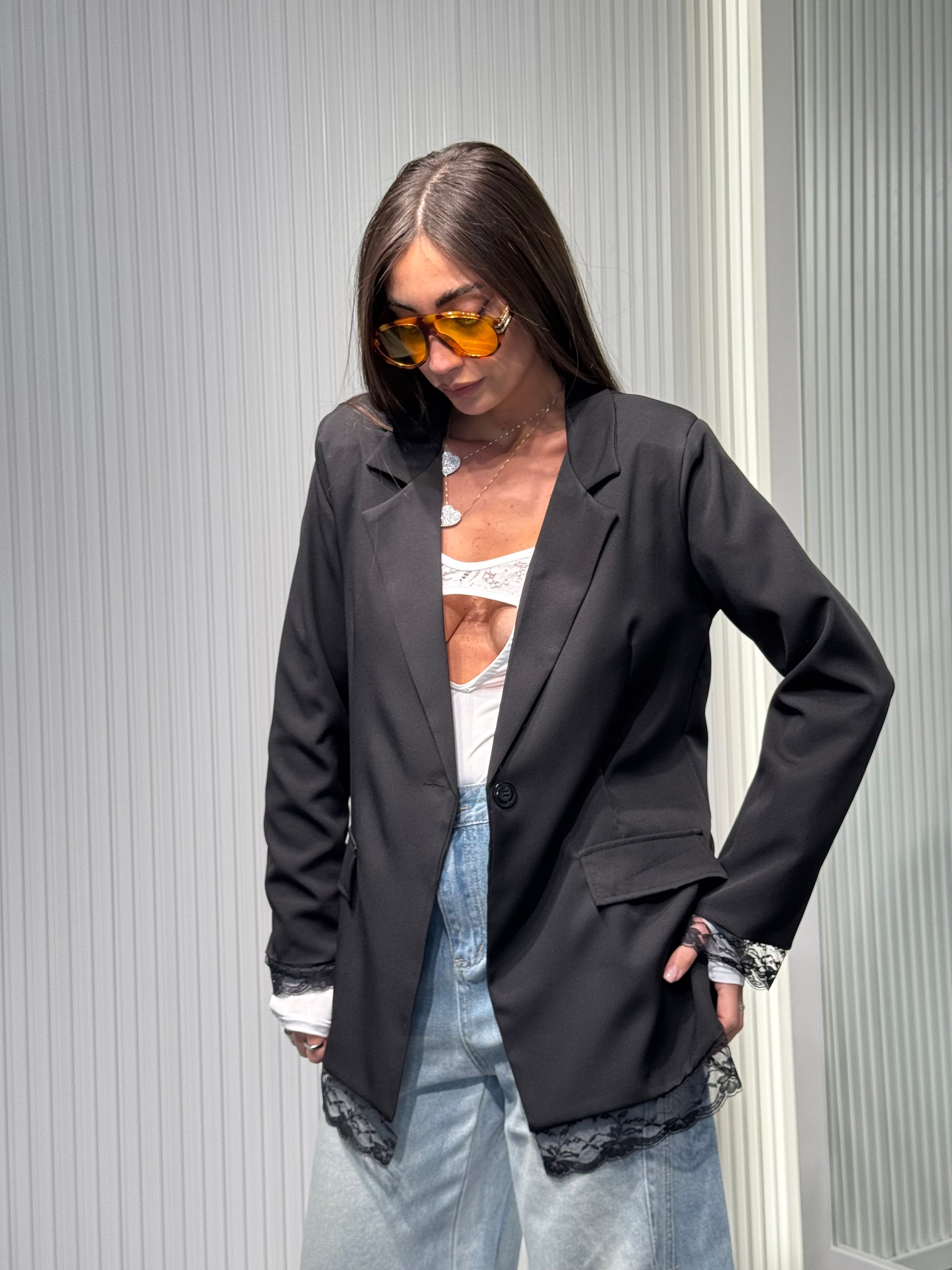 Giacca over size con dettaglio merletto che fuoriesce sia dalle maniche che dal busto. Ha una vestibilità pazzesca, quel poco di merletto che fuoriesce la rende particolare e fine allo stesso tempo