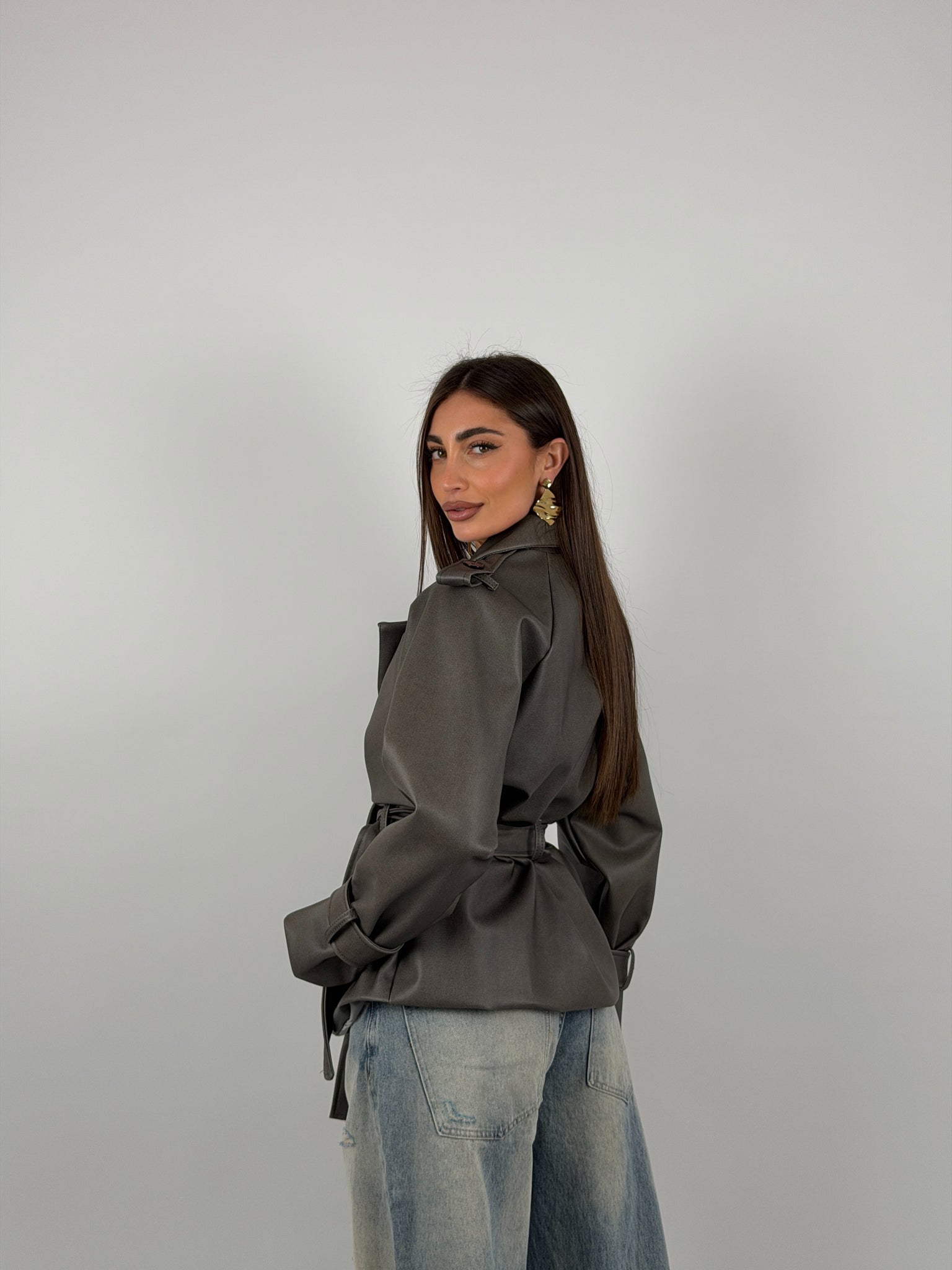 Giacca trench in ecopelle, foderata all’interno, chiusura doppio petto con anche la cintura in vita.