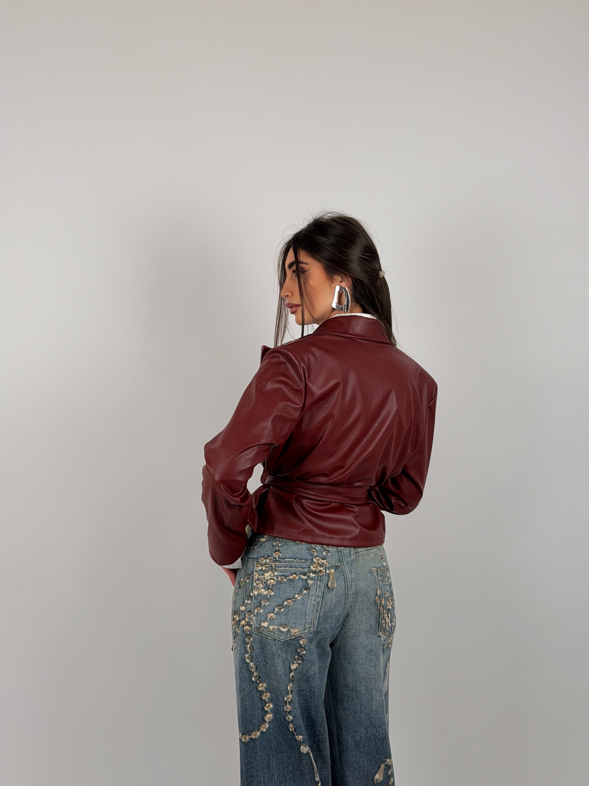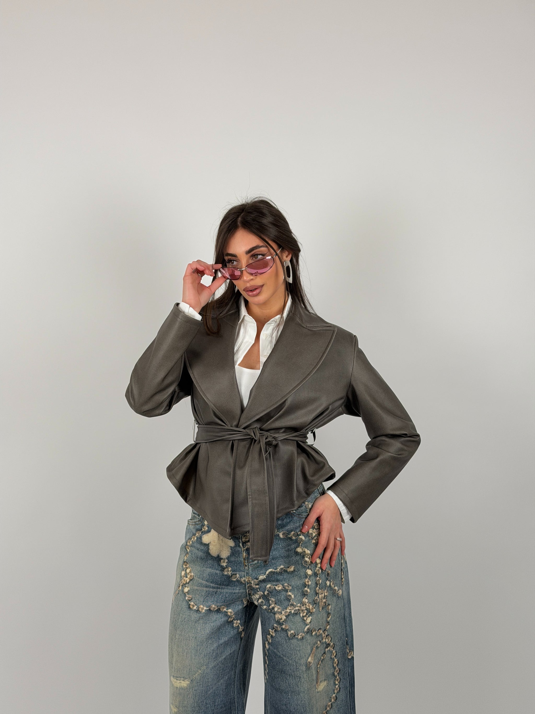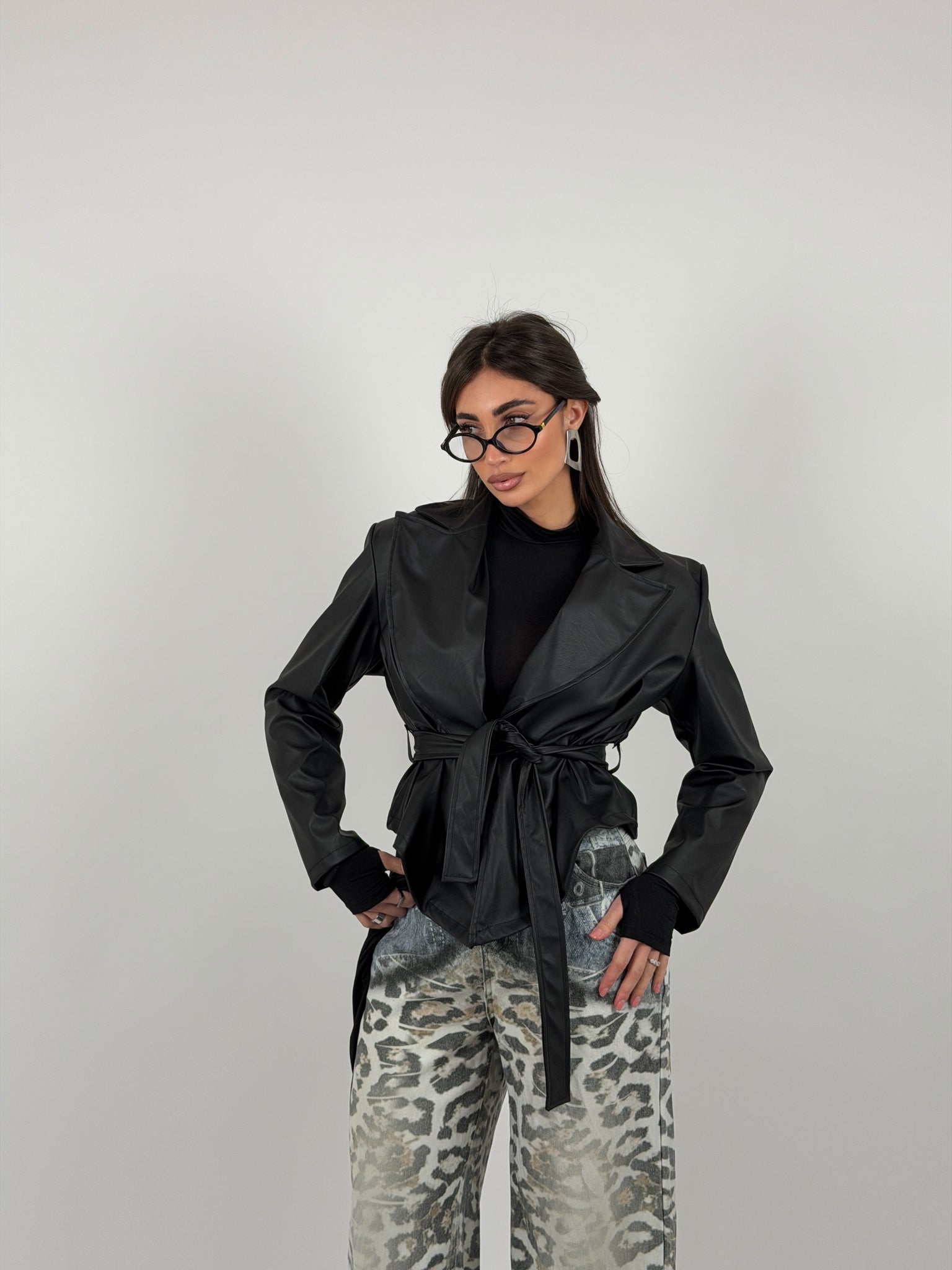 Giacca in ecopelle, foderato all’interno, chiusura con cintura in vita.