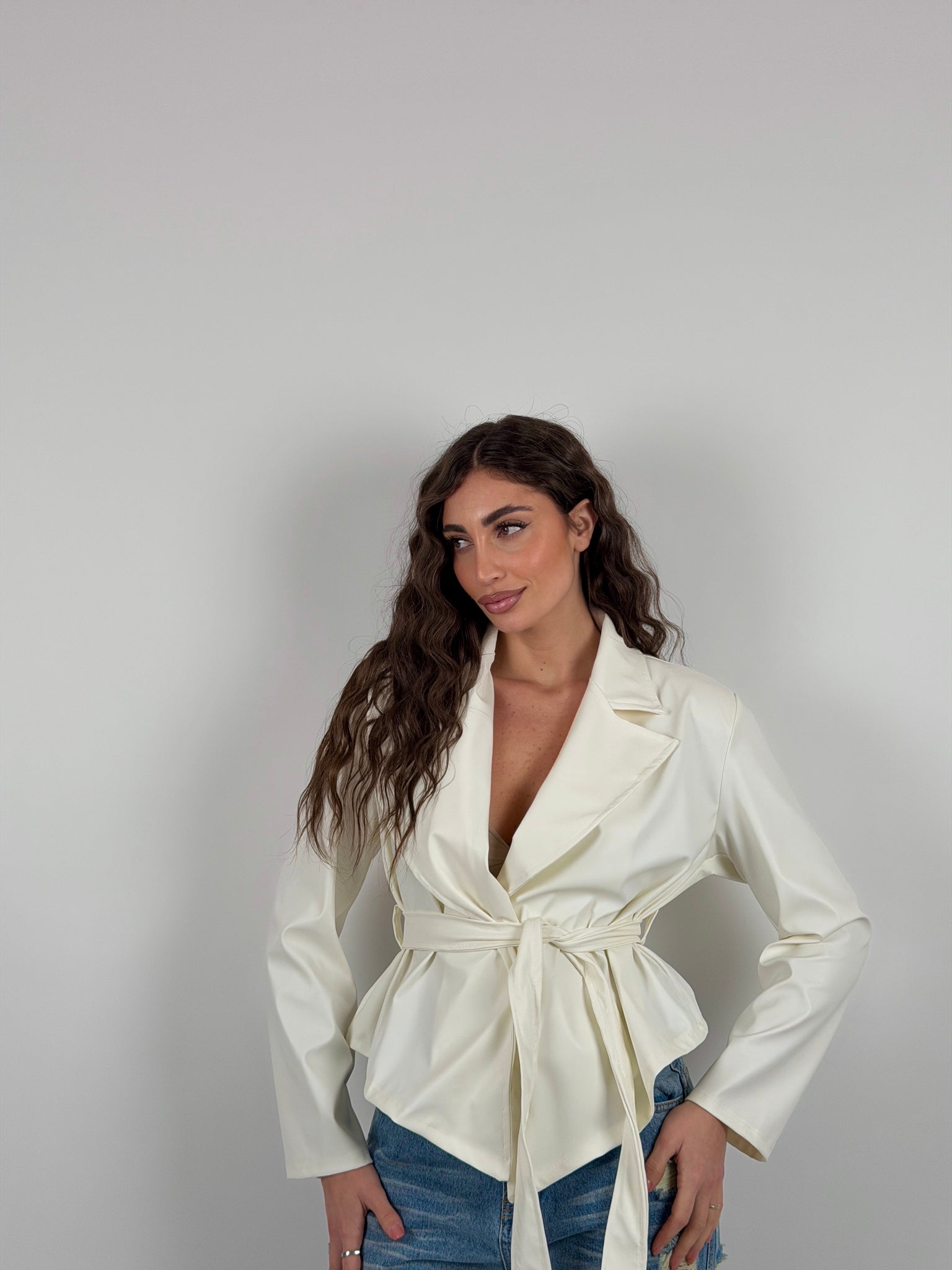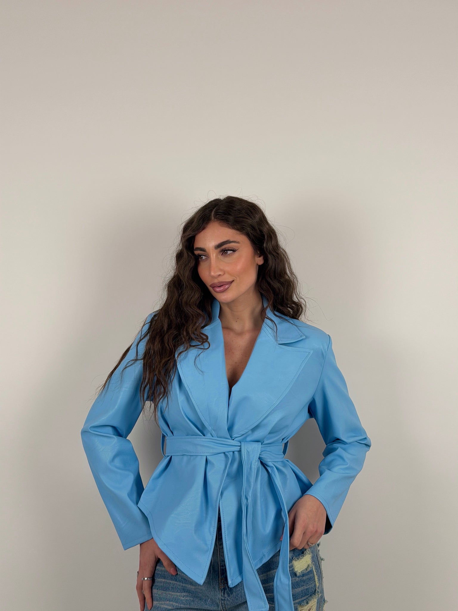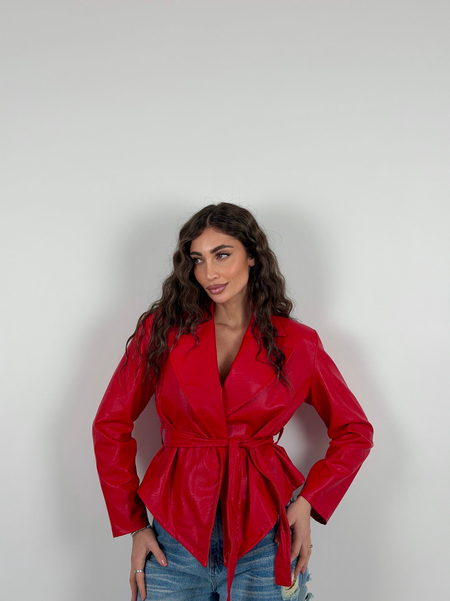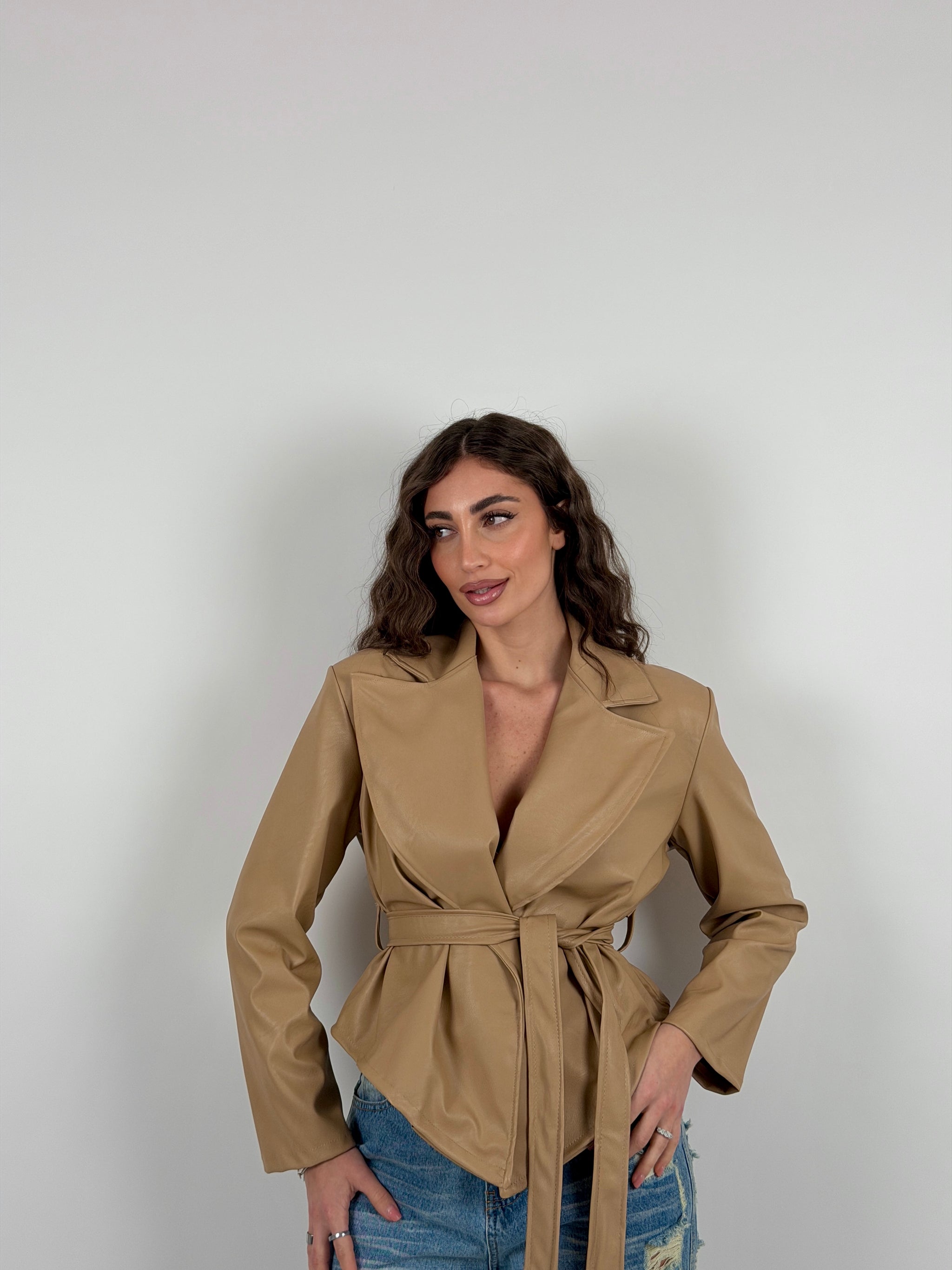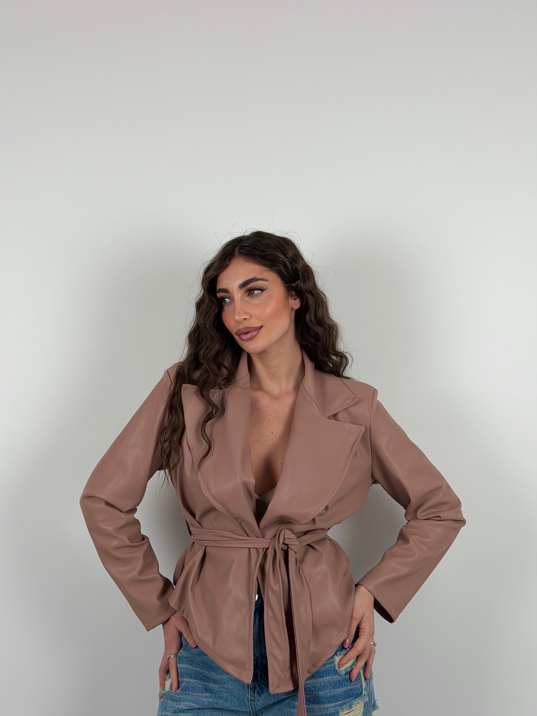 Giacca in ecopelle, foderato all’interno, chiusura con cintura in vita.