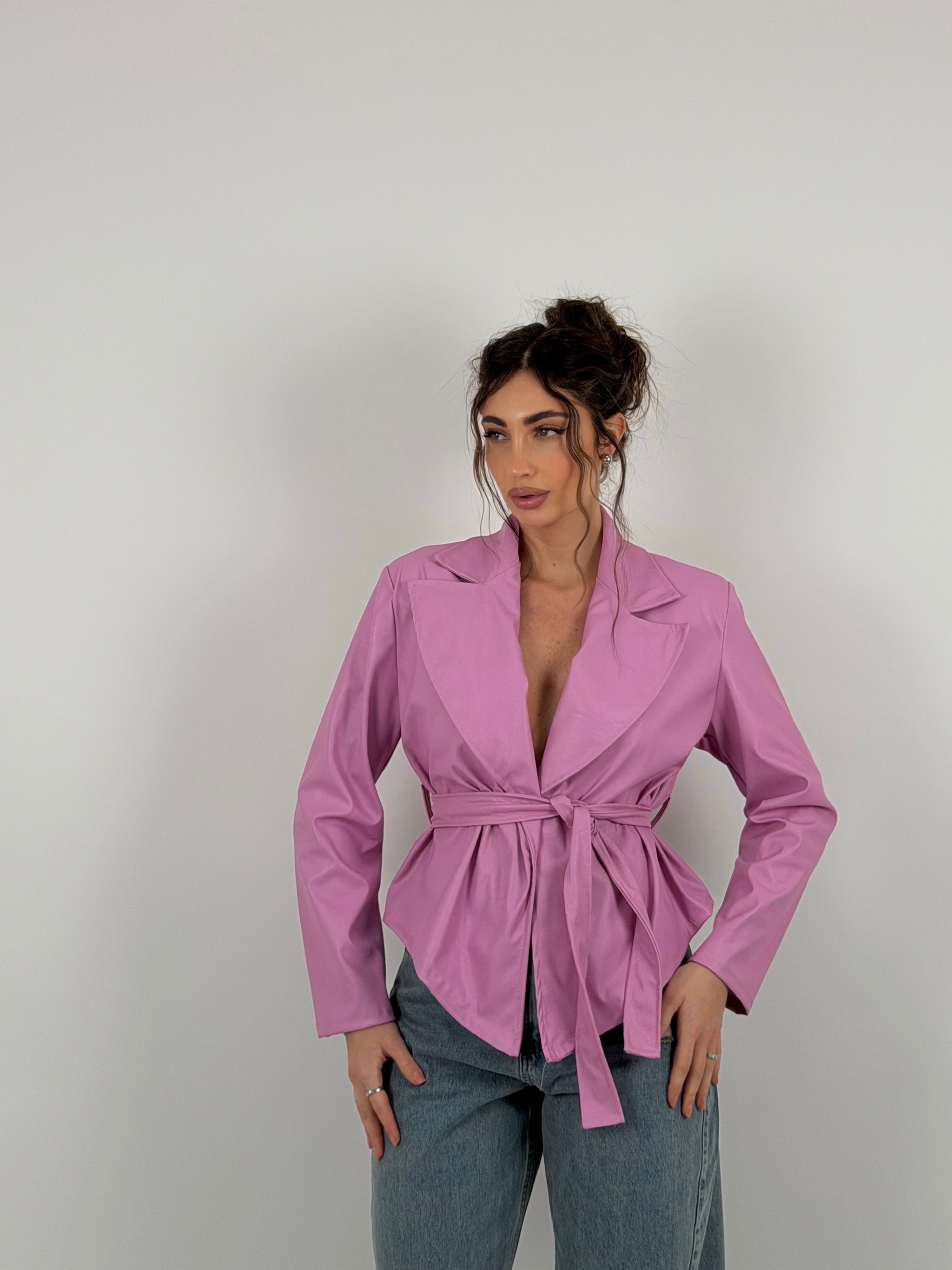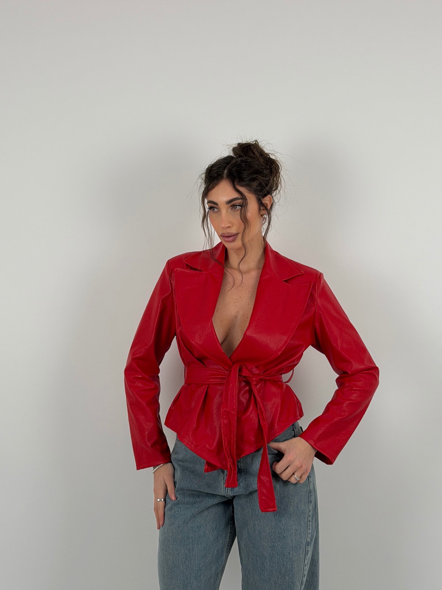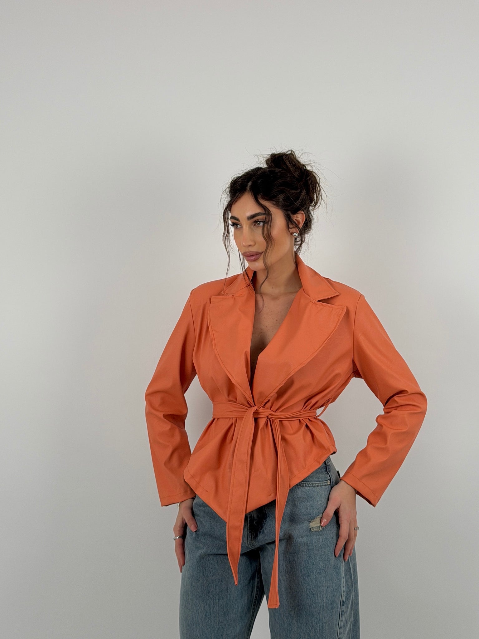 Giacca in ecopelle, NON foderato all’interno, chiusura con cintura in vita.