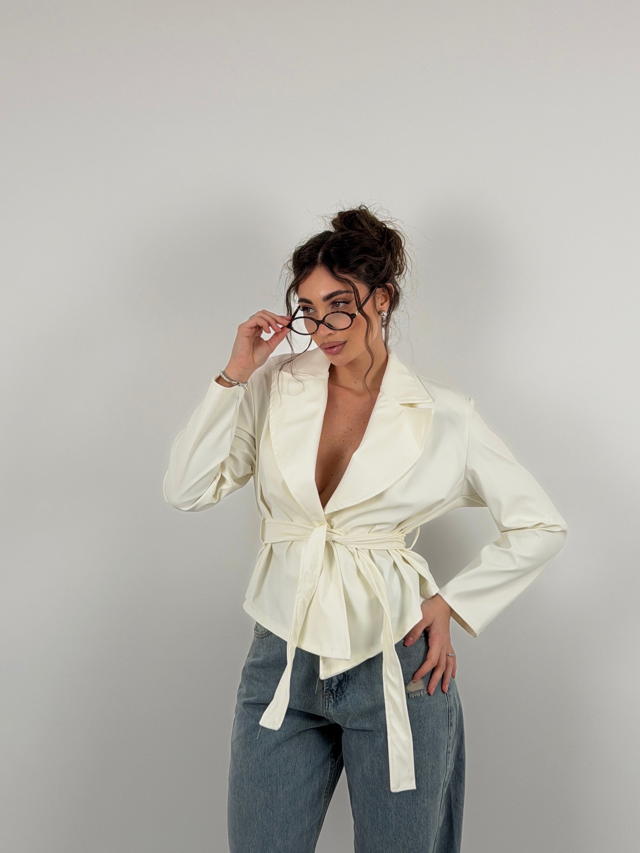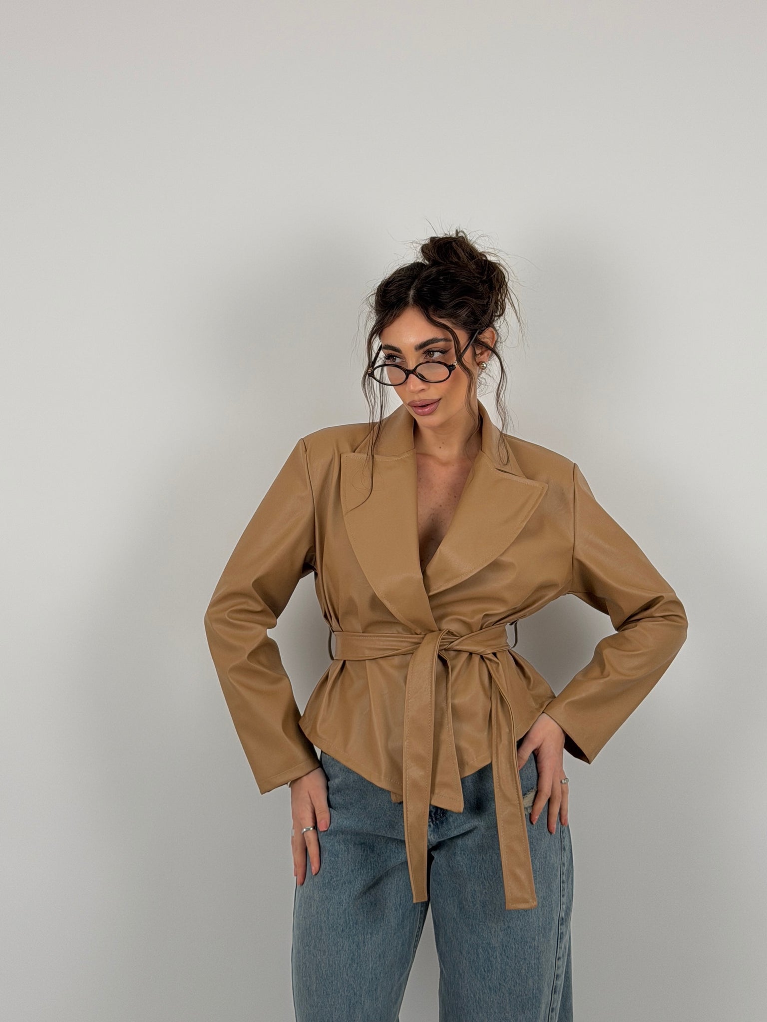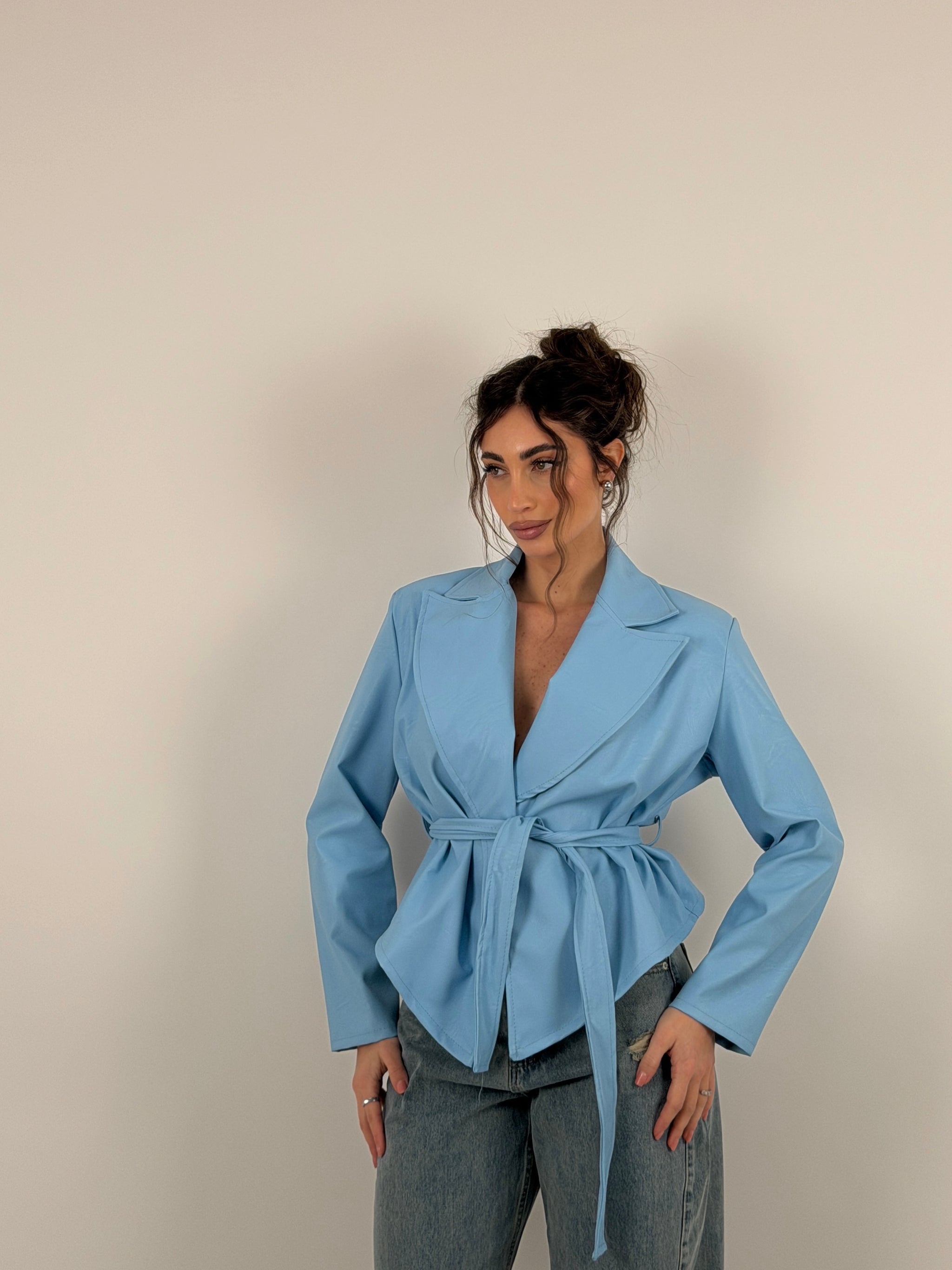 Giacca in ecopelle, NON foderato all’interno, chiusura con cintura in vita.