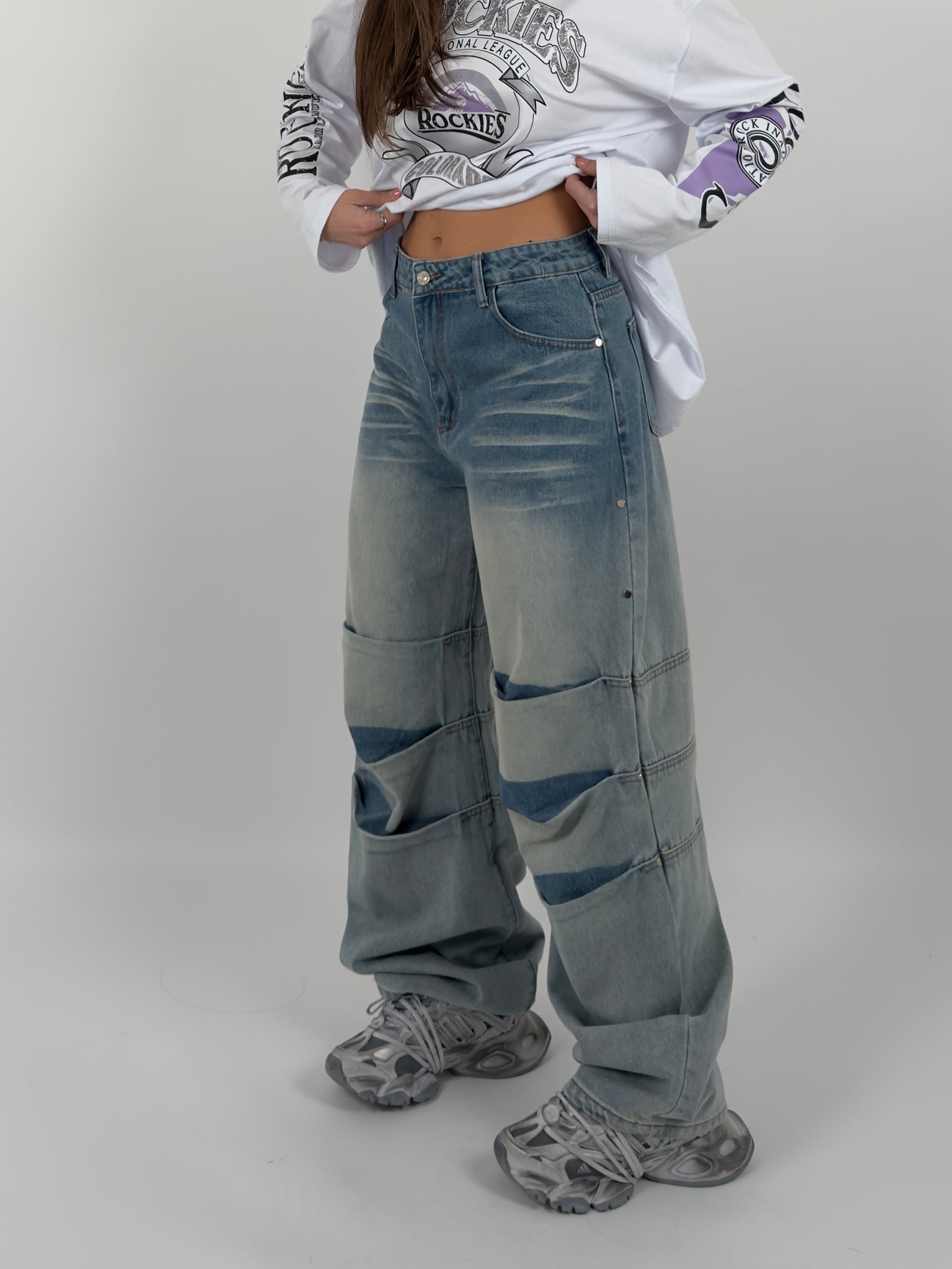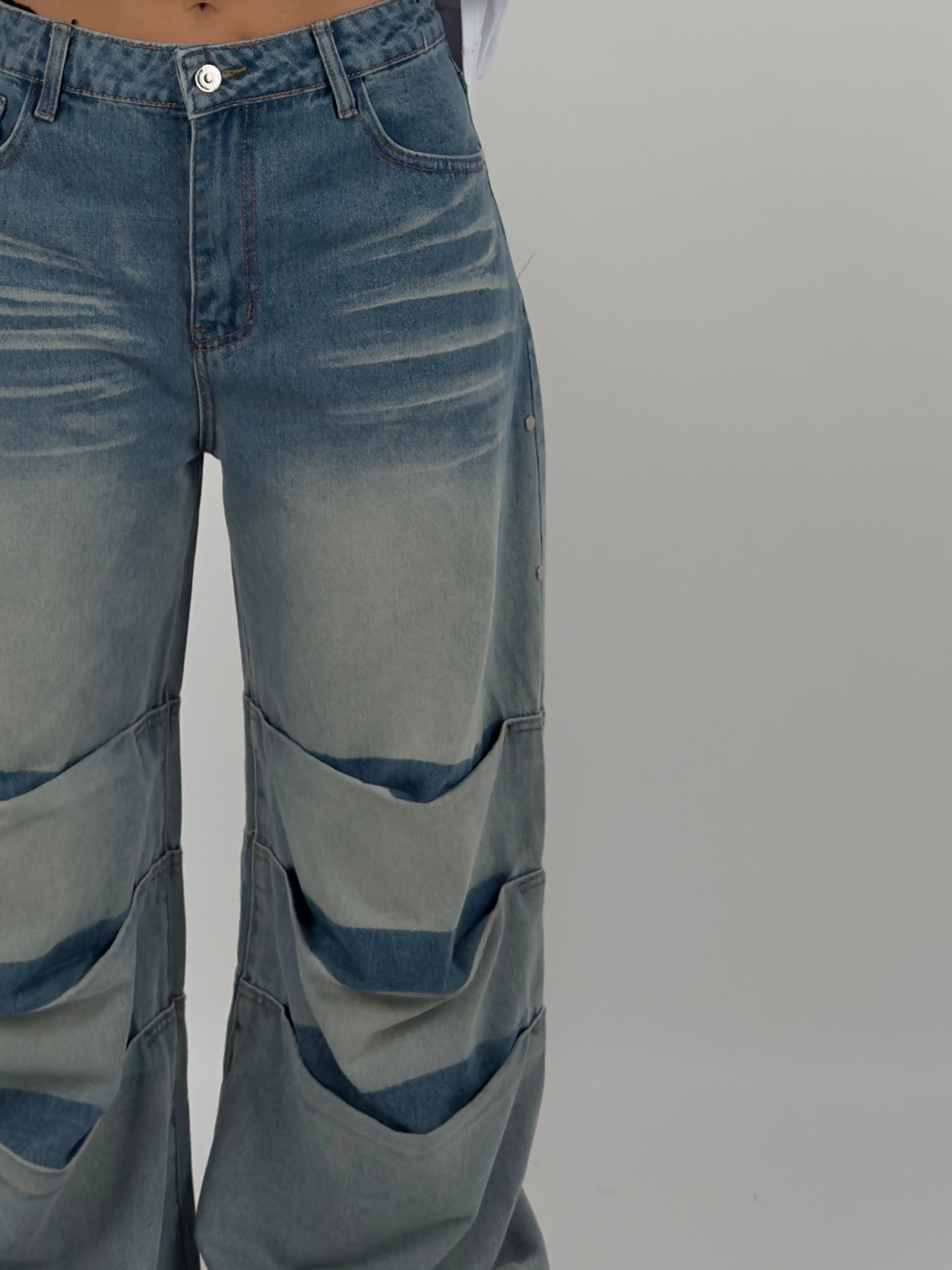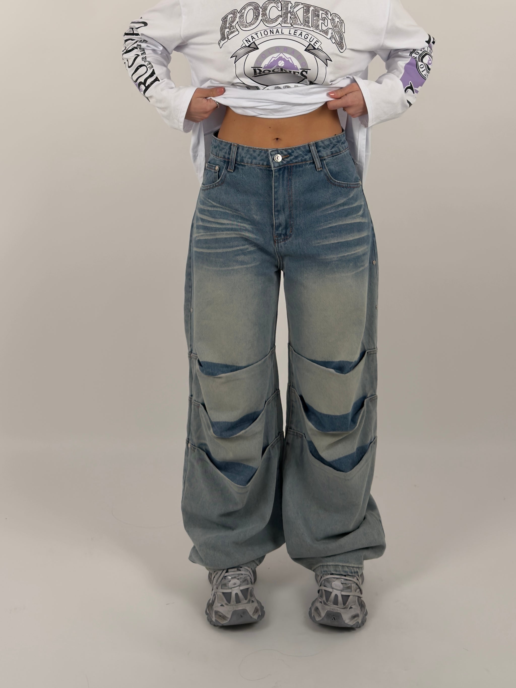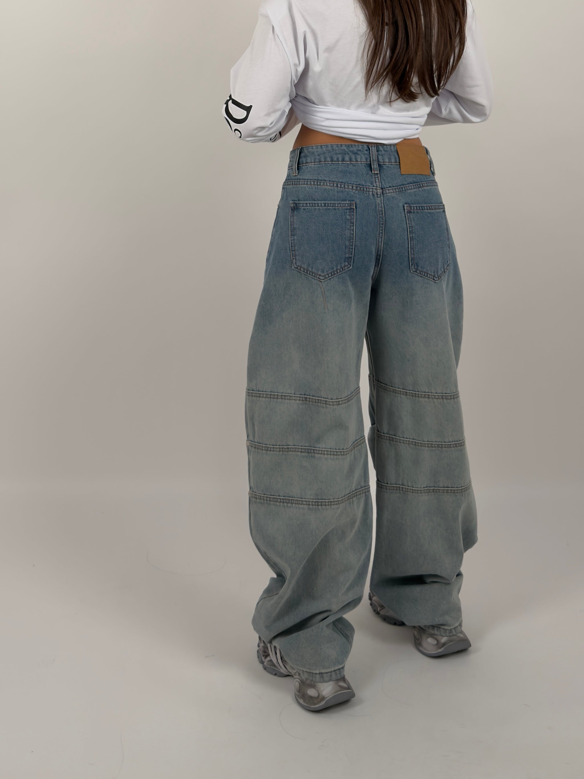 Jeans modello ballon, tessuto fermo, dettagli sul davanti e sul retro.