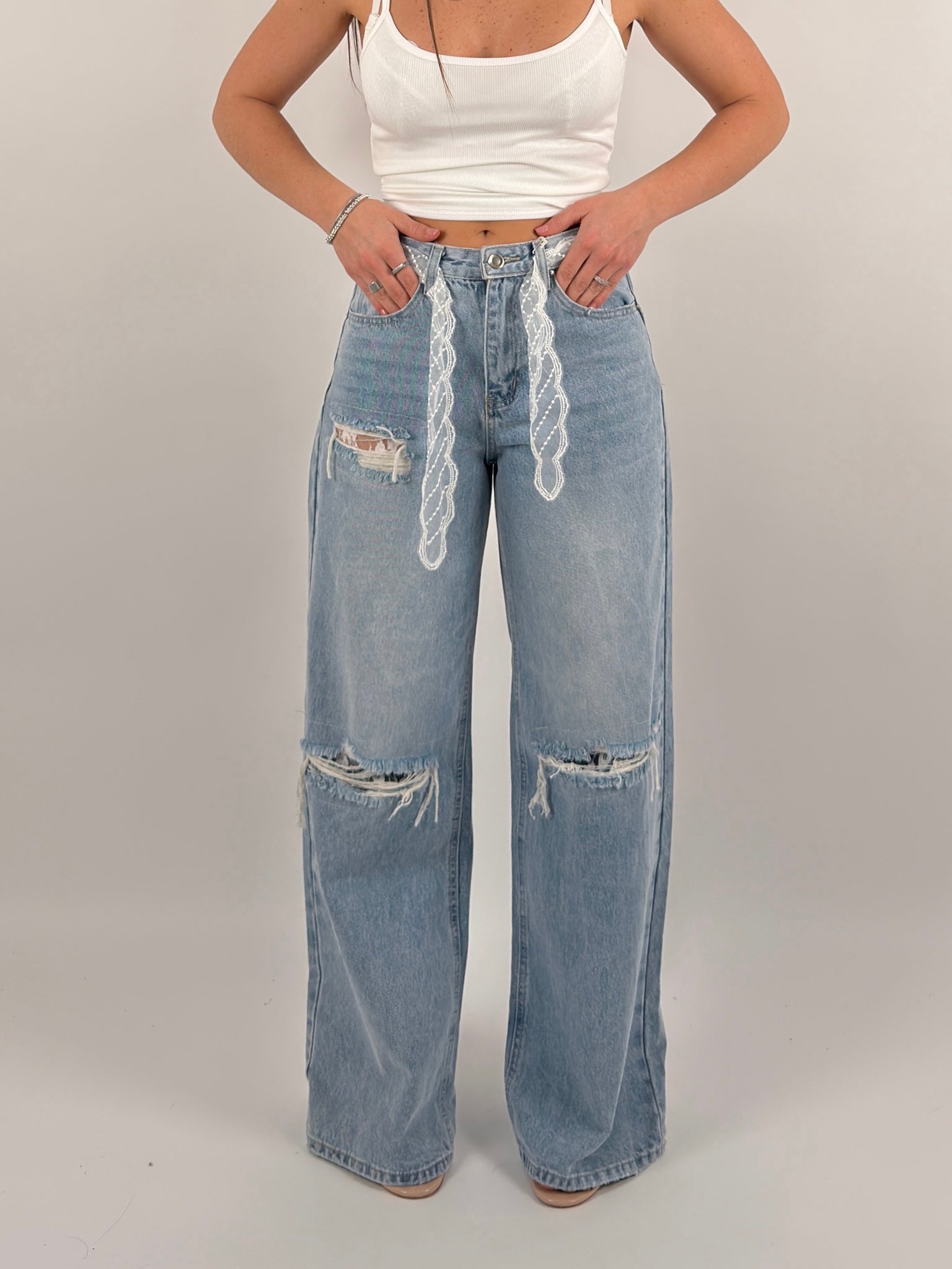 Jeans tessuto fermo, con strappi anteriori, foulard in vita