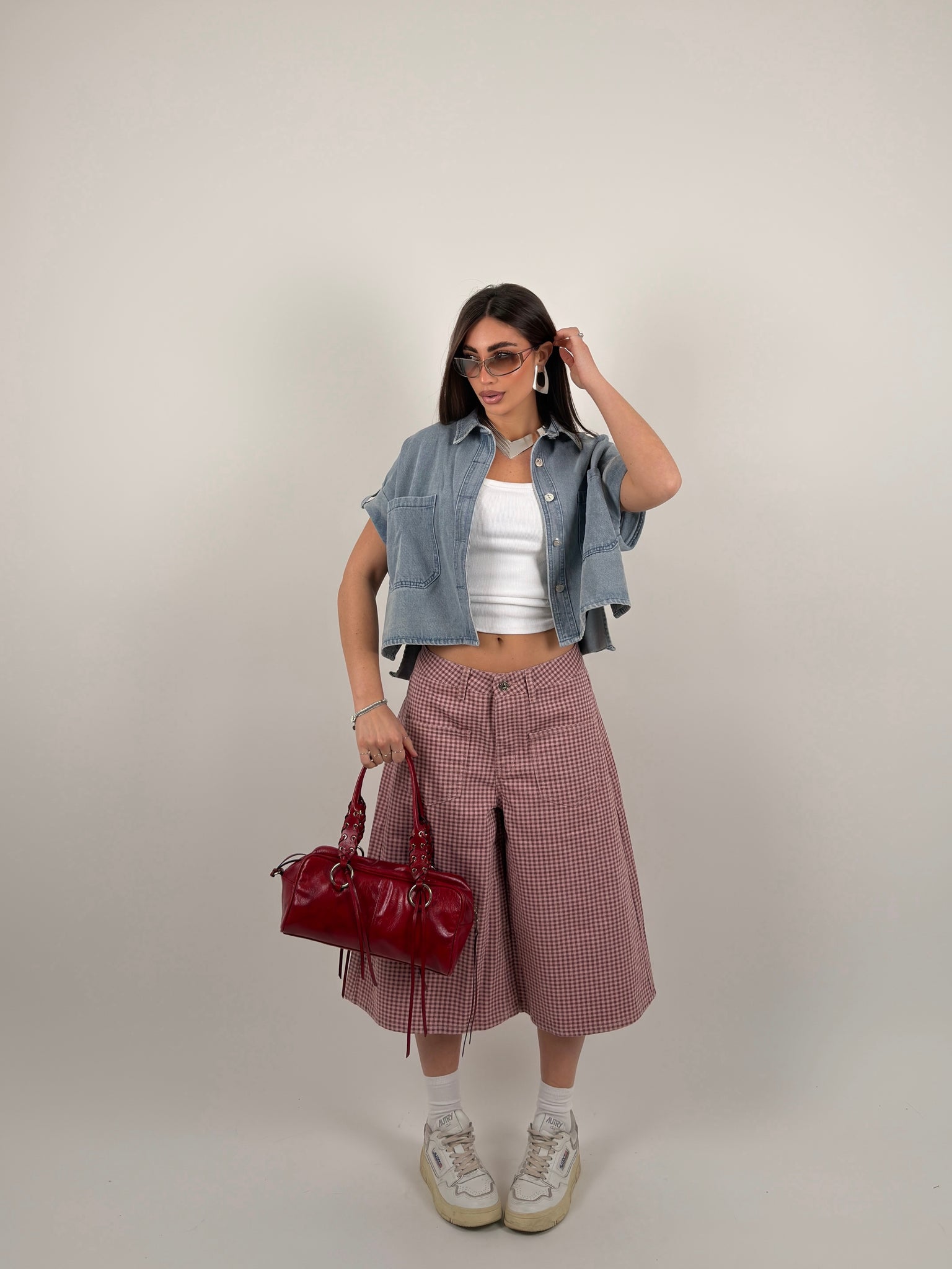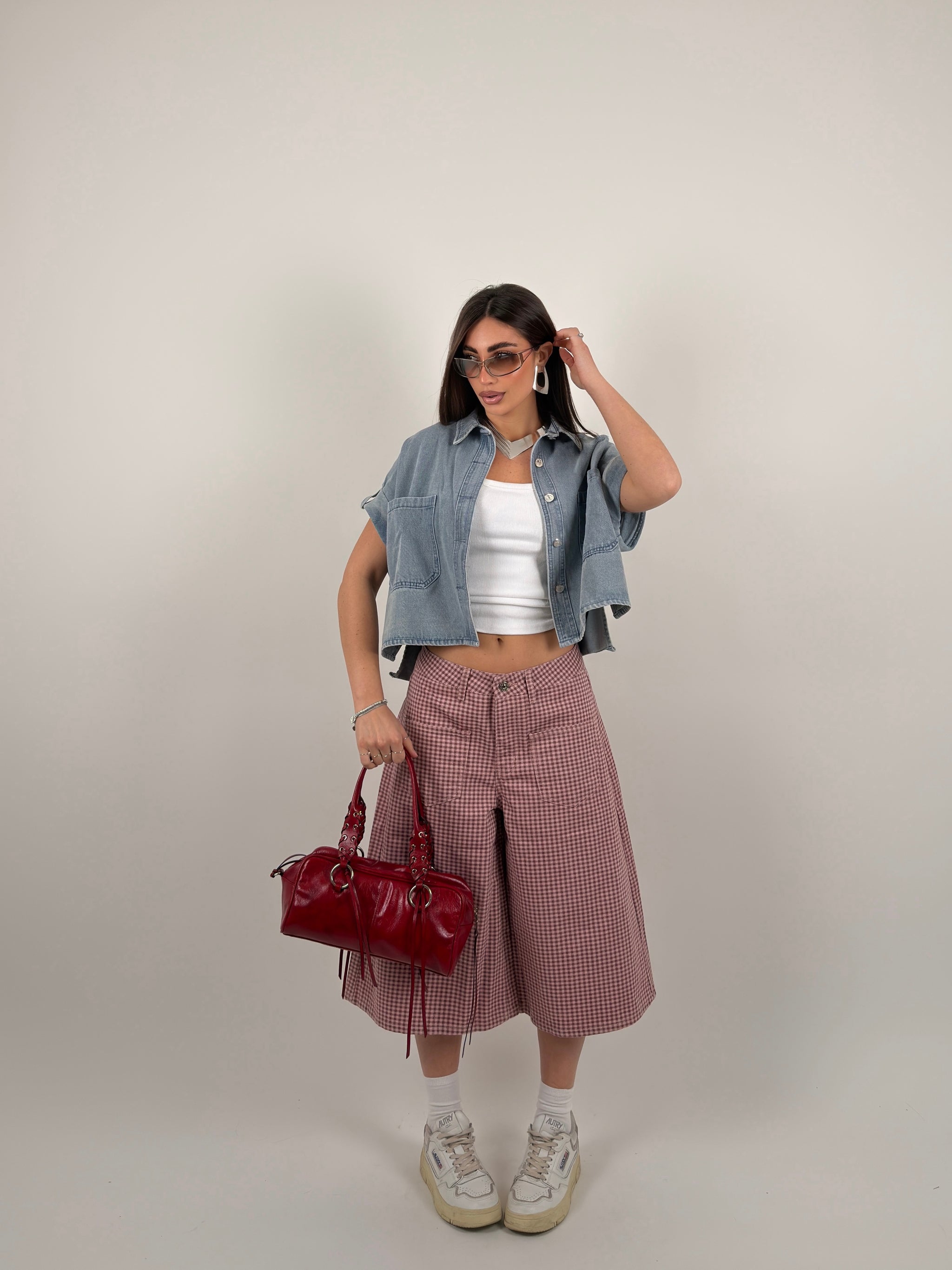 Jorts di jeans, baggy fit, tessuto fermo, taschini sul davanti  fantasia a quadri.