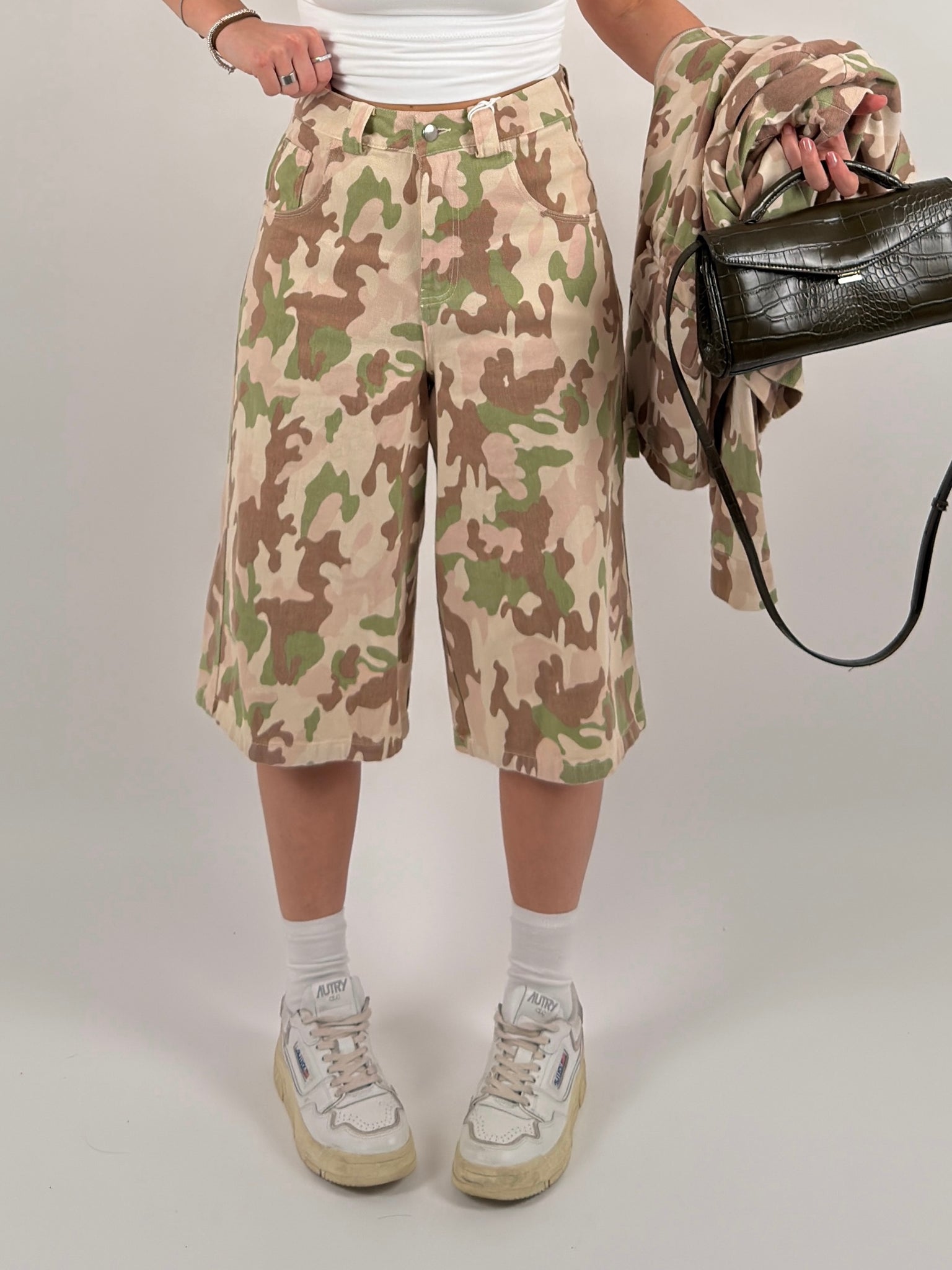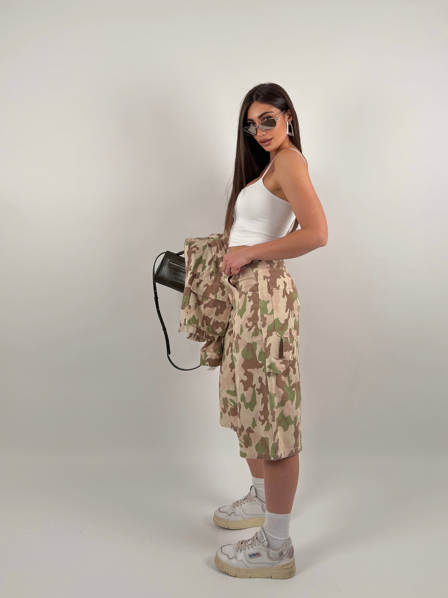 Jorts in denim fermo, fantasia mimetica, modello carpenter