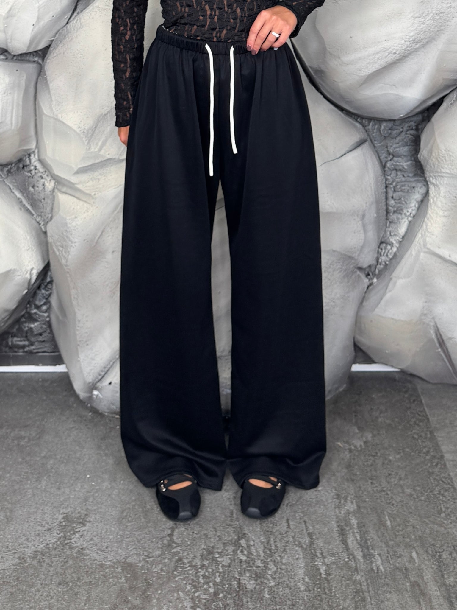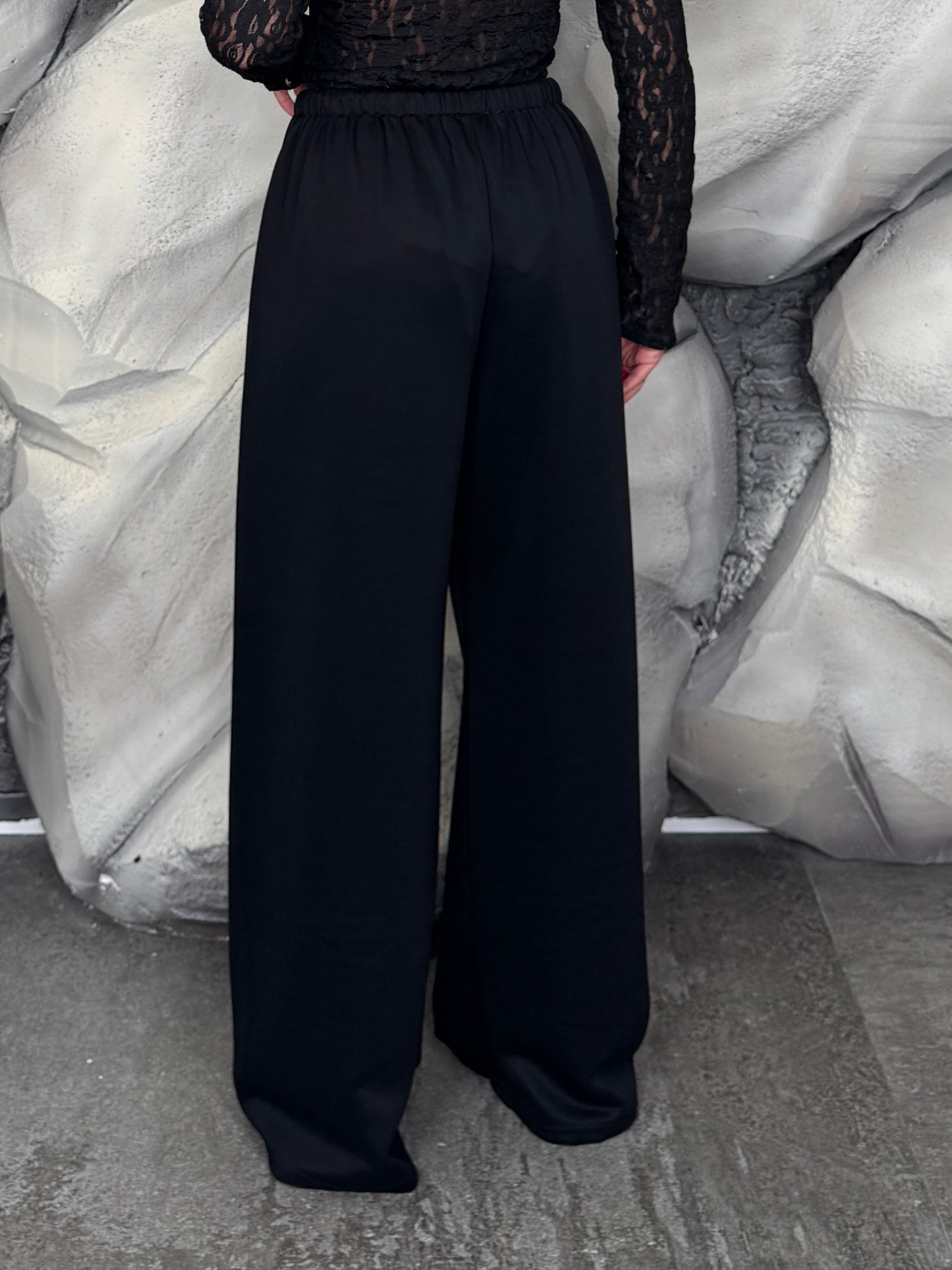 Pantalone palazzo con elastico in vita e lacci, regolabile. Tessuto comodo ed elastico