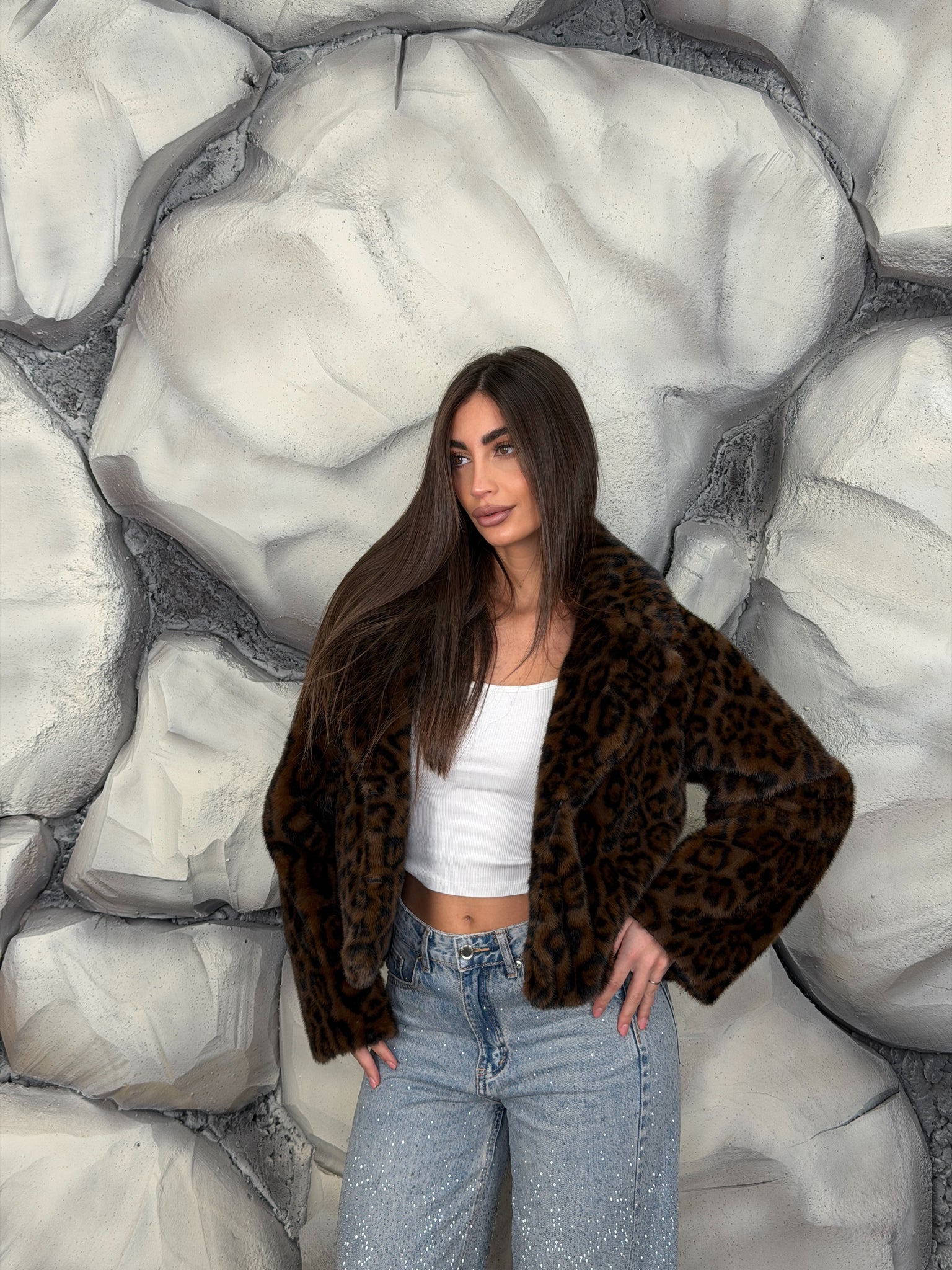 Pelliccia foderata all’interno e gancetti sul davanti per la chiusura, fantasia leopardata.
