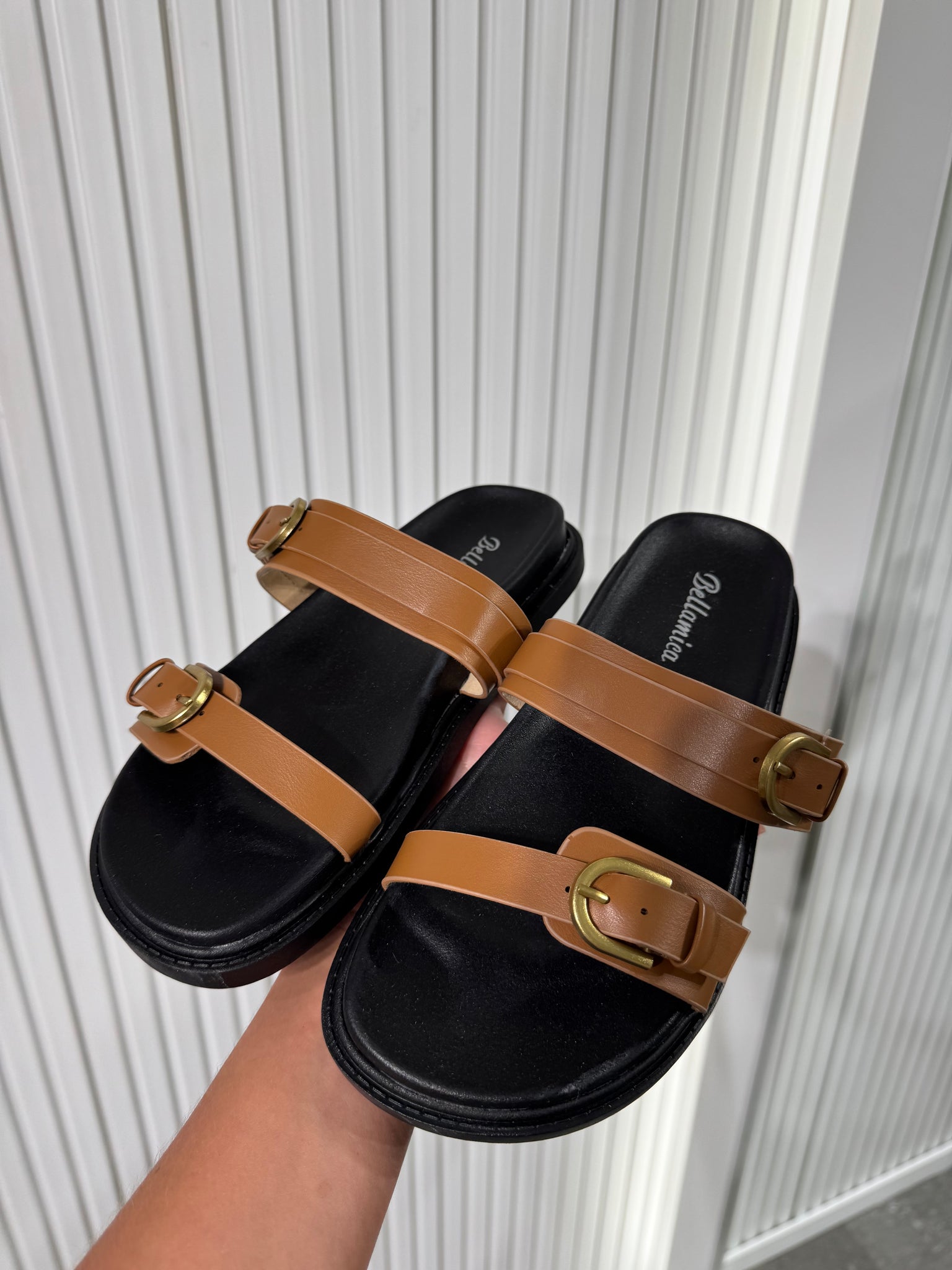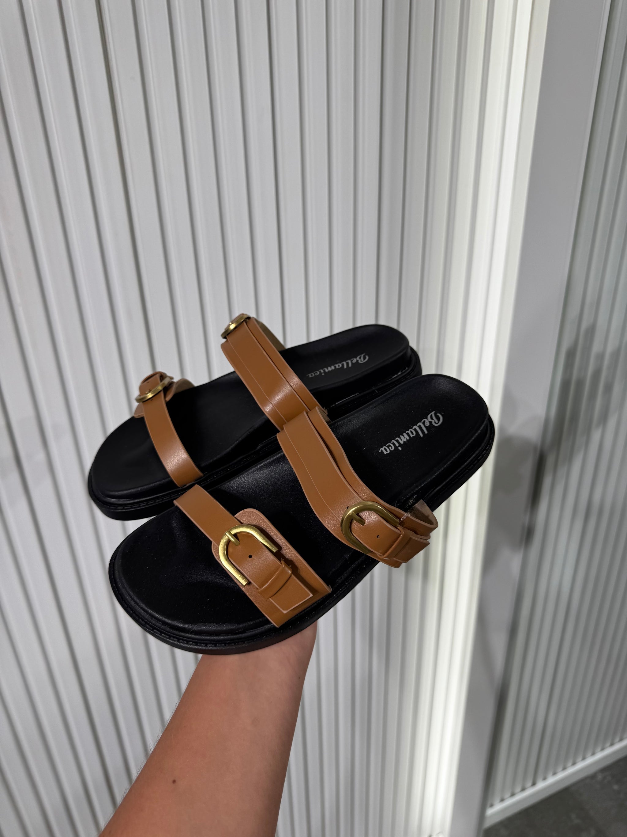 Ciabatta di ecopelle, con doppio cinturino regolabile.