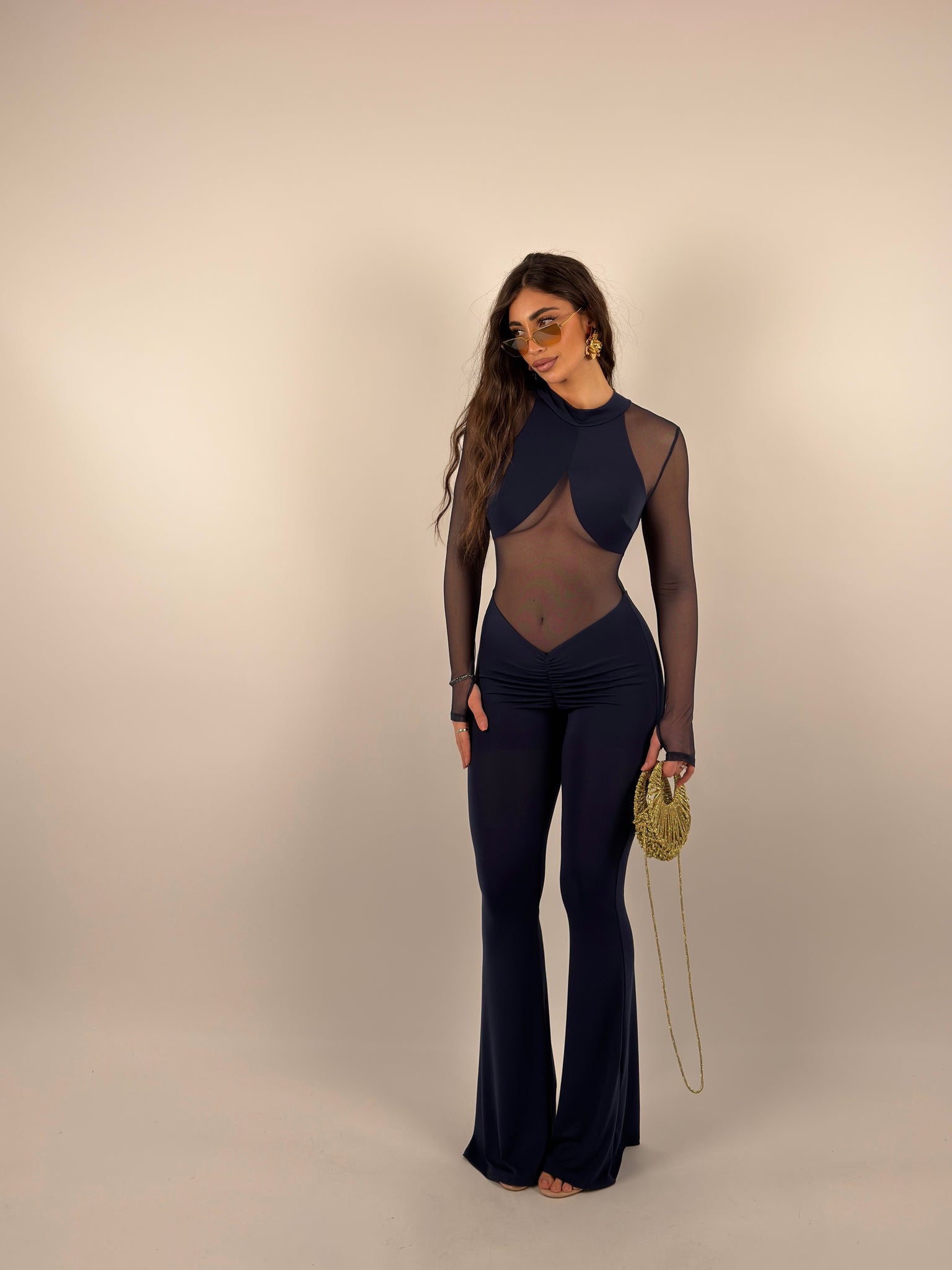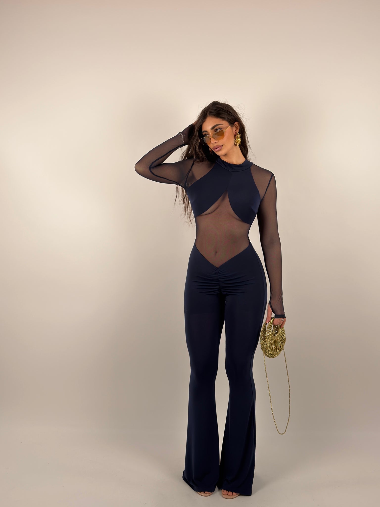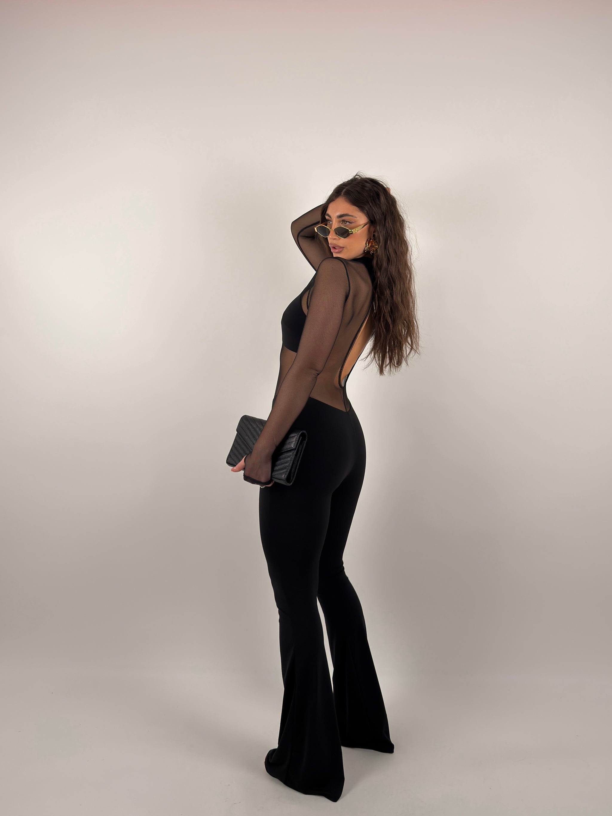 Tuta di lycra e velo, parte superiore completamente velata con scollo sul retro, scende a zampa.