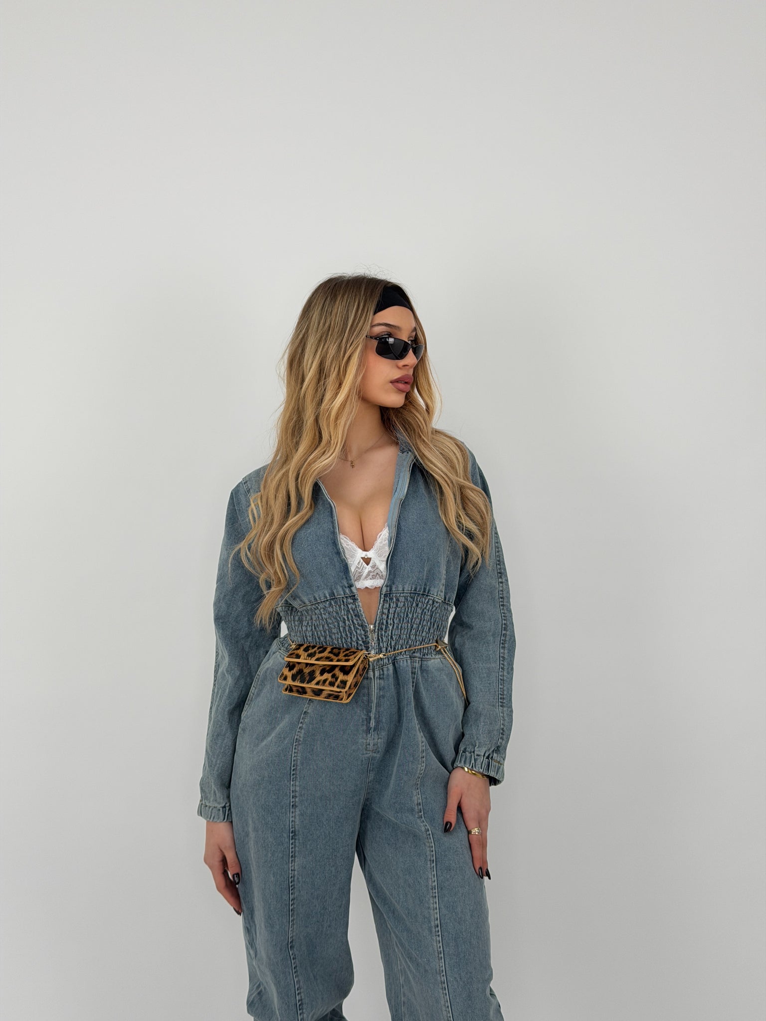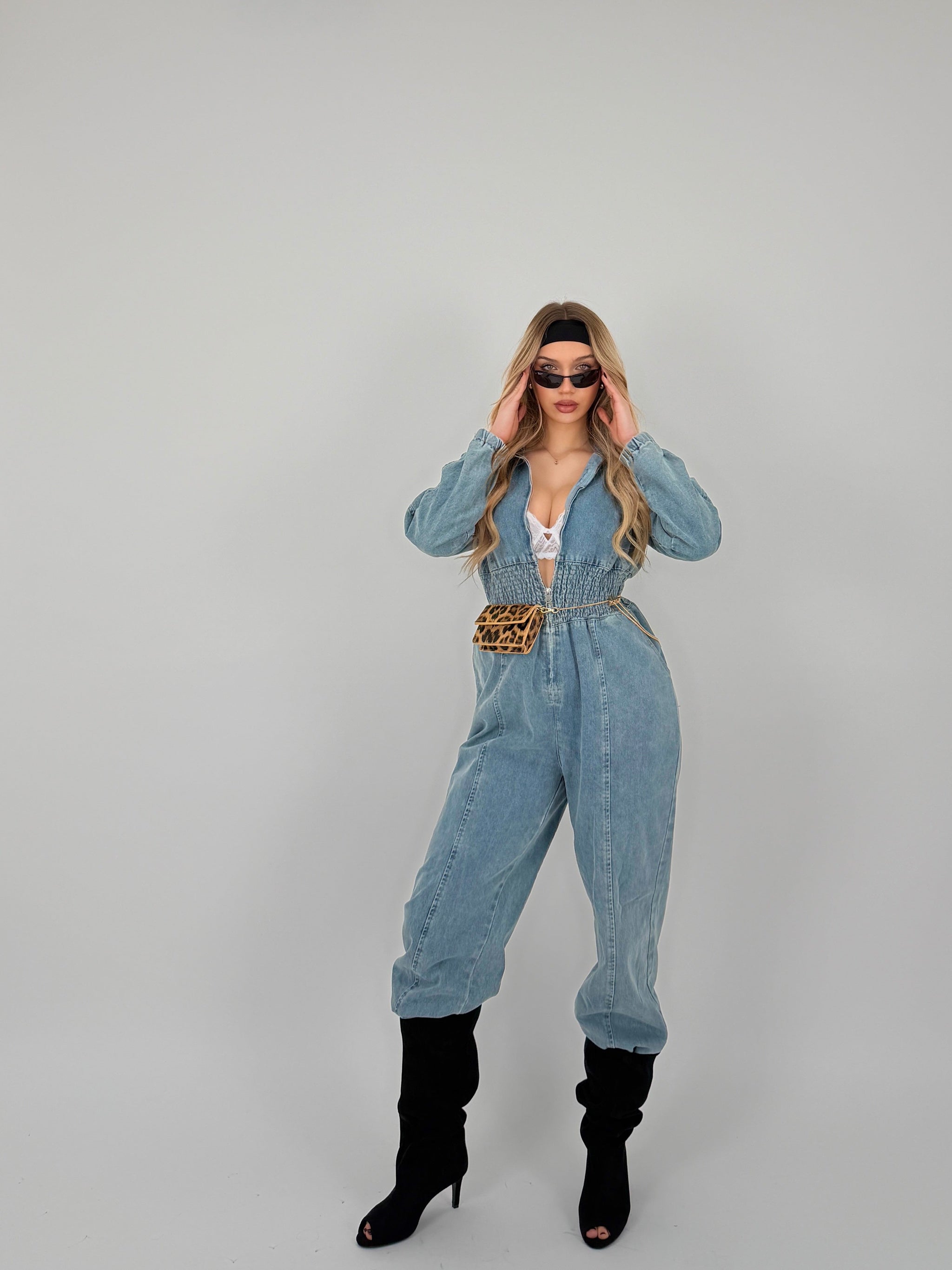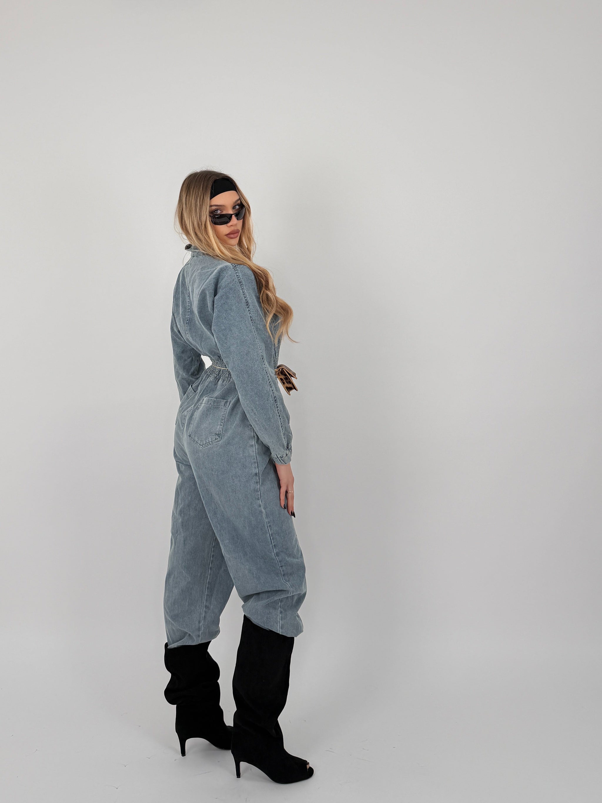 Tuta lunga di jeans, elastico in vita sui polsini e sulle caviglie, cuciture in evidenza, zip sul davanti.