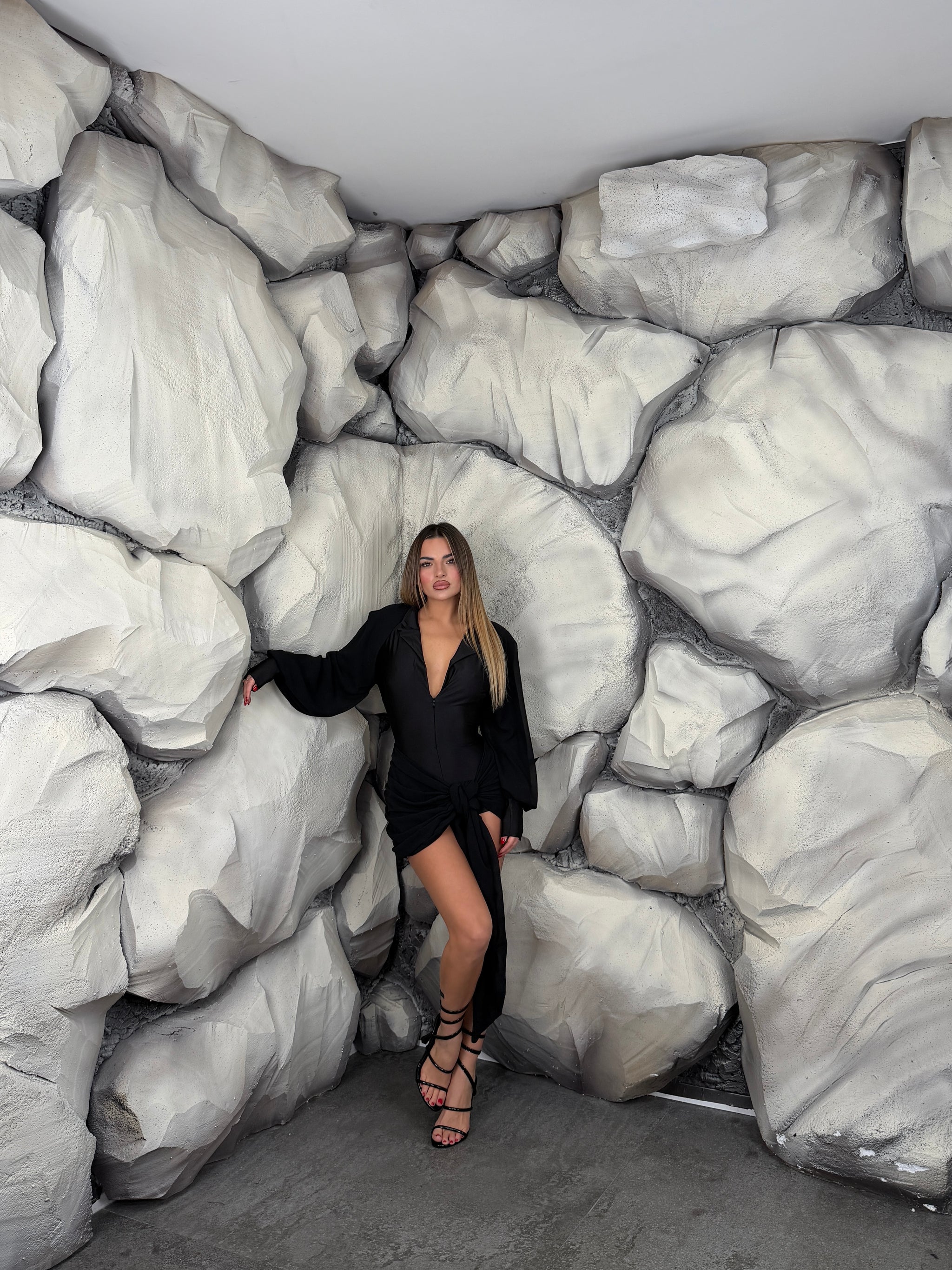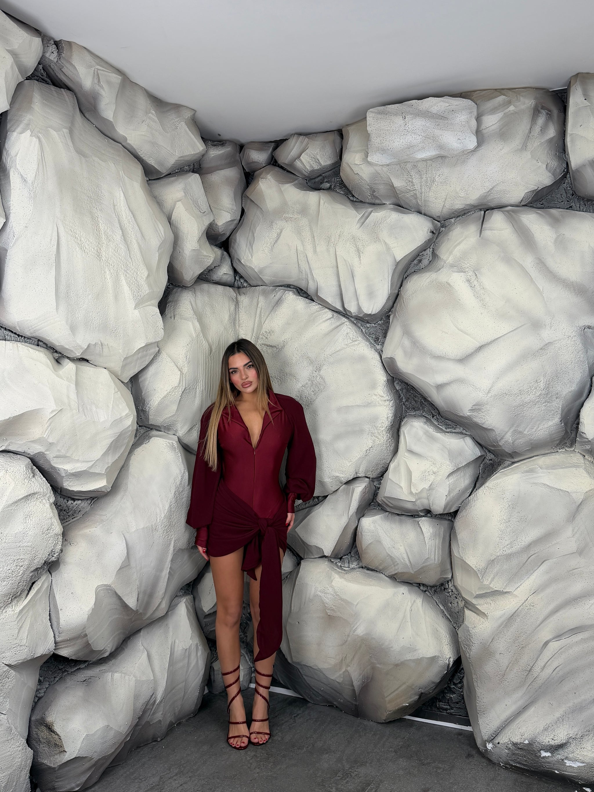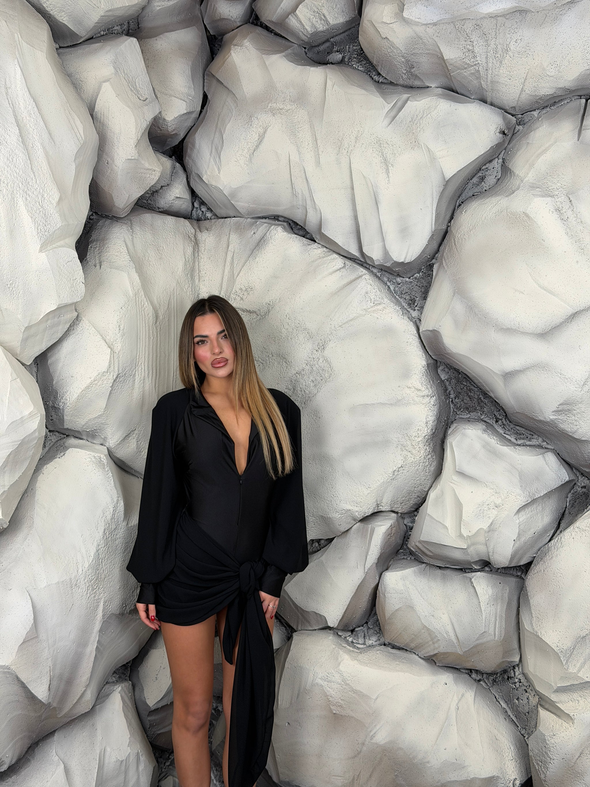 Tutina in lycra, con scollo a “V”, zip sul davanti e colletto, dettaglio inserti di tessuto, manica lunga a sbuffo.