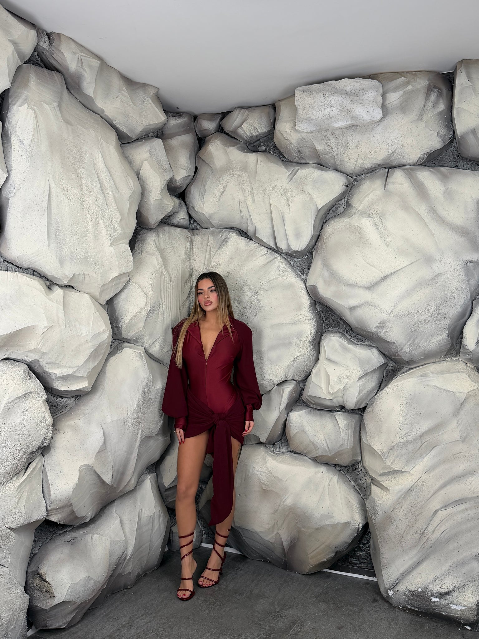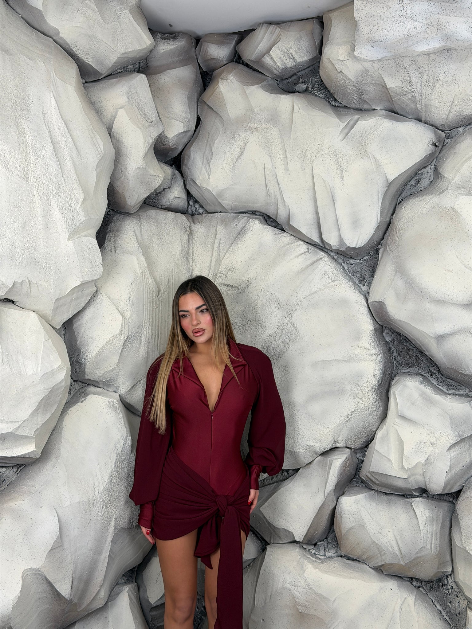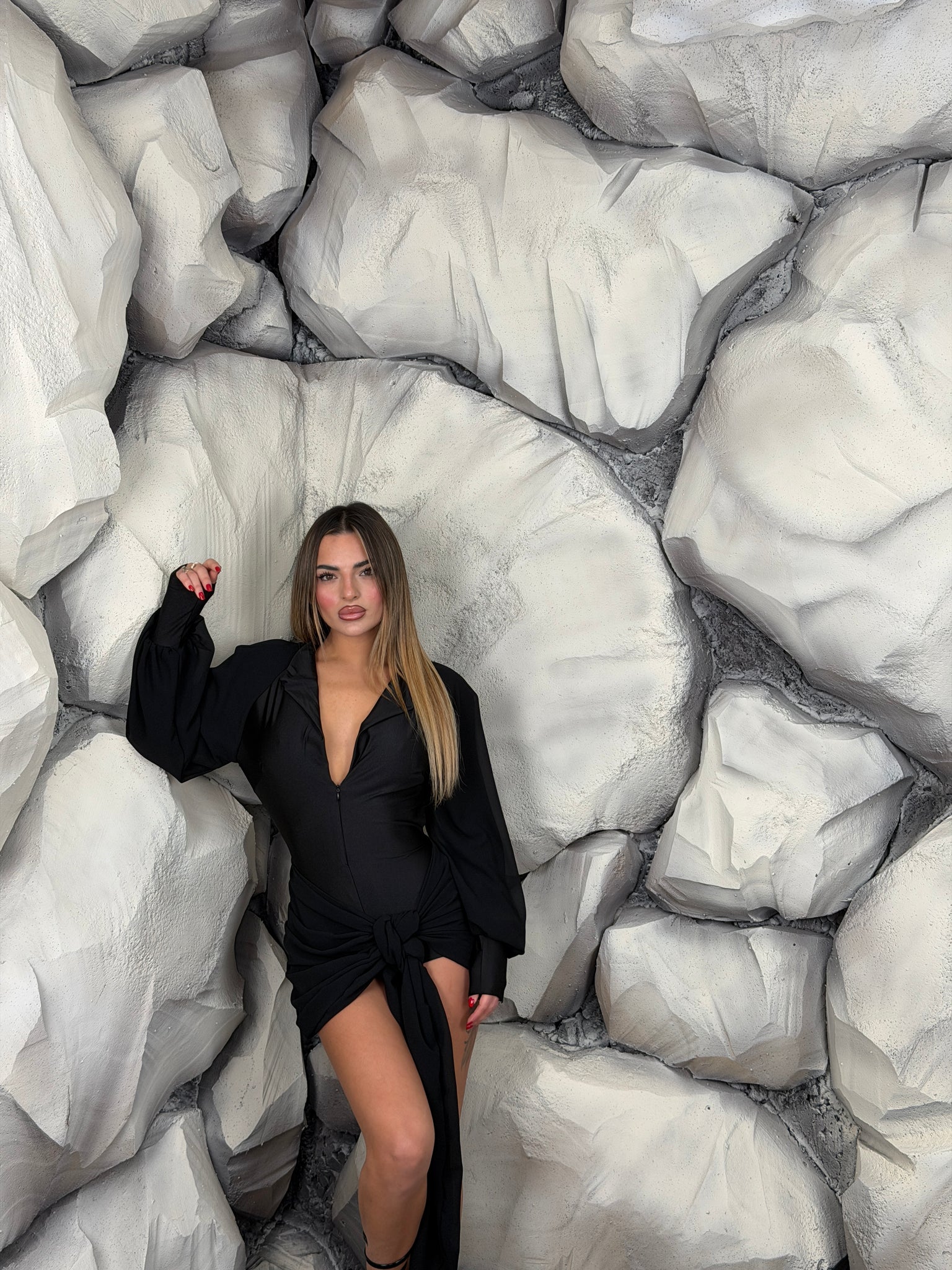 Tutina in lycra, con scollo a “V”, zip sul davanti e colletto, dettaglio inserti di tessuto, manica lunga a sbuffo.