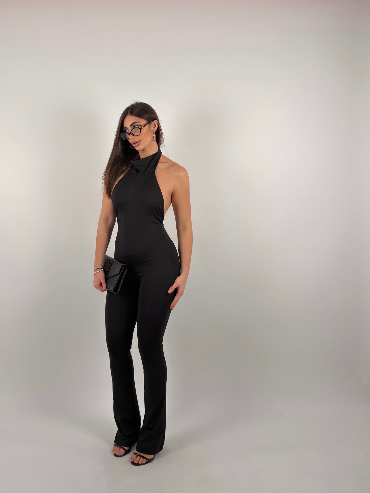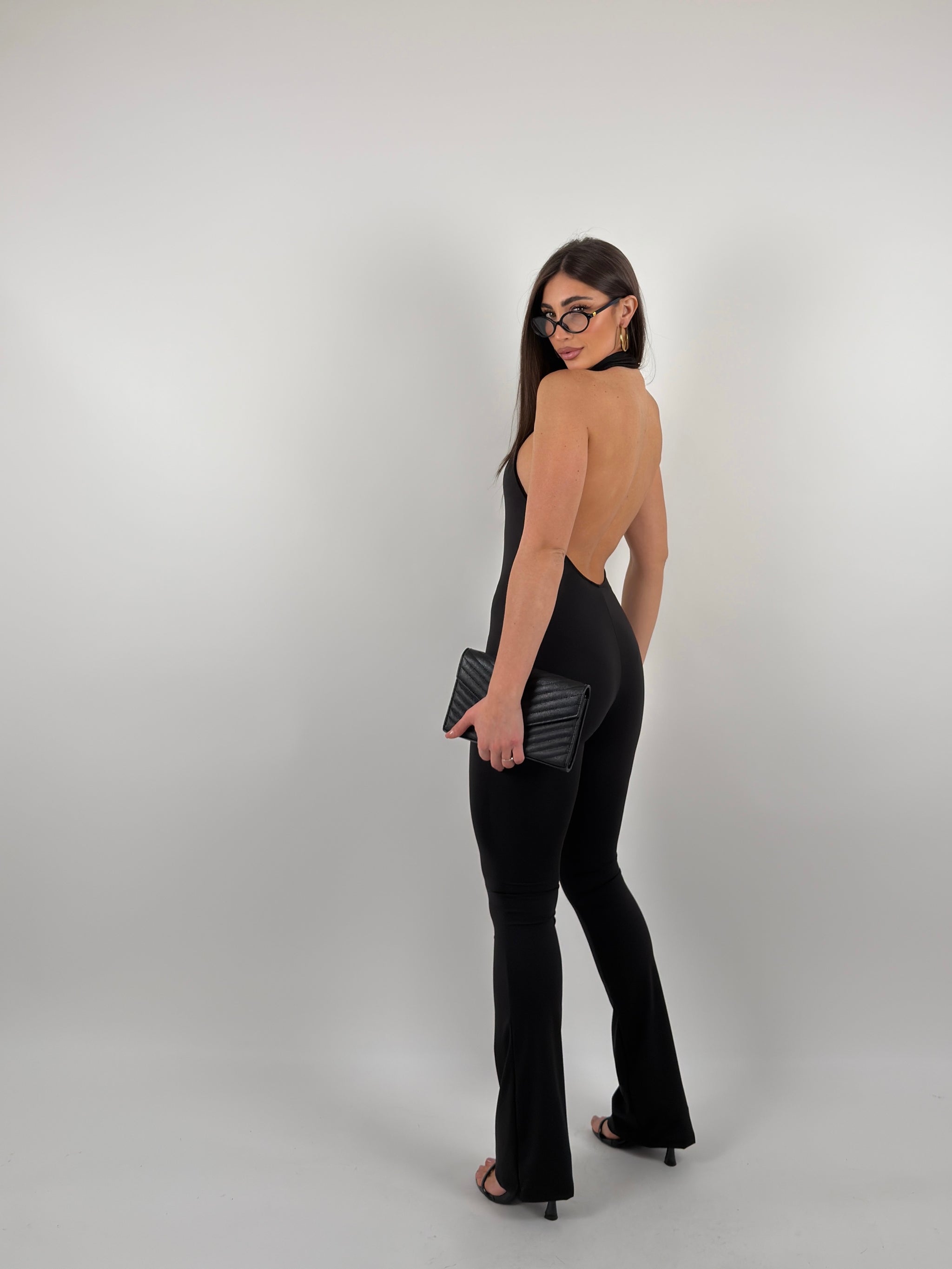 Tutina in lycra, va al collo, scollata sul retro, scende a zampa.