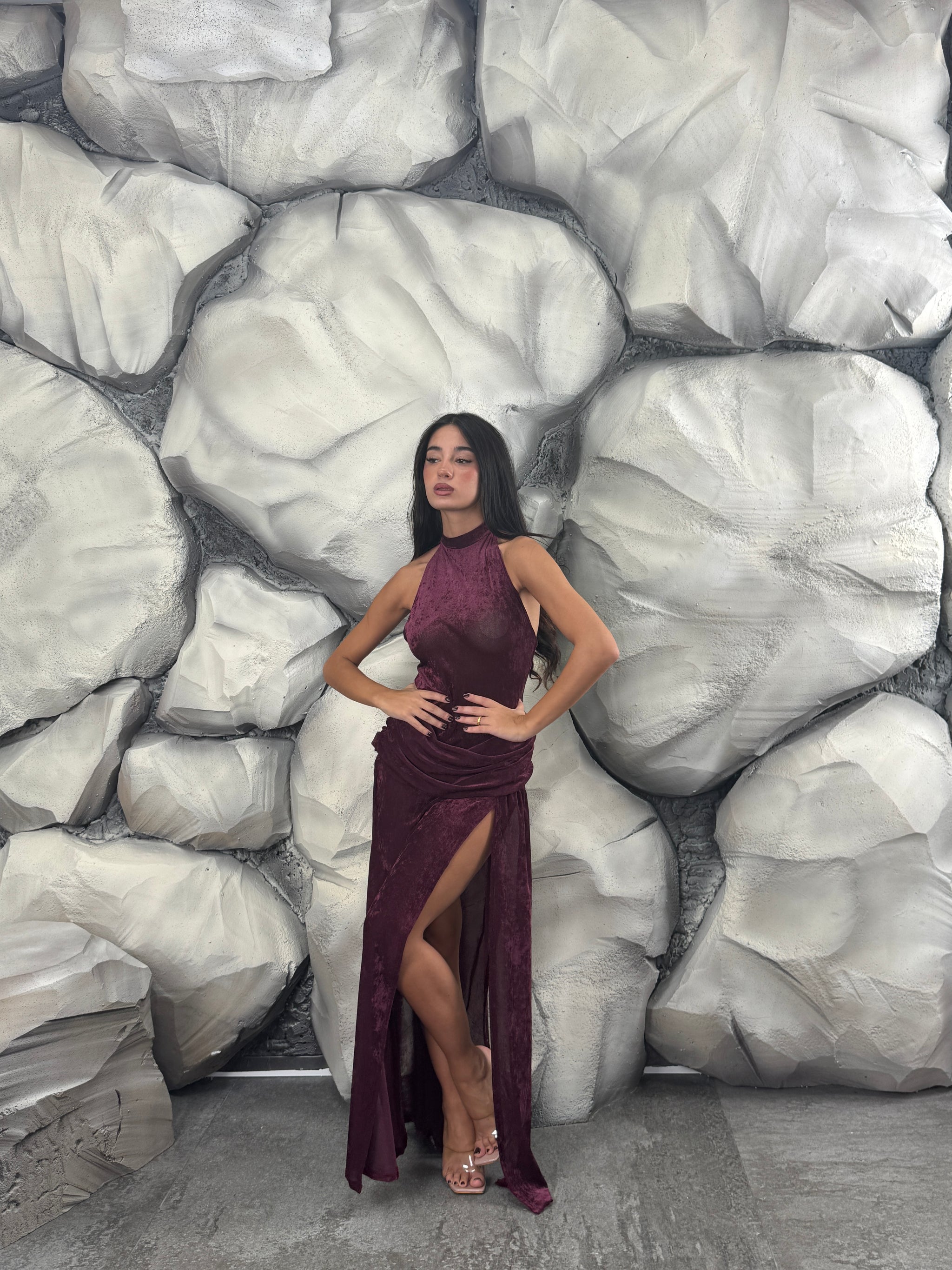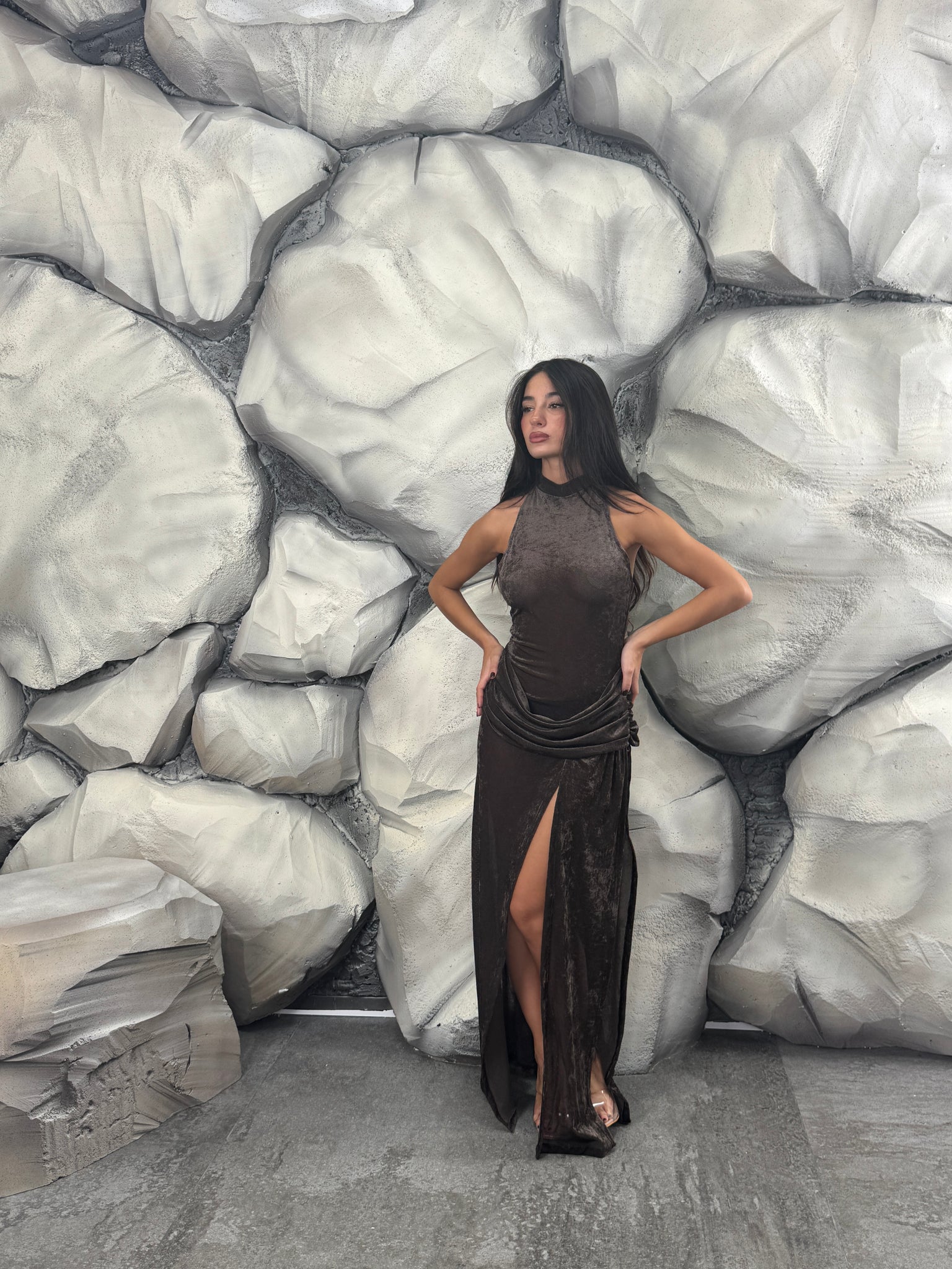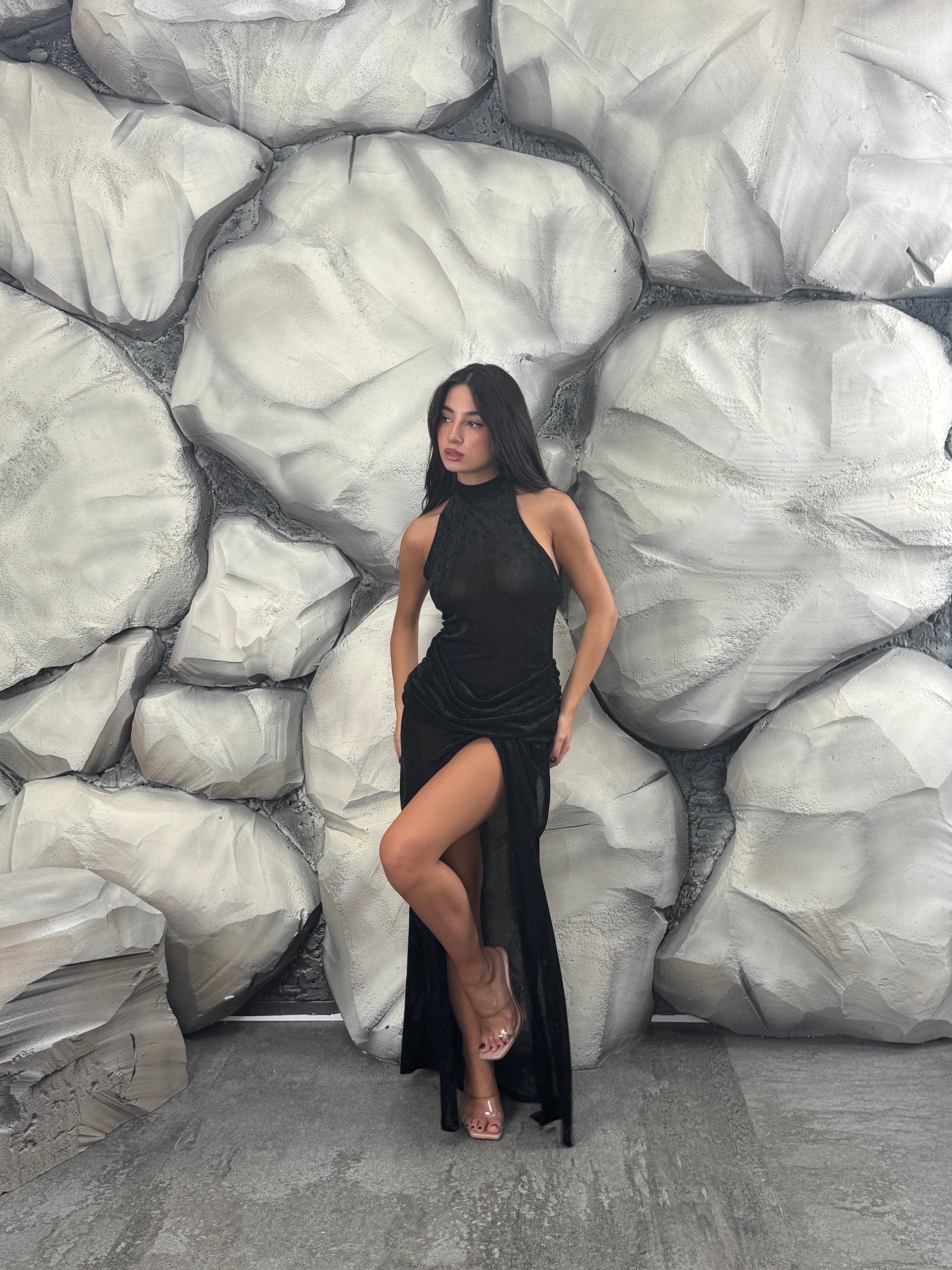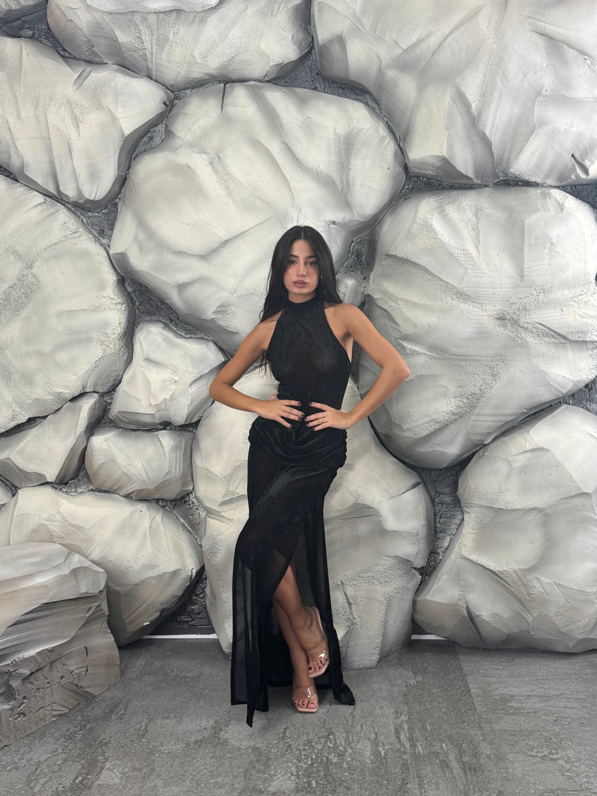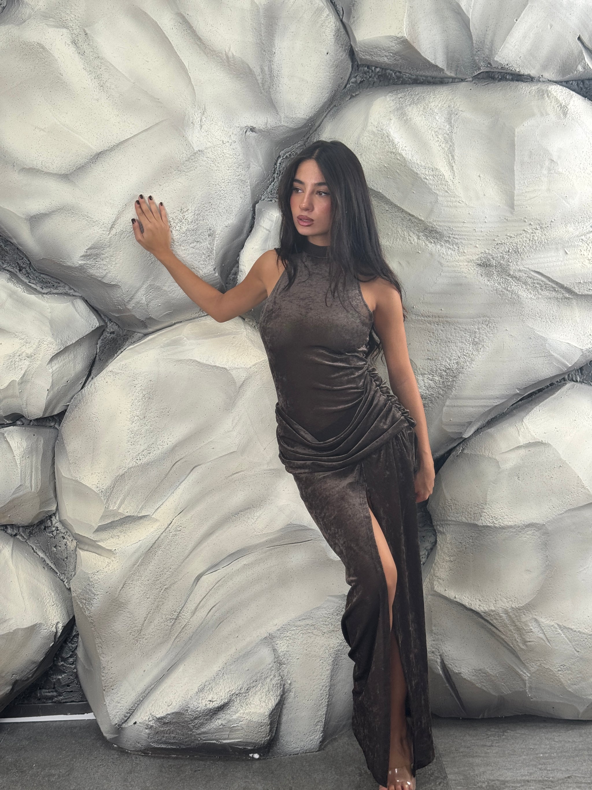 Vestito lungo di vellutino velato, scollo americano, dettaglio intreccio in vita, spacco sul davanti.