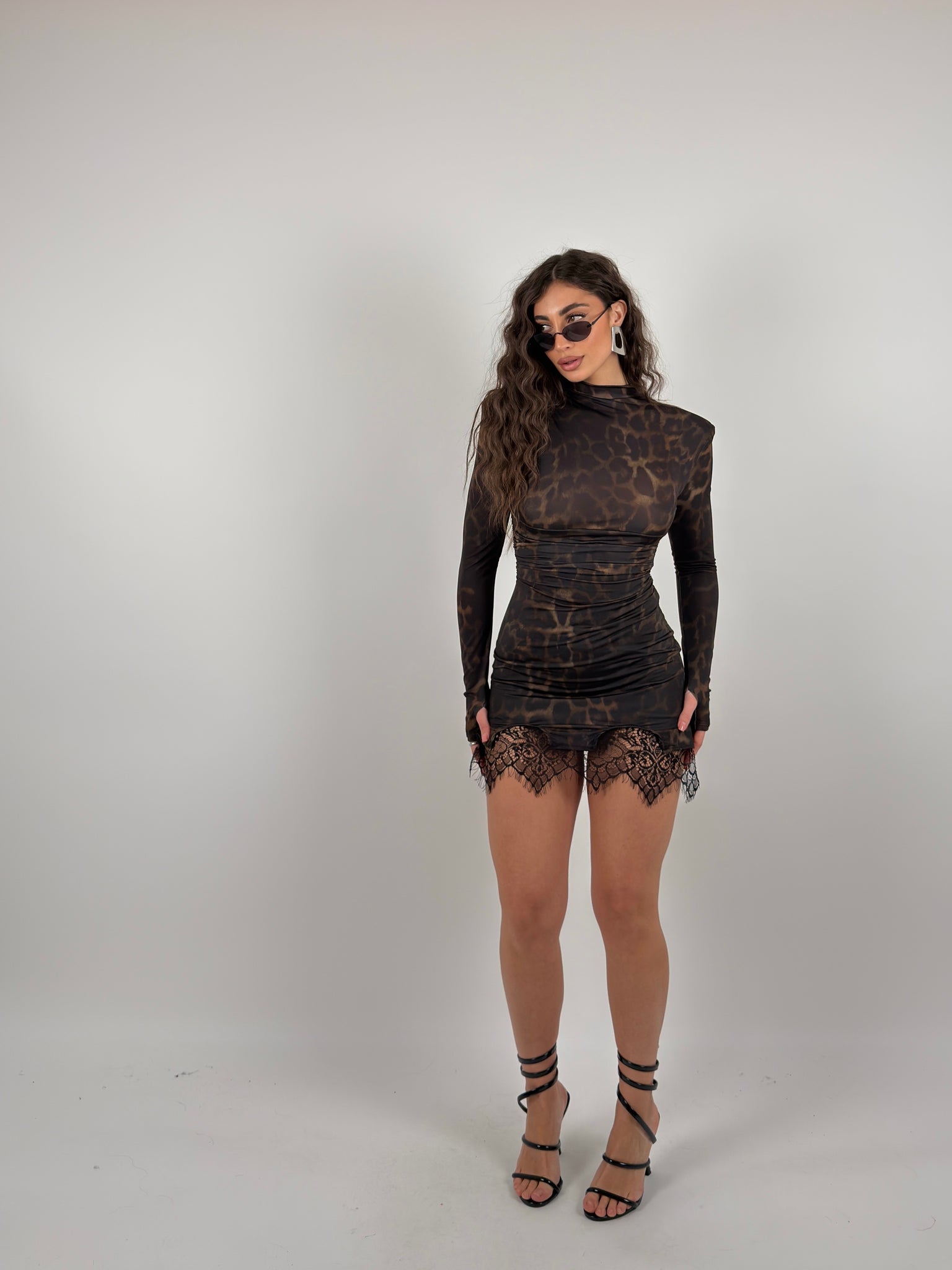 Vestito di lycra con colletto e spalline preformate, arricciato in vita, merletto sul finale.