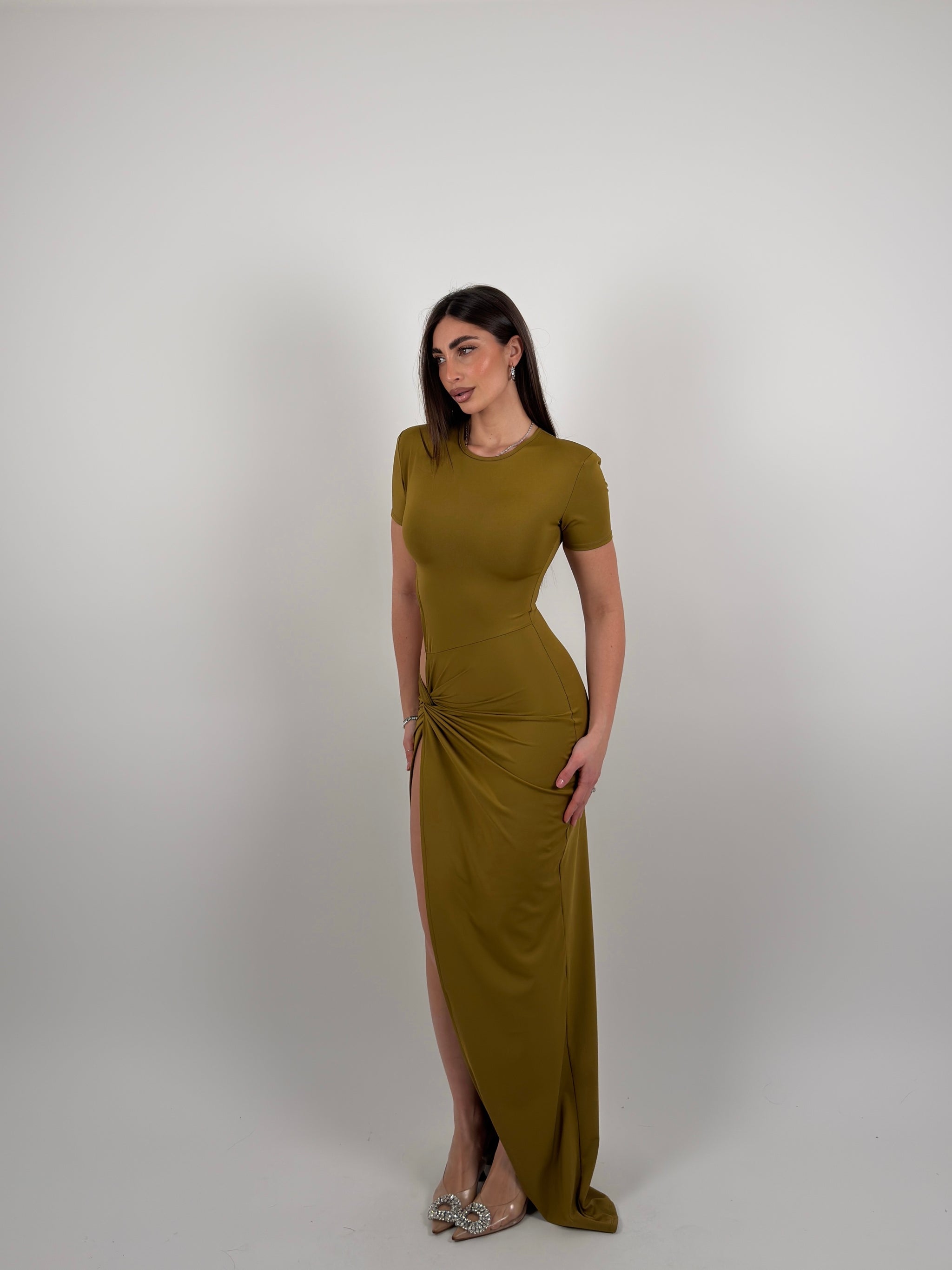 Vestito lungo di lycra, girocollo e manica corta, intreccio laterale con spacco.