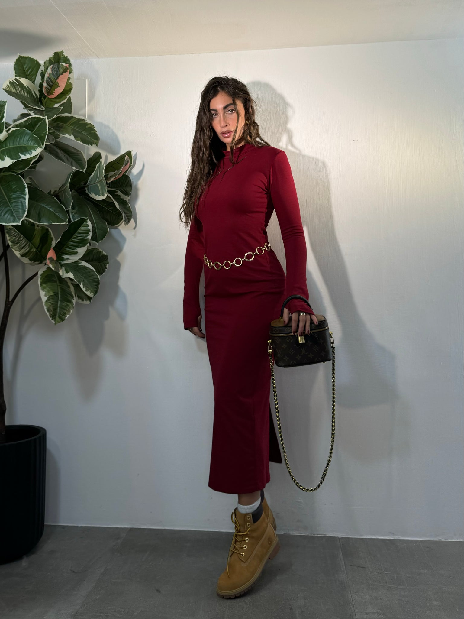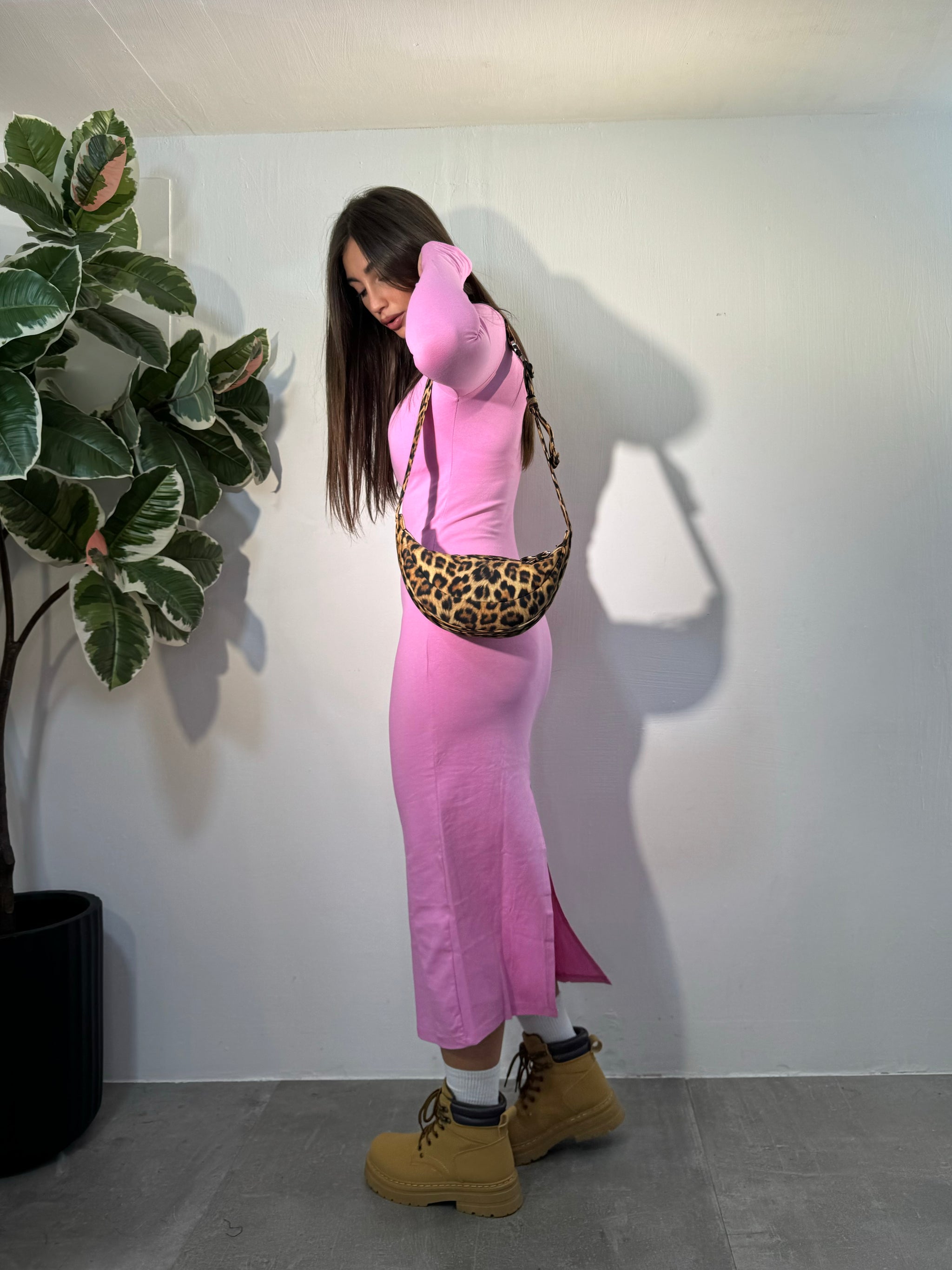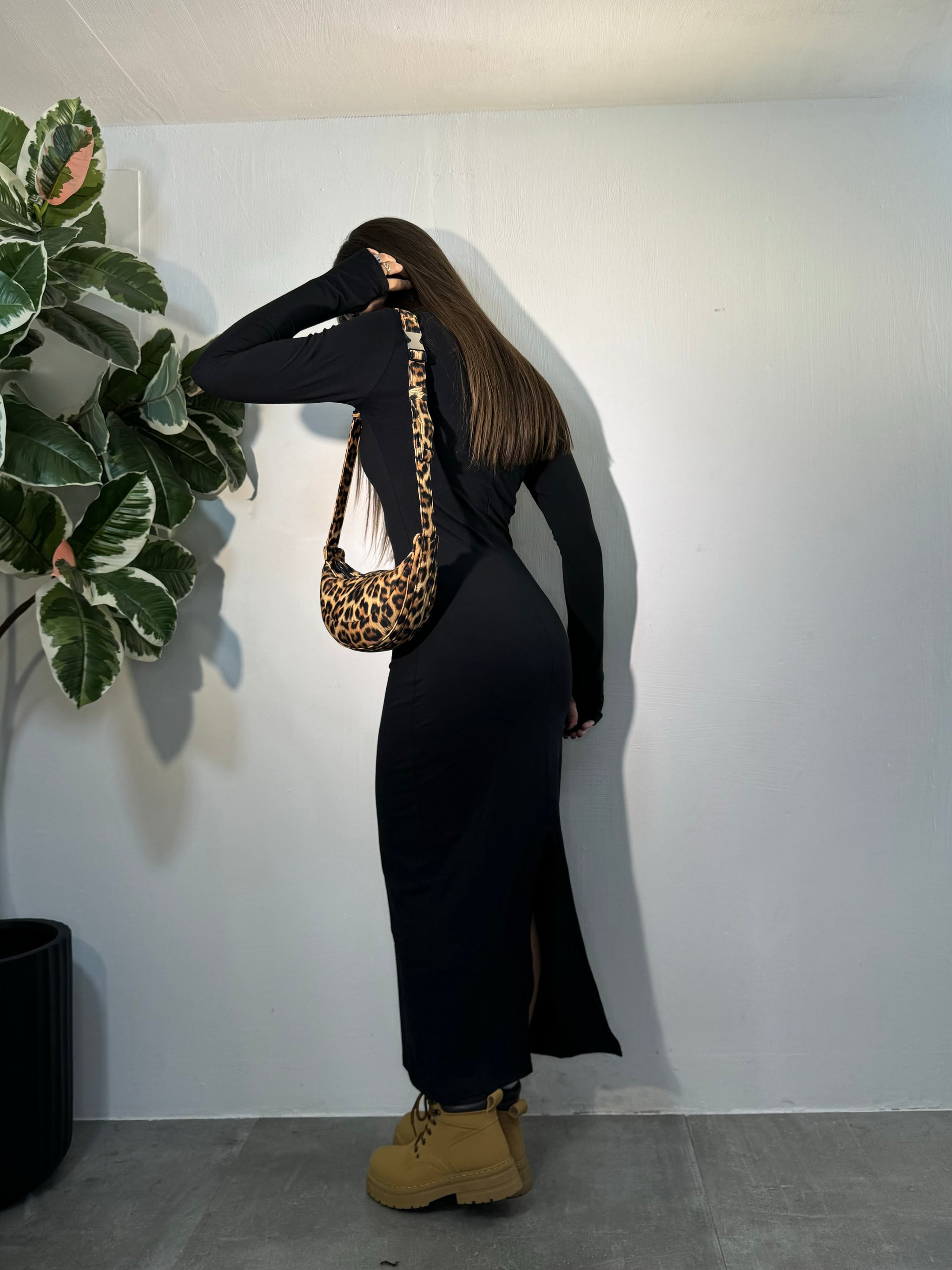 Vestito lungo di cotone, mezzo collo, manica lunga, spacco sul retro.