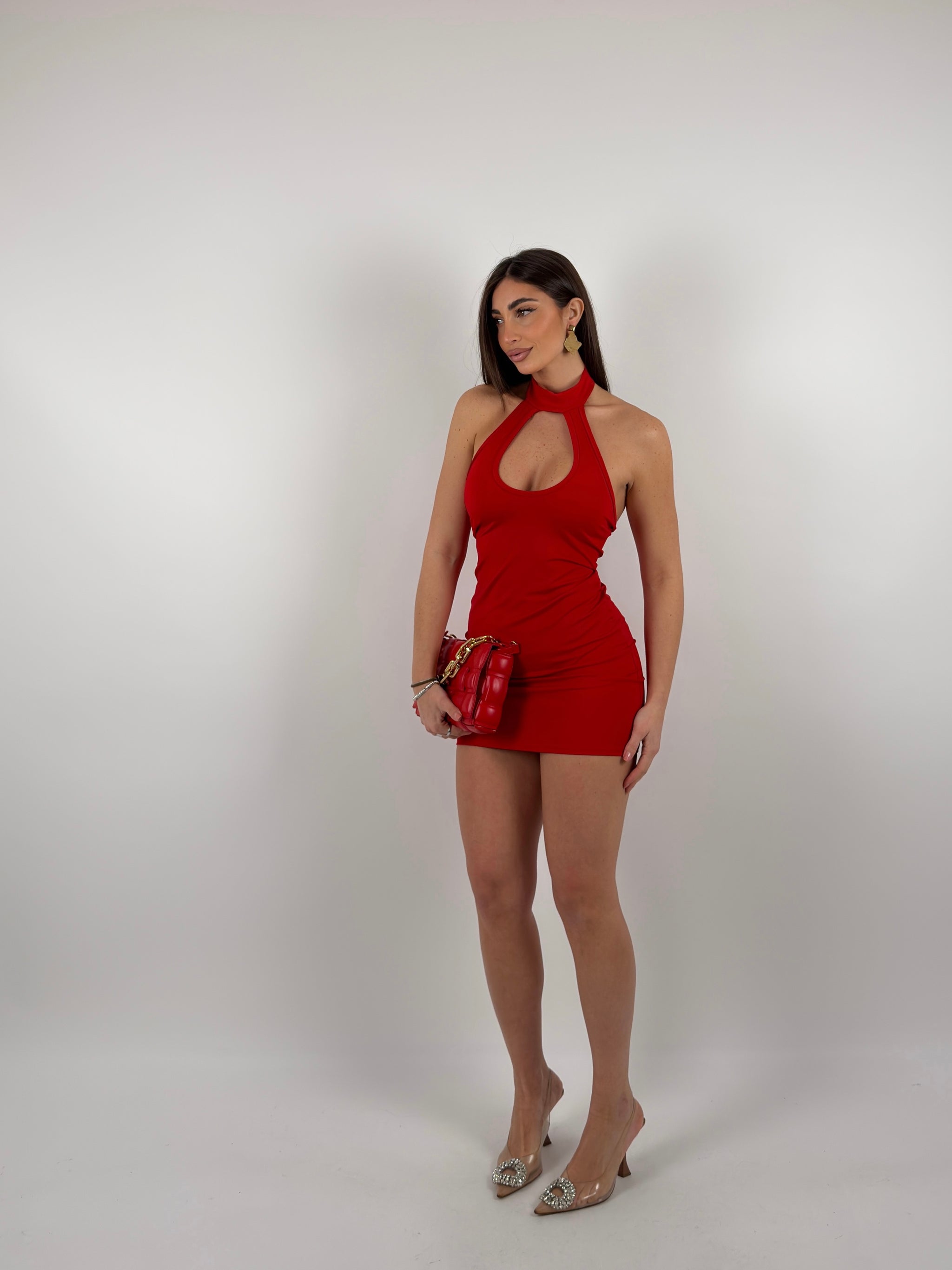 Vestito in lycra aperto sul davanti con colletto, scollato sul retro.