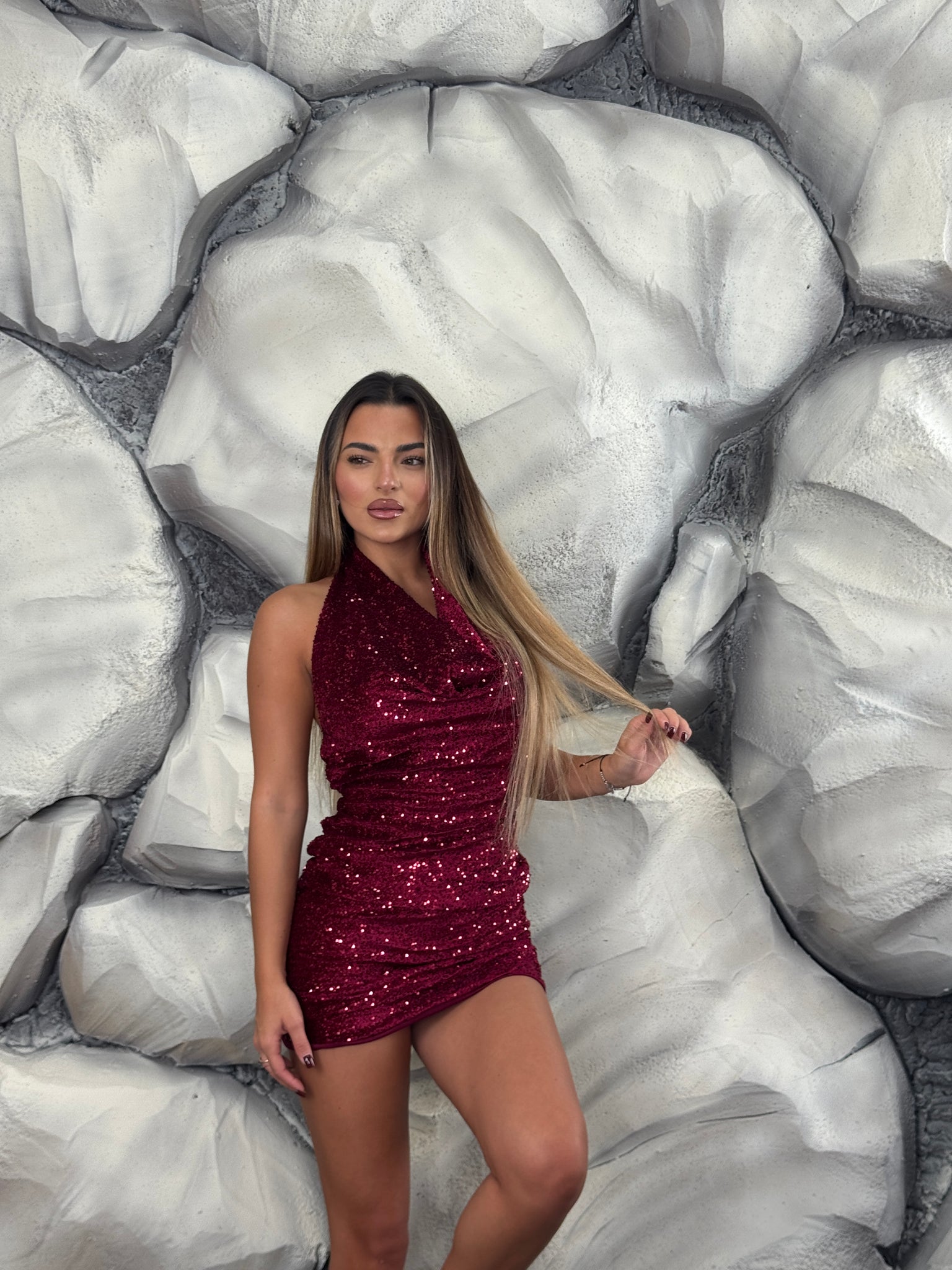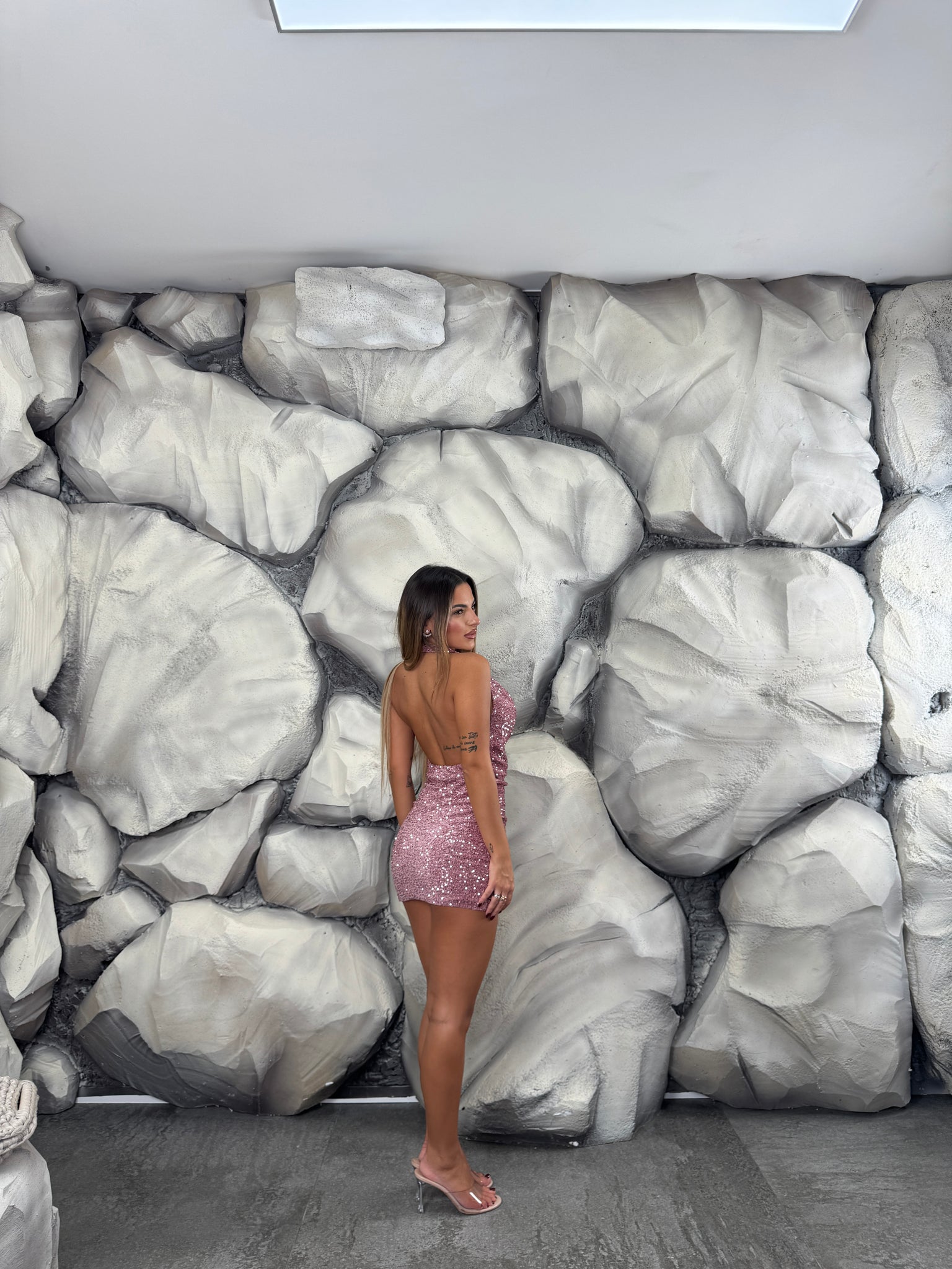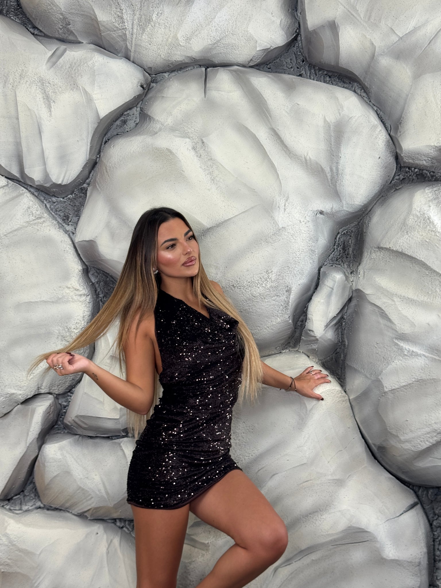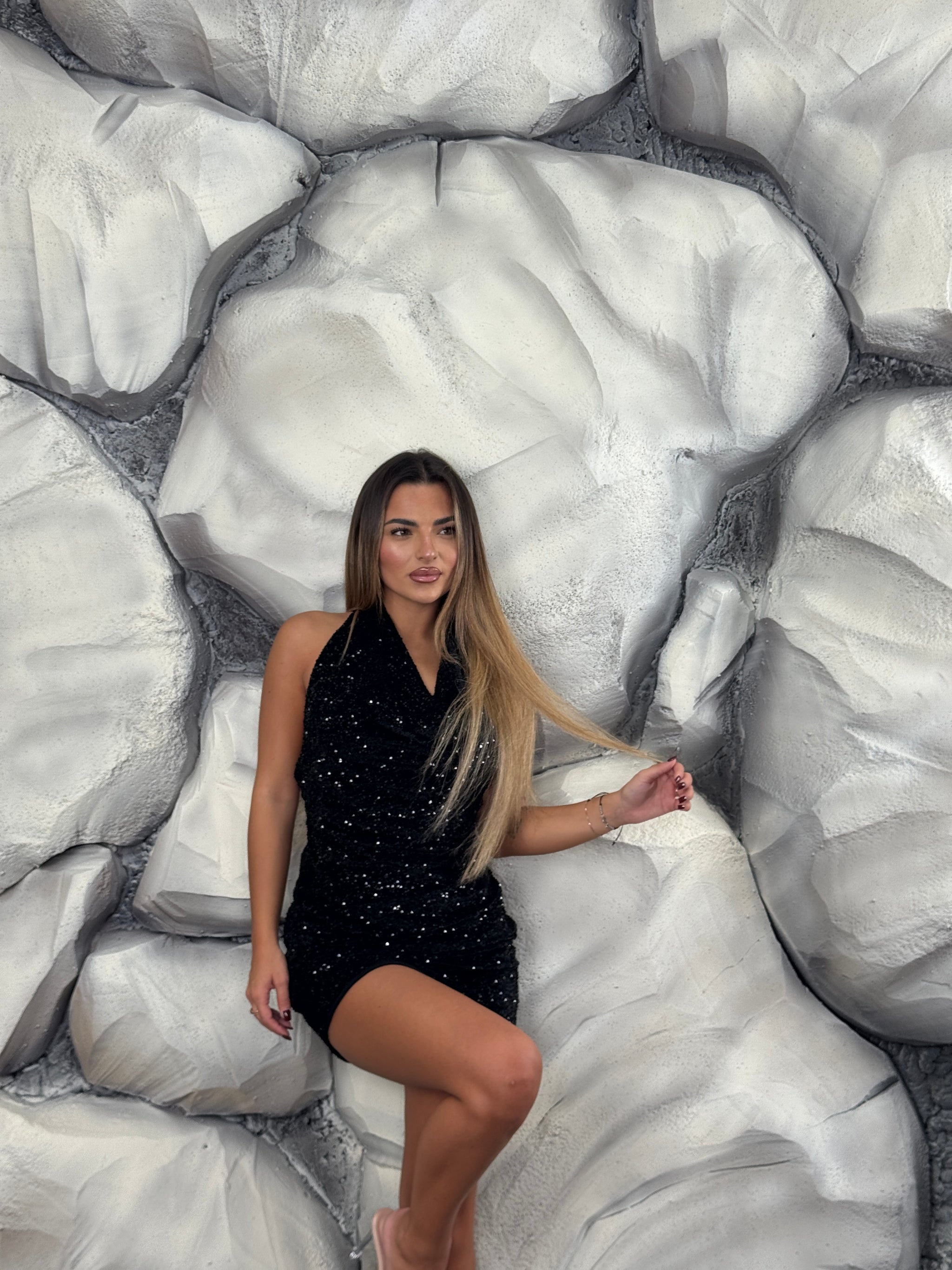 Vestito completamente paillettes, scollo morbido e aperto sul retro.