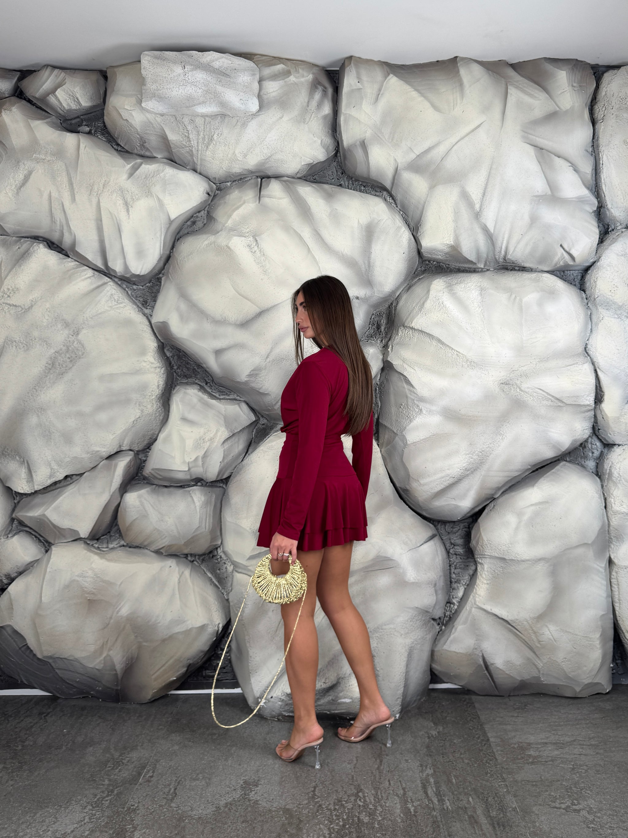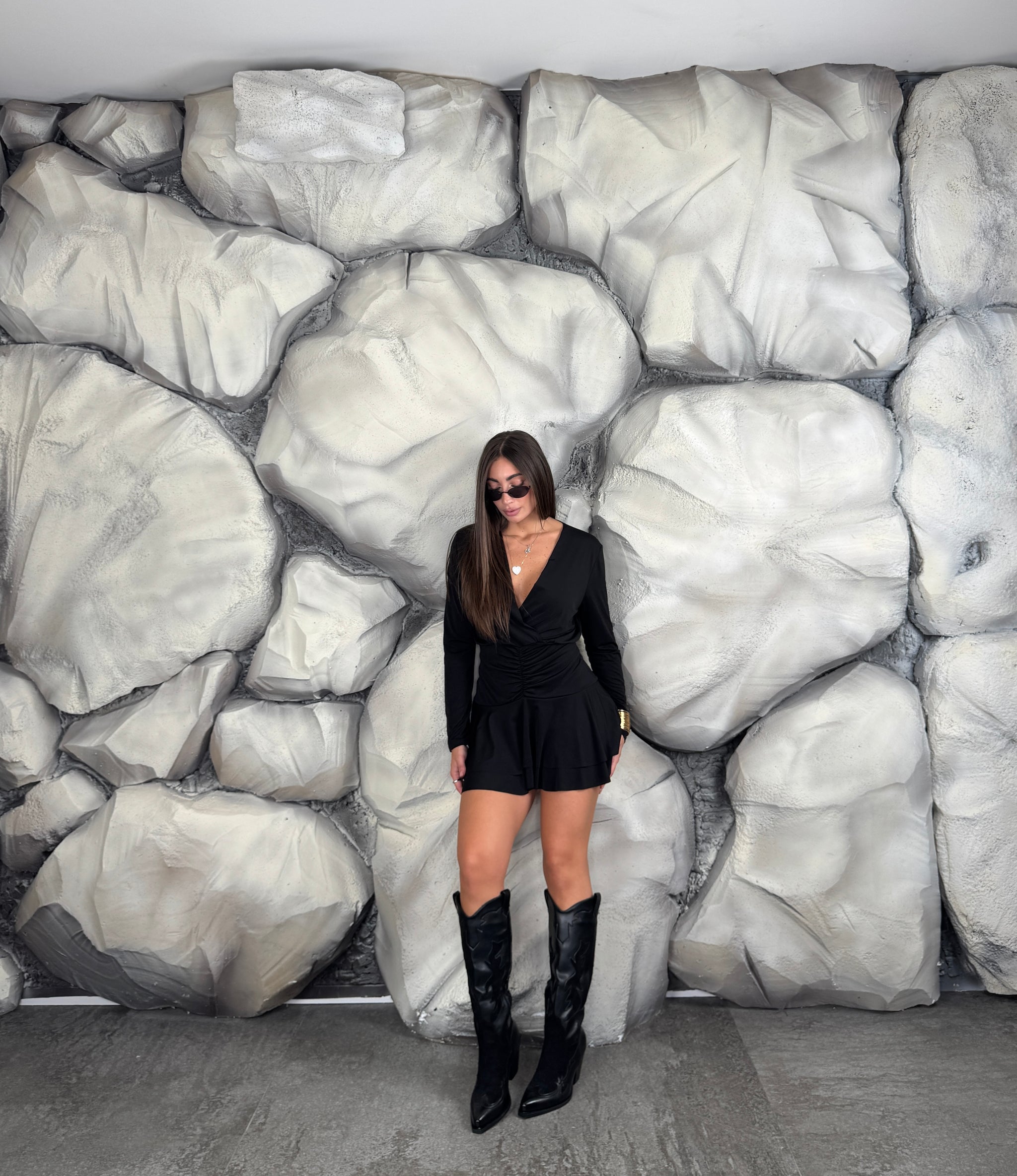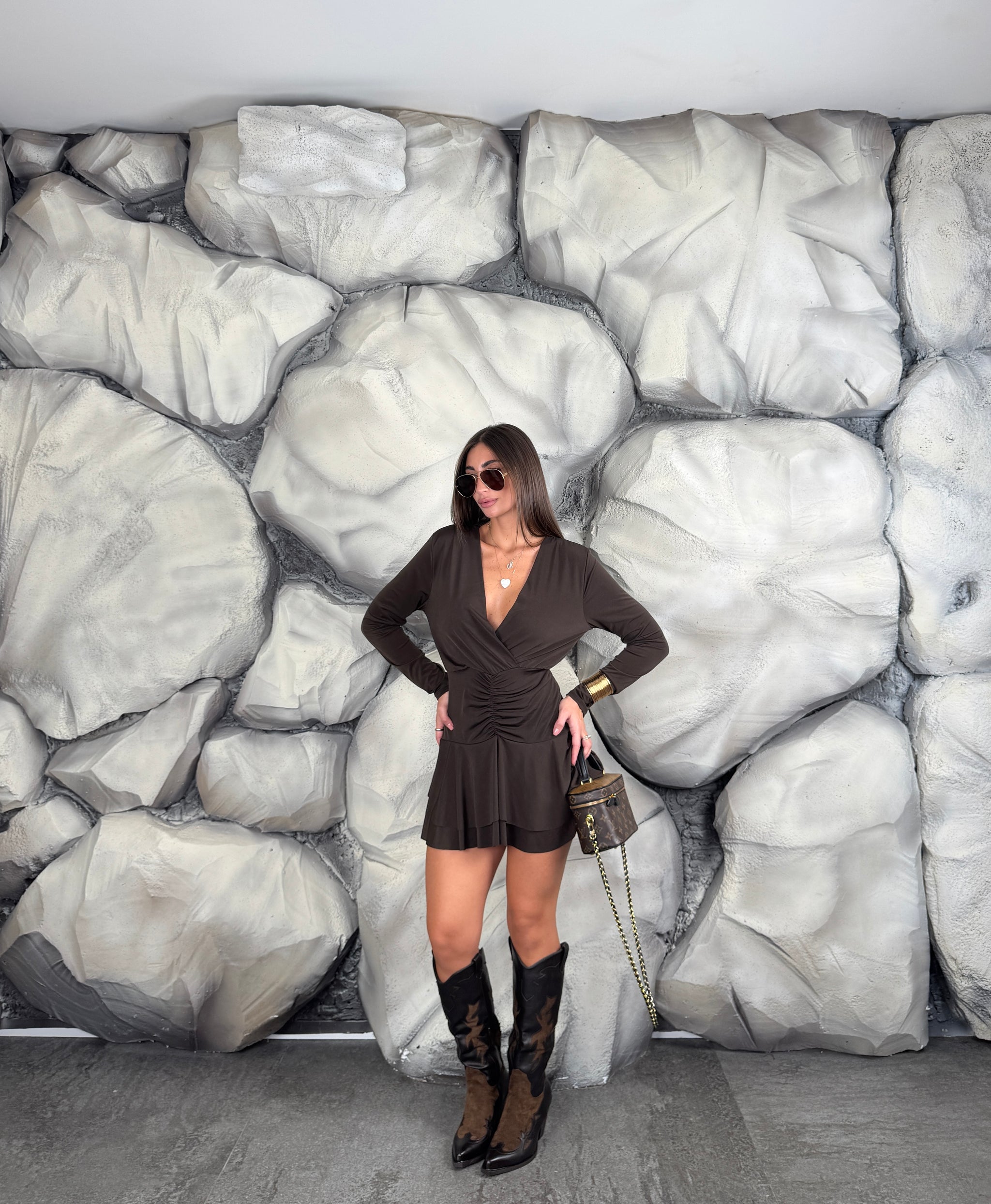 Vestito in lycra, scollo a “V”, manica lunga, arricciato sul davanti.