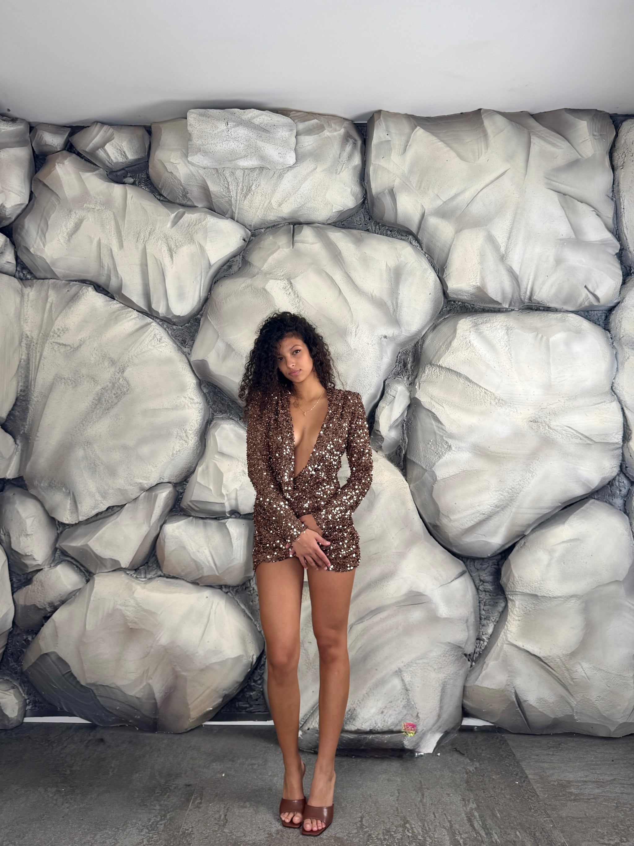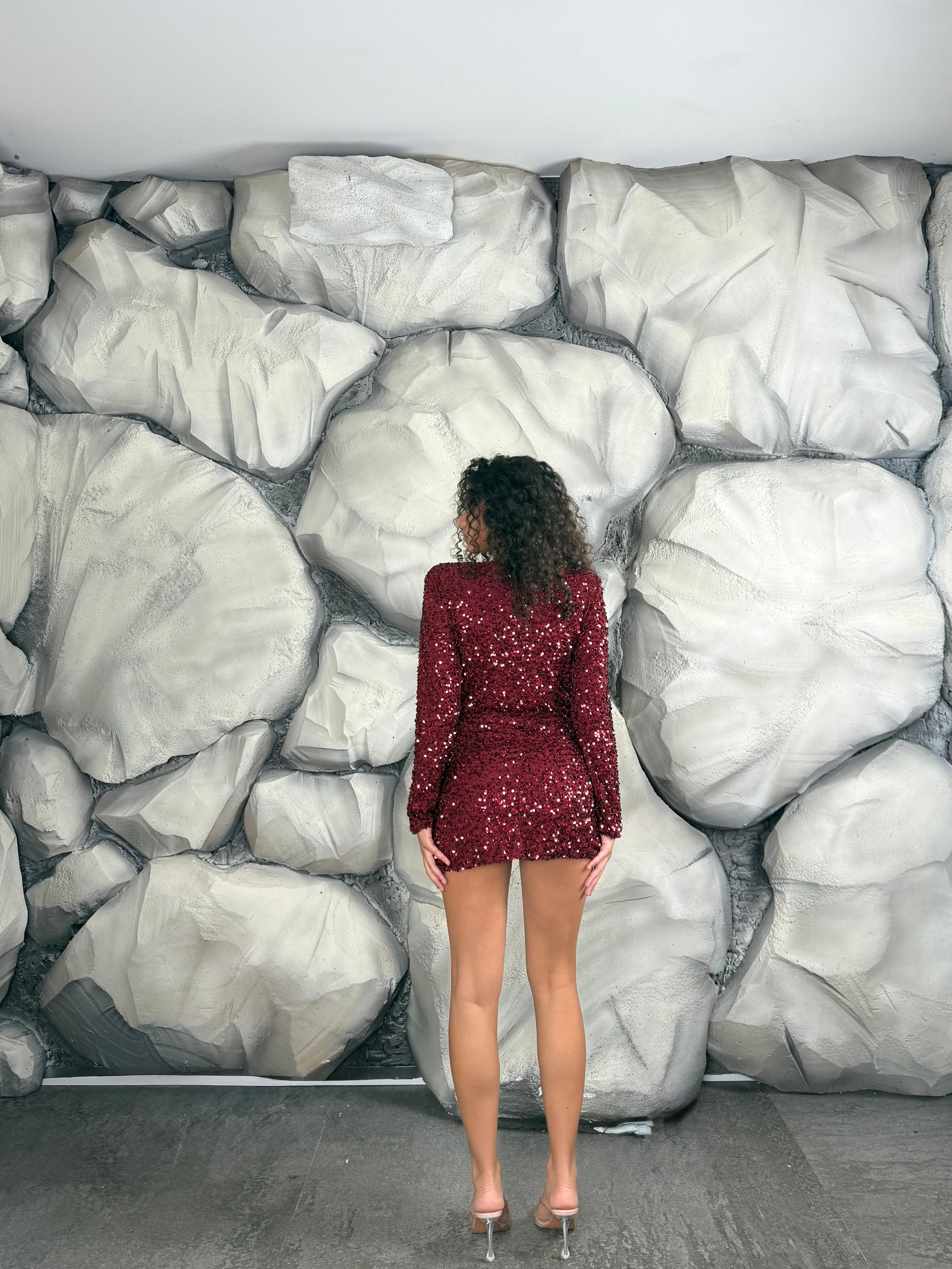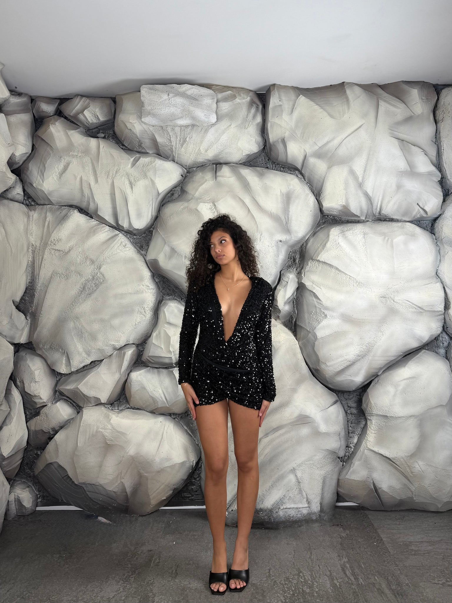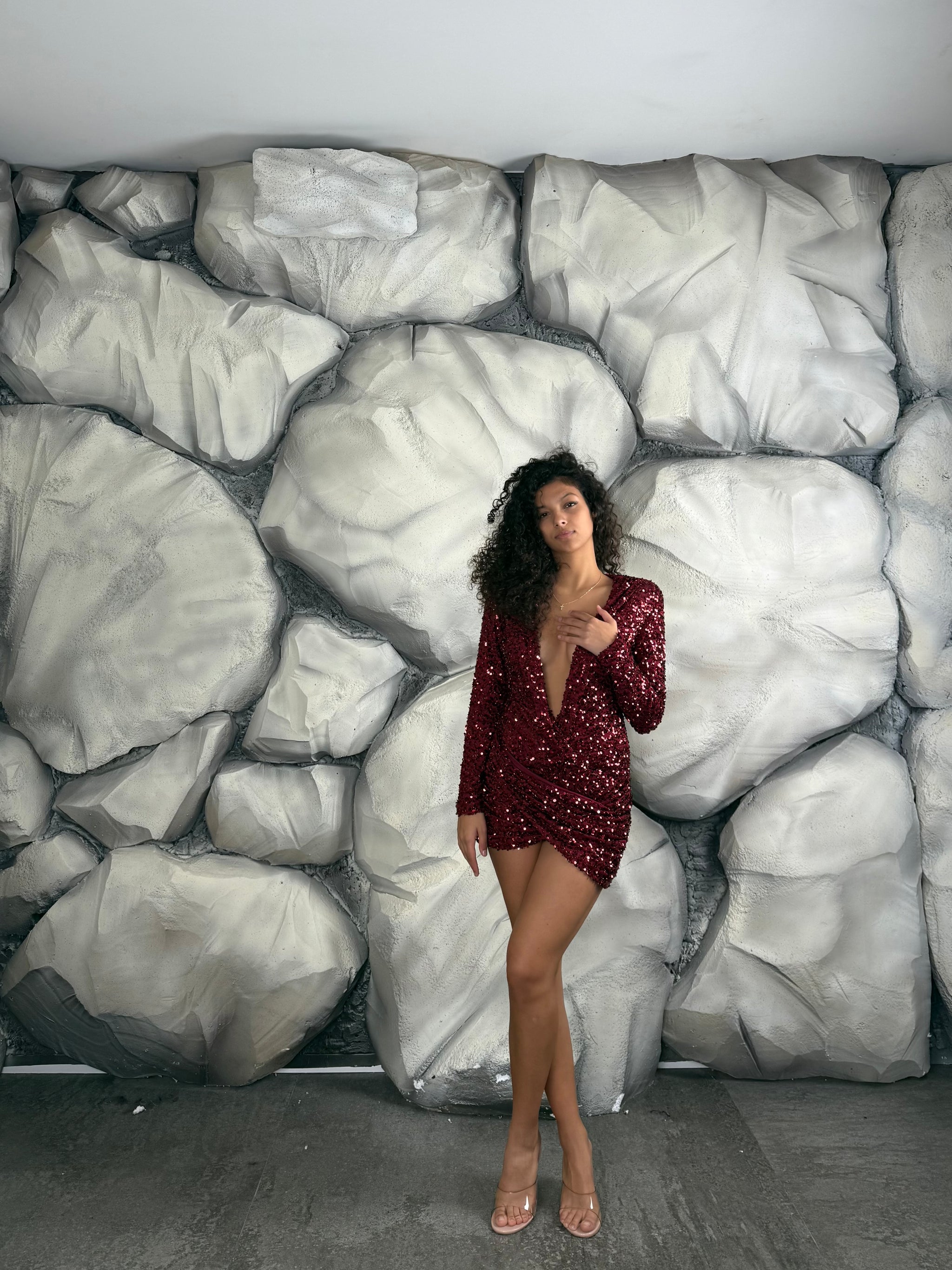 Vestito completamente ricoperto di paillettes, scollo a “V” profondo, inserito sul davanti e manica lunga.