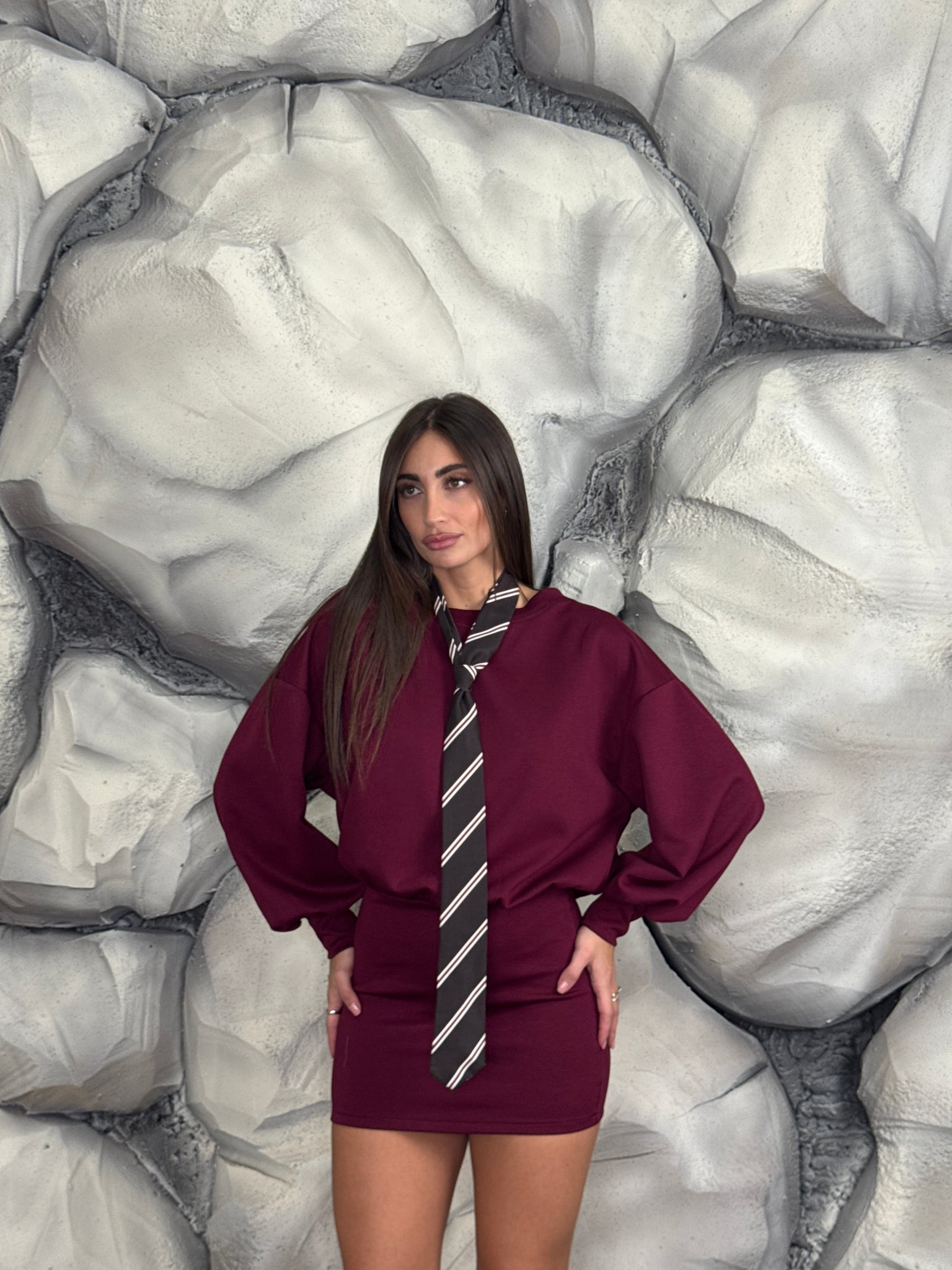 Vestito di felpa, girocollo e manica lunga, elastico in vita che crea un effetto ballon, cravatta annessa.