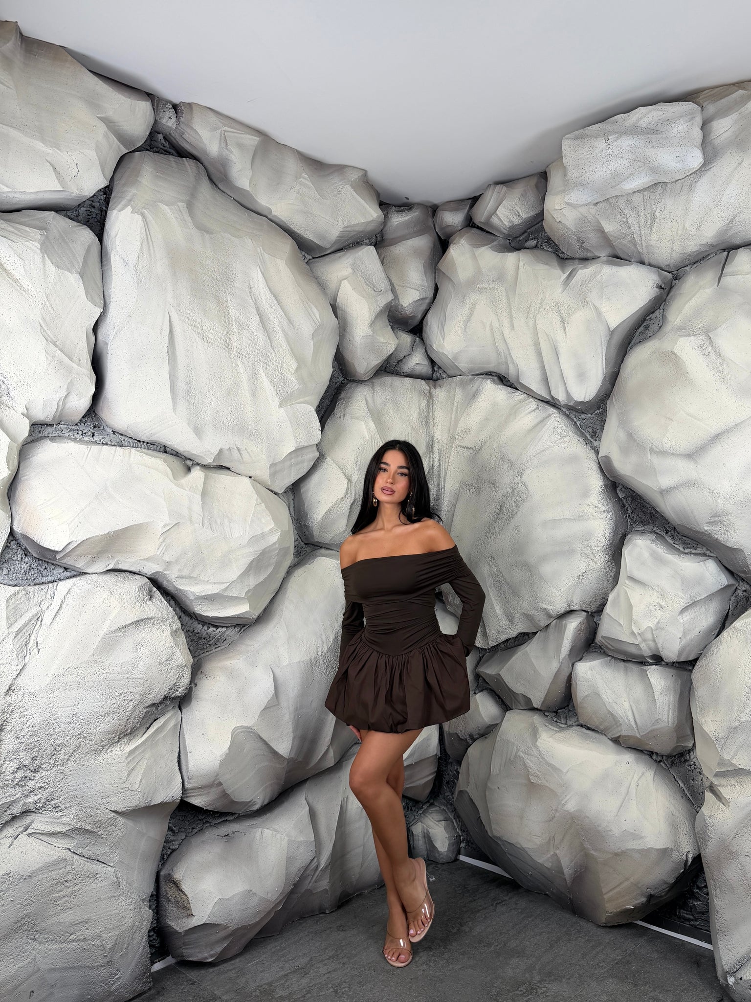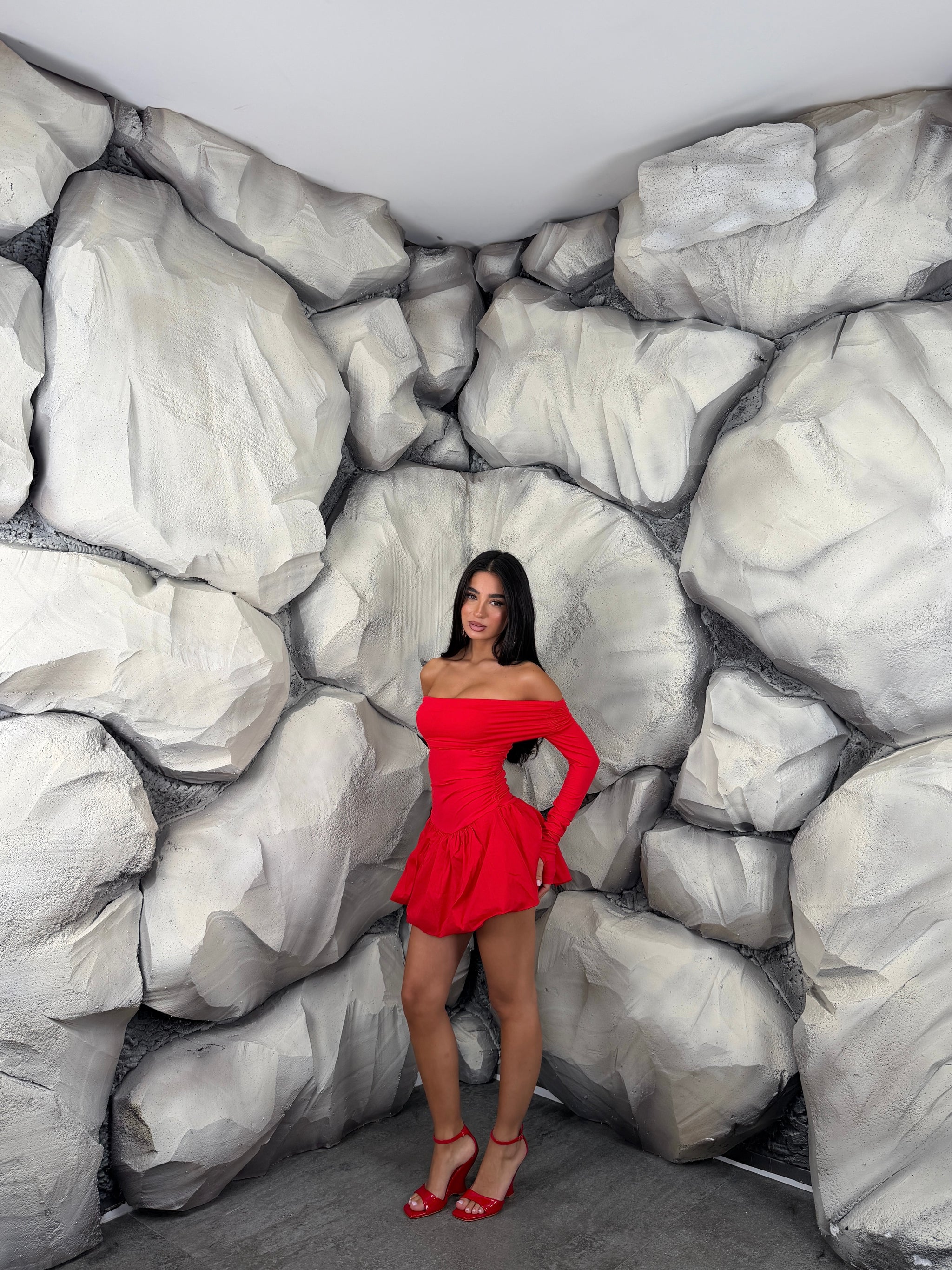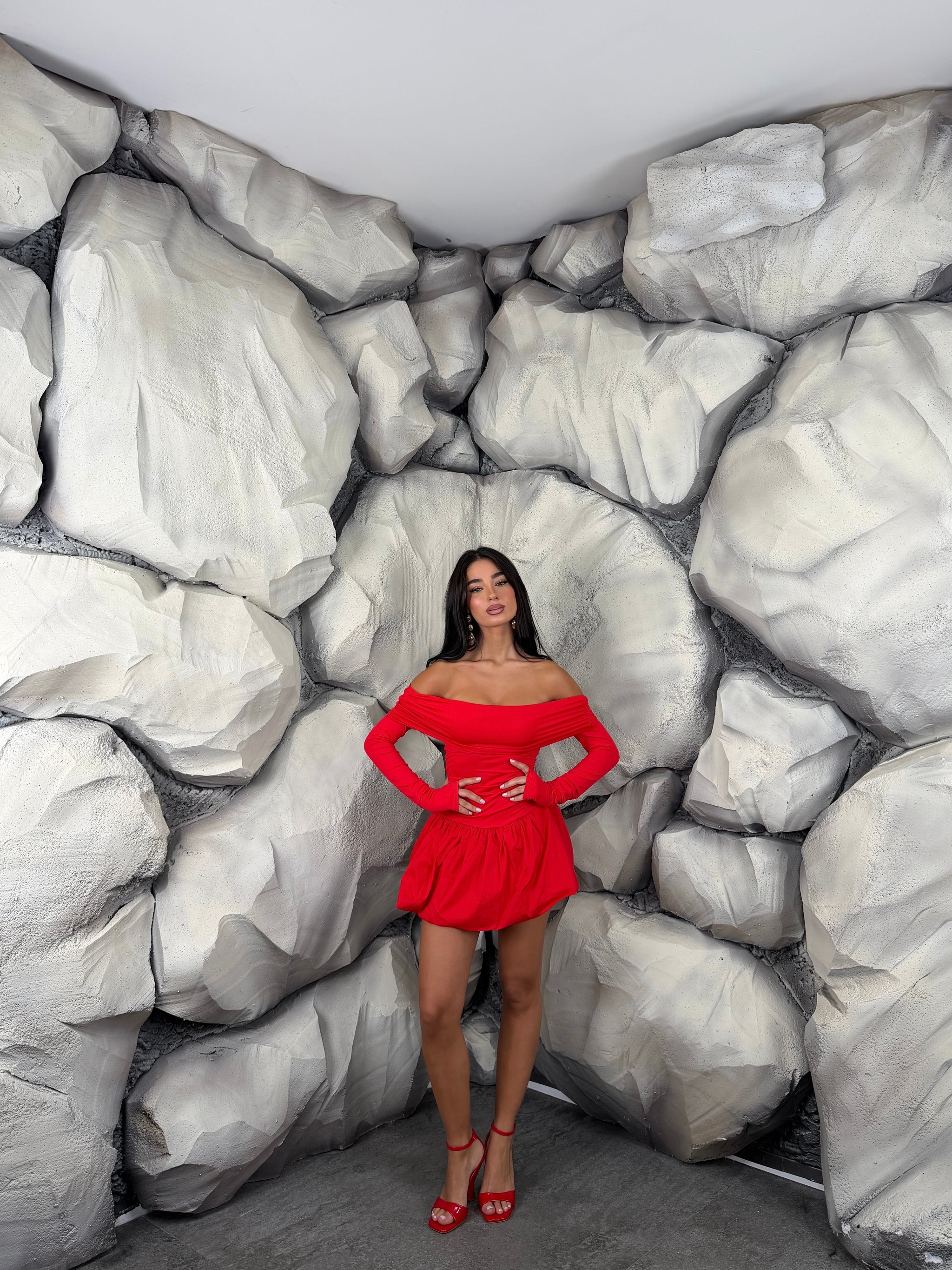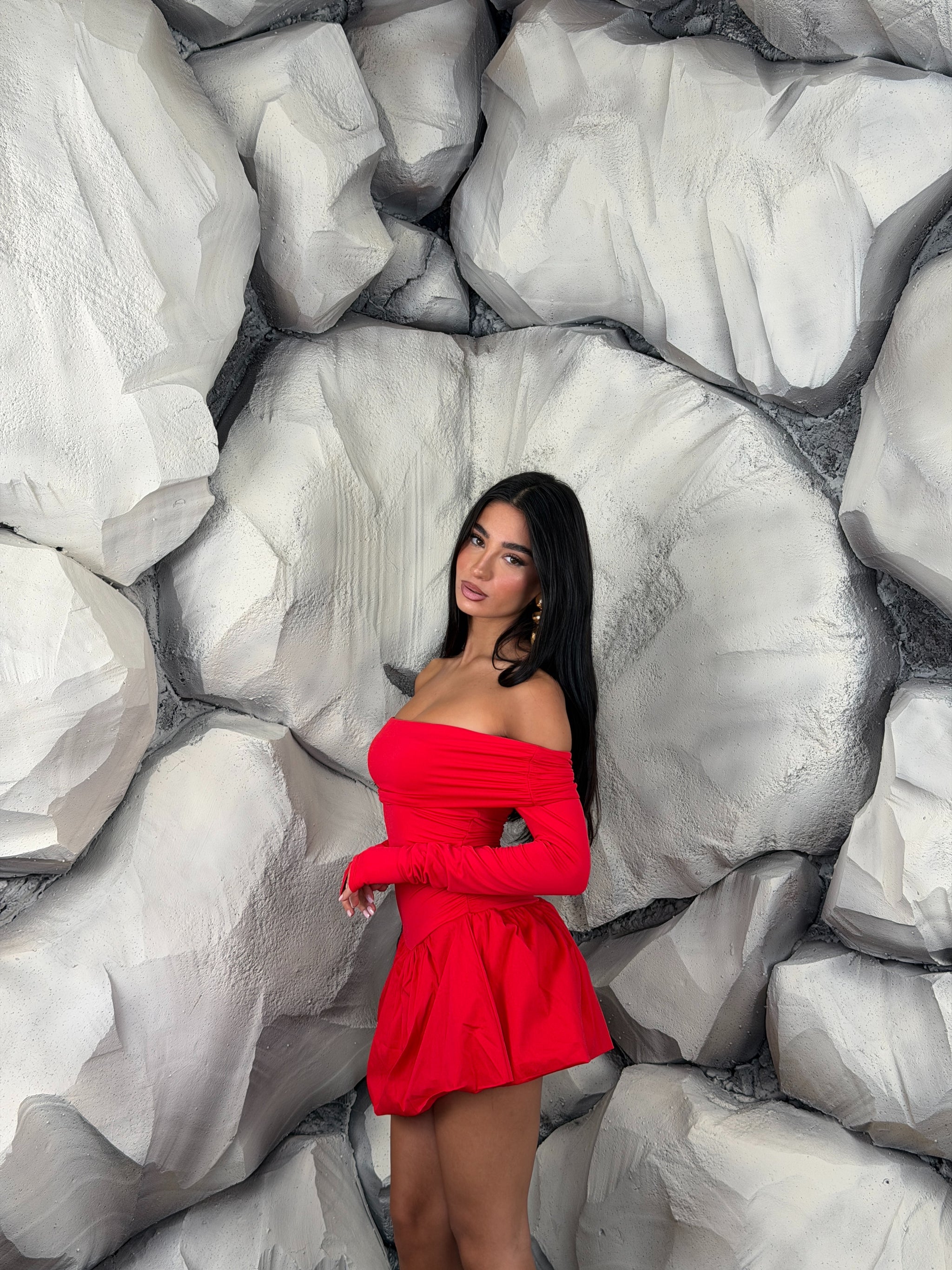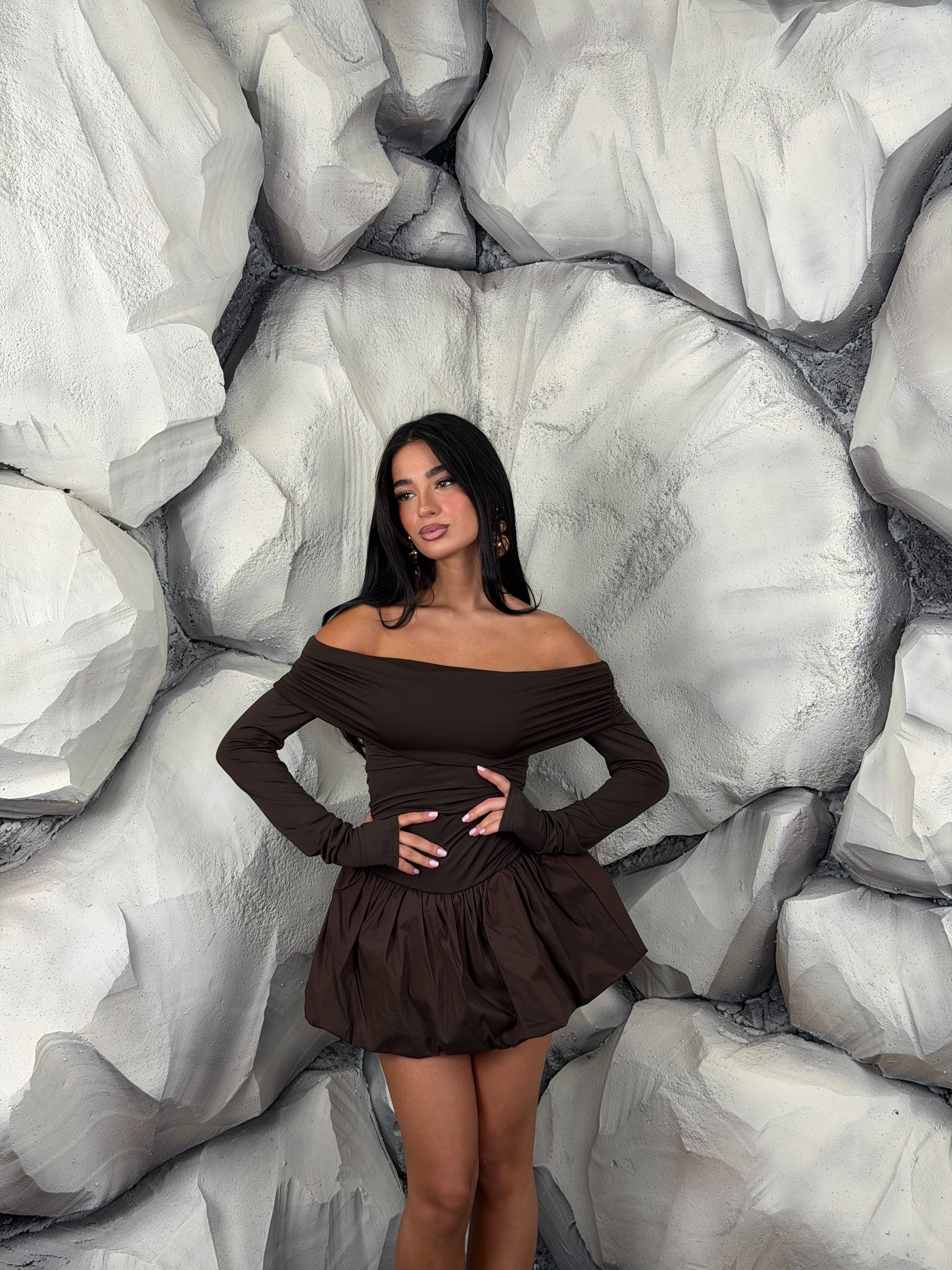 Vestito scollo a barca, gonnellina modello ballon, tessuto elastico e modellante