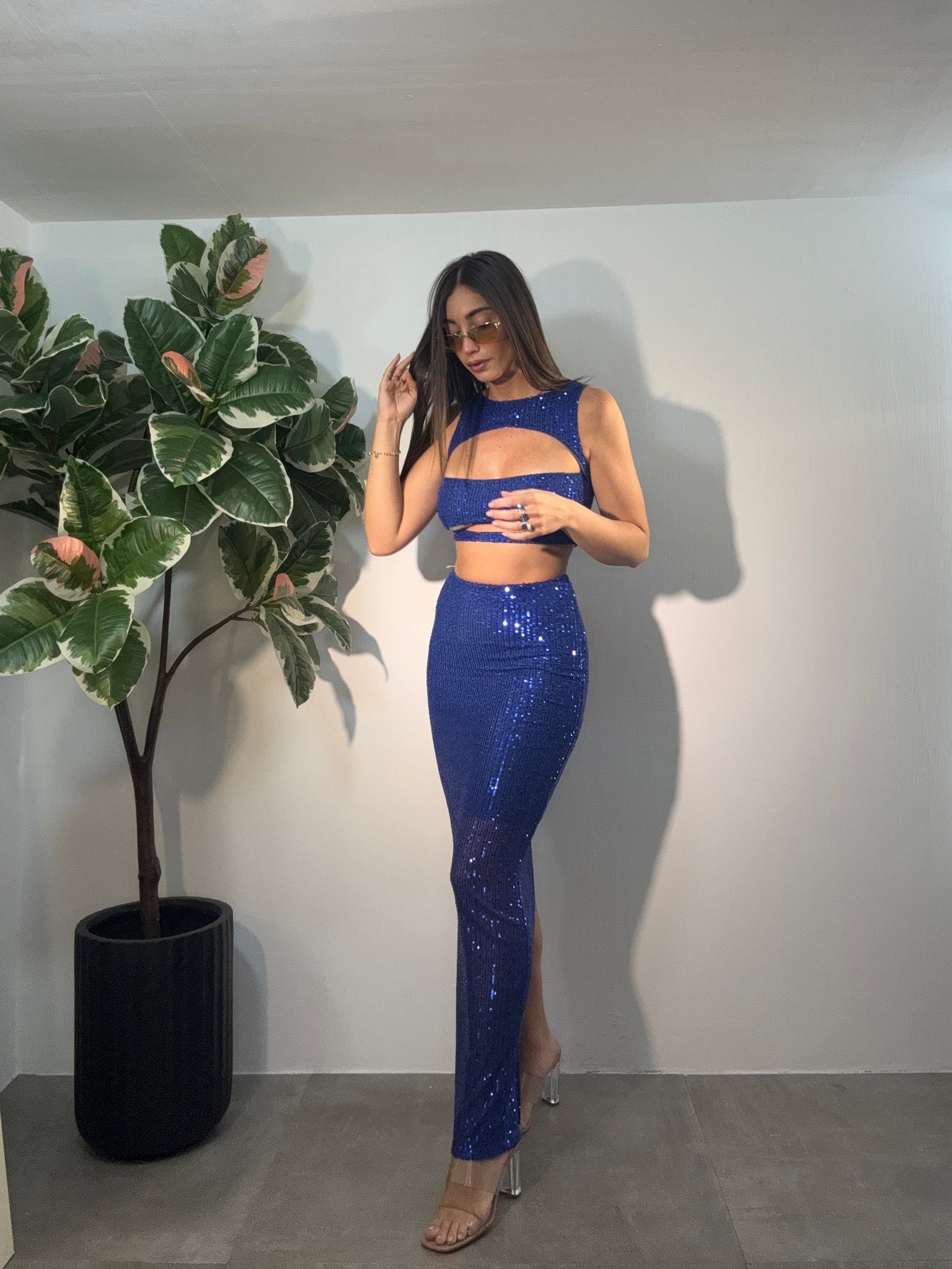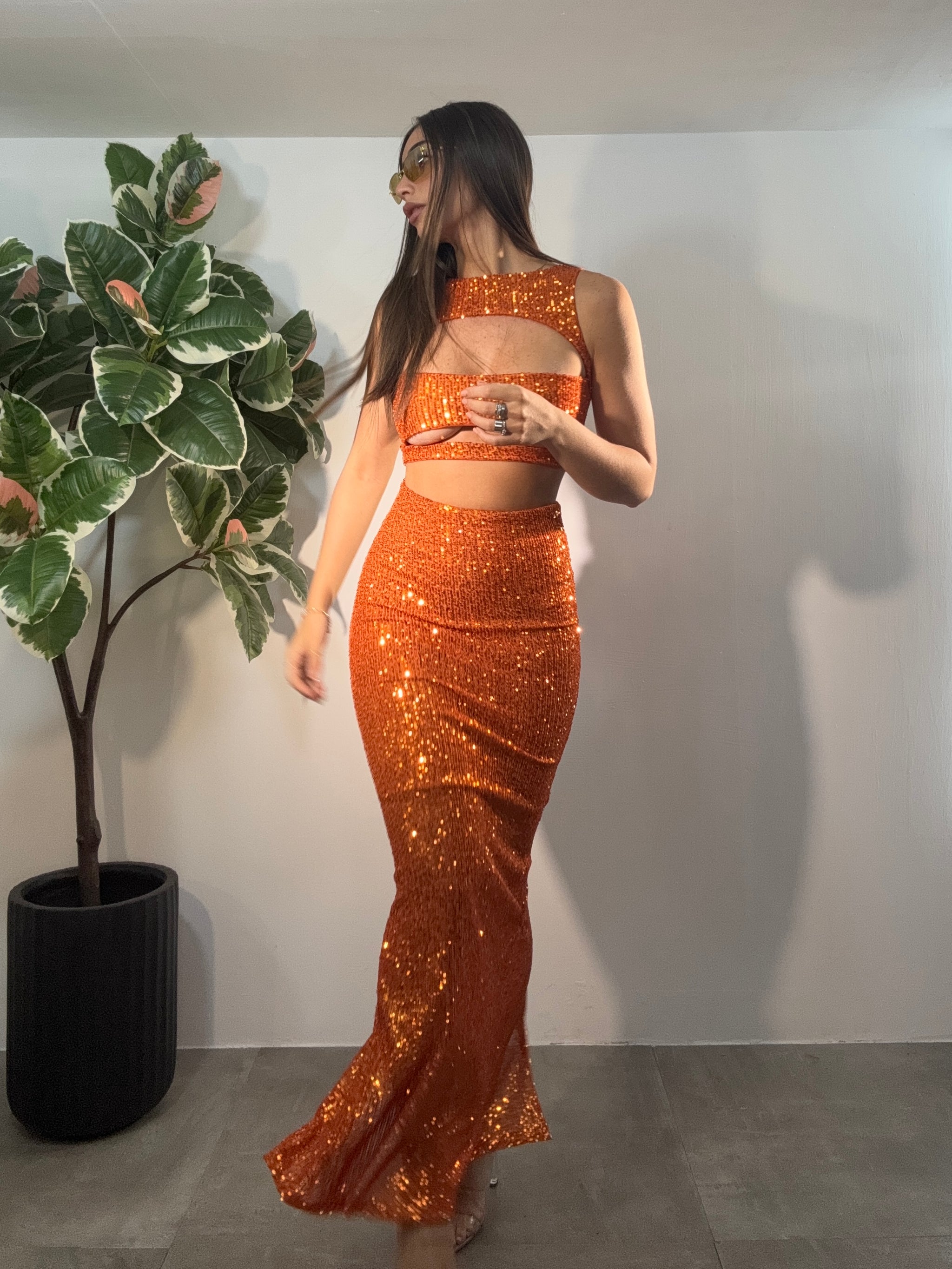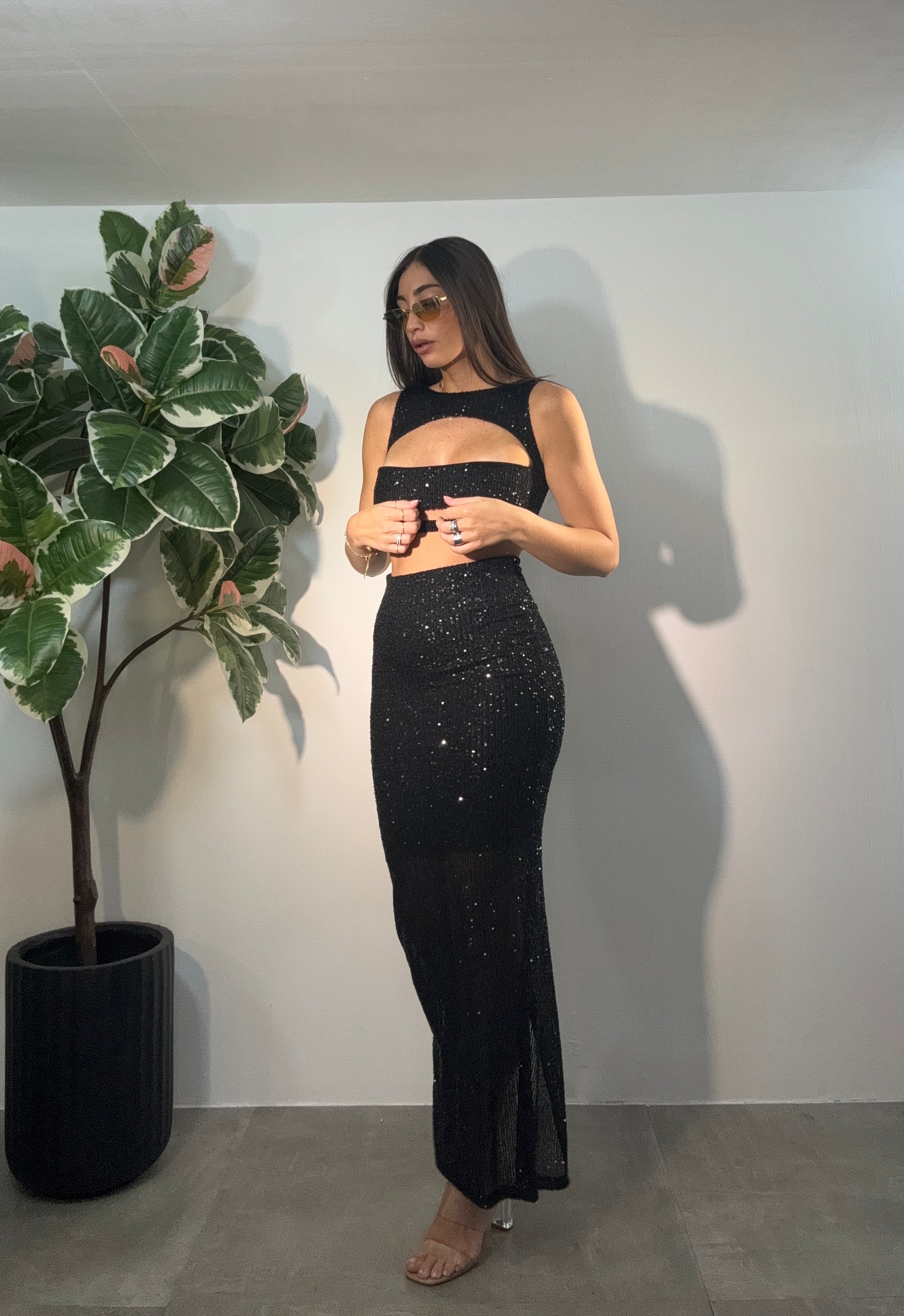 Vestito lungo in paiettes particolare, giro manica, con aperture